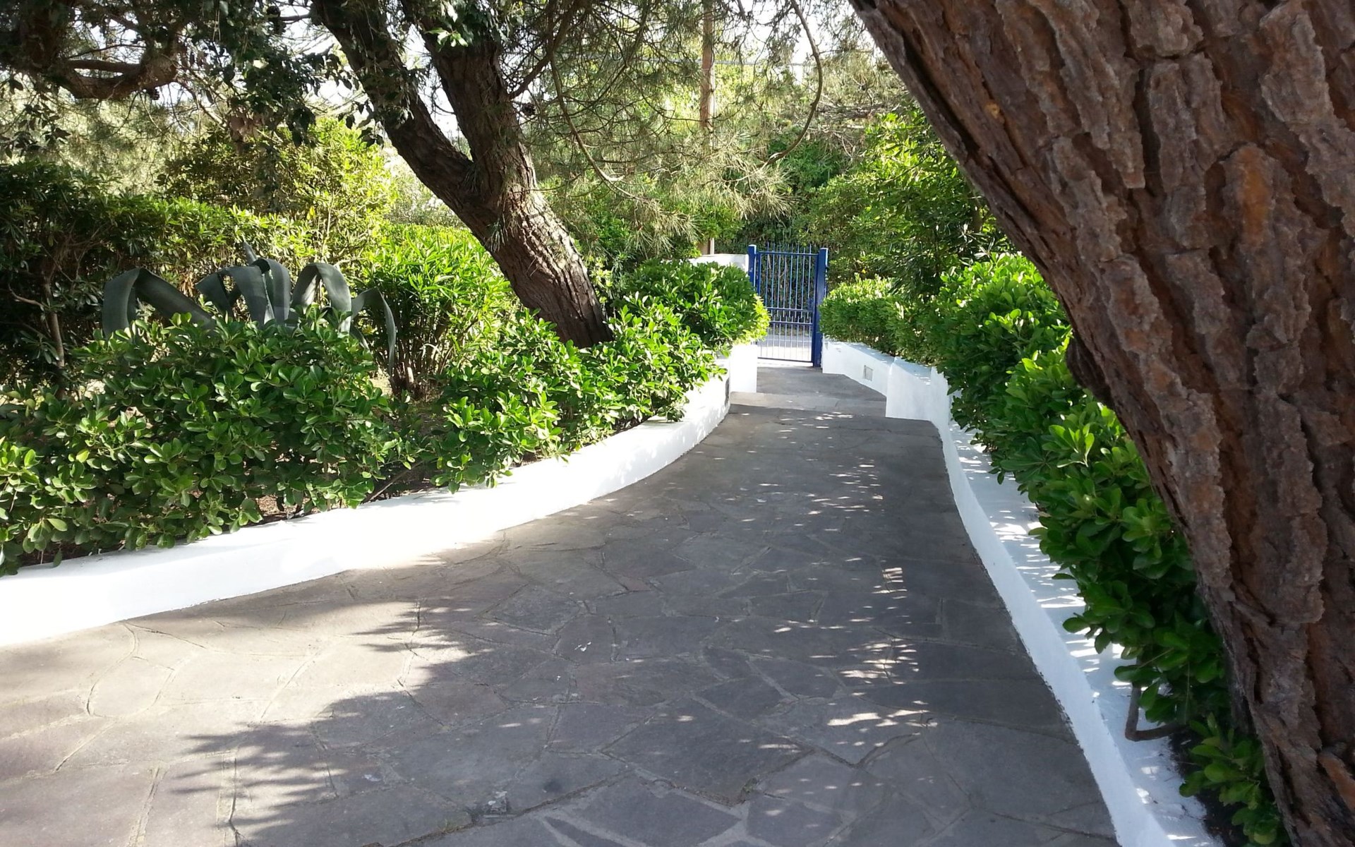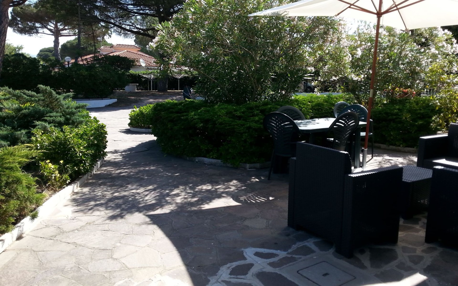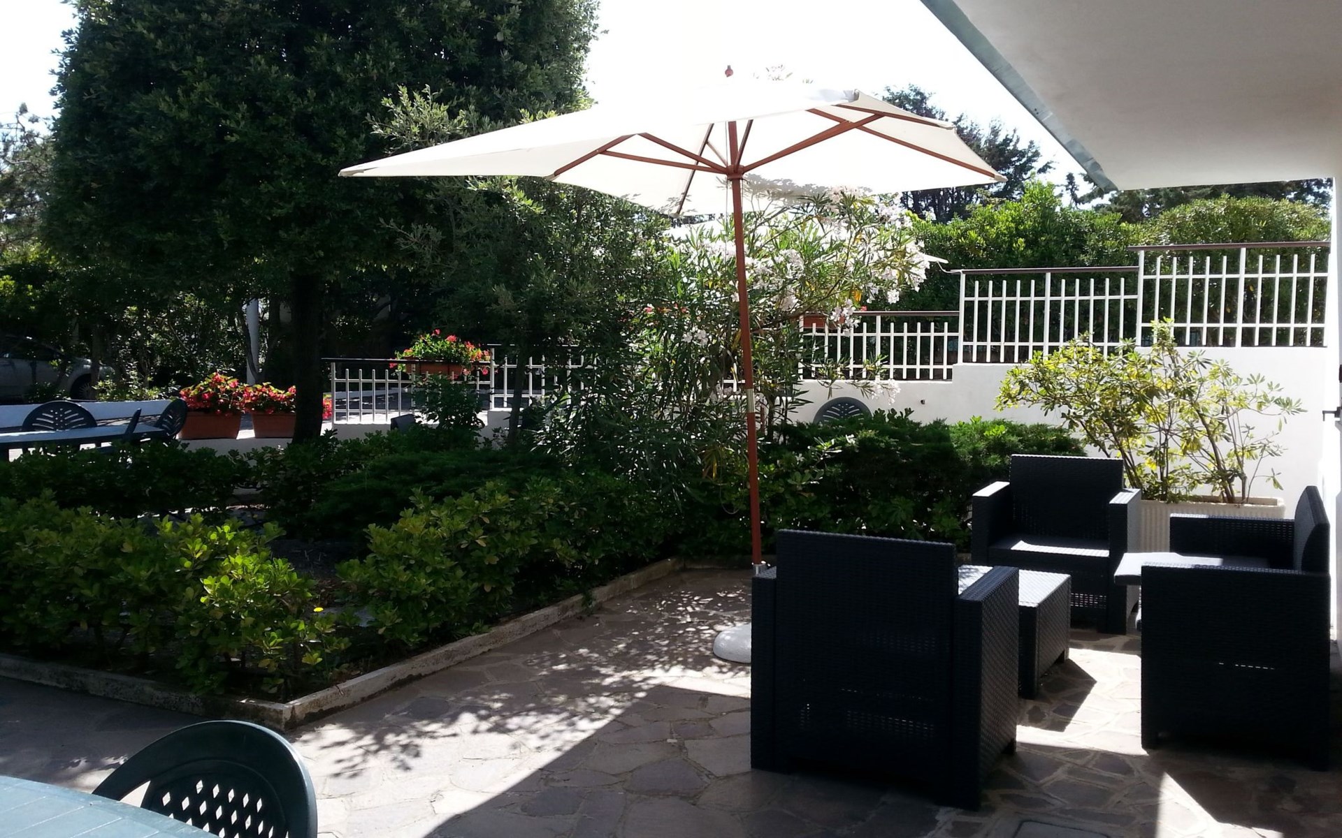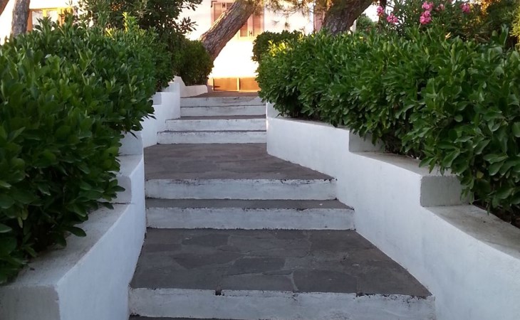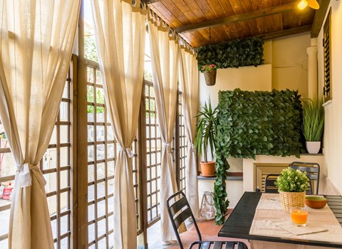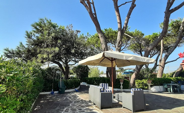 Outside, Apartment Azzurro opens onto a delightful private garden corner, providing the ideal space for relaxing moments or al fresco meals. Equipped with a table and chairs and welcomed by a comfortable sitting area under an umbrella, this outdoor space is a real invitation to well-being, where the tranquillity of the surroundings promises relaxation and unwinding.