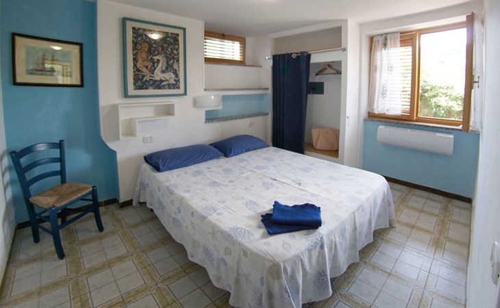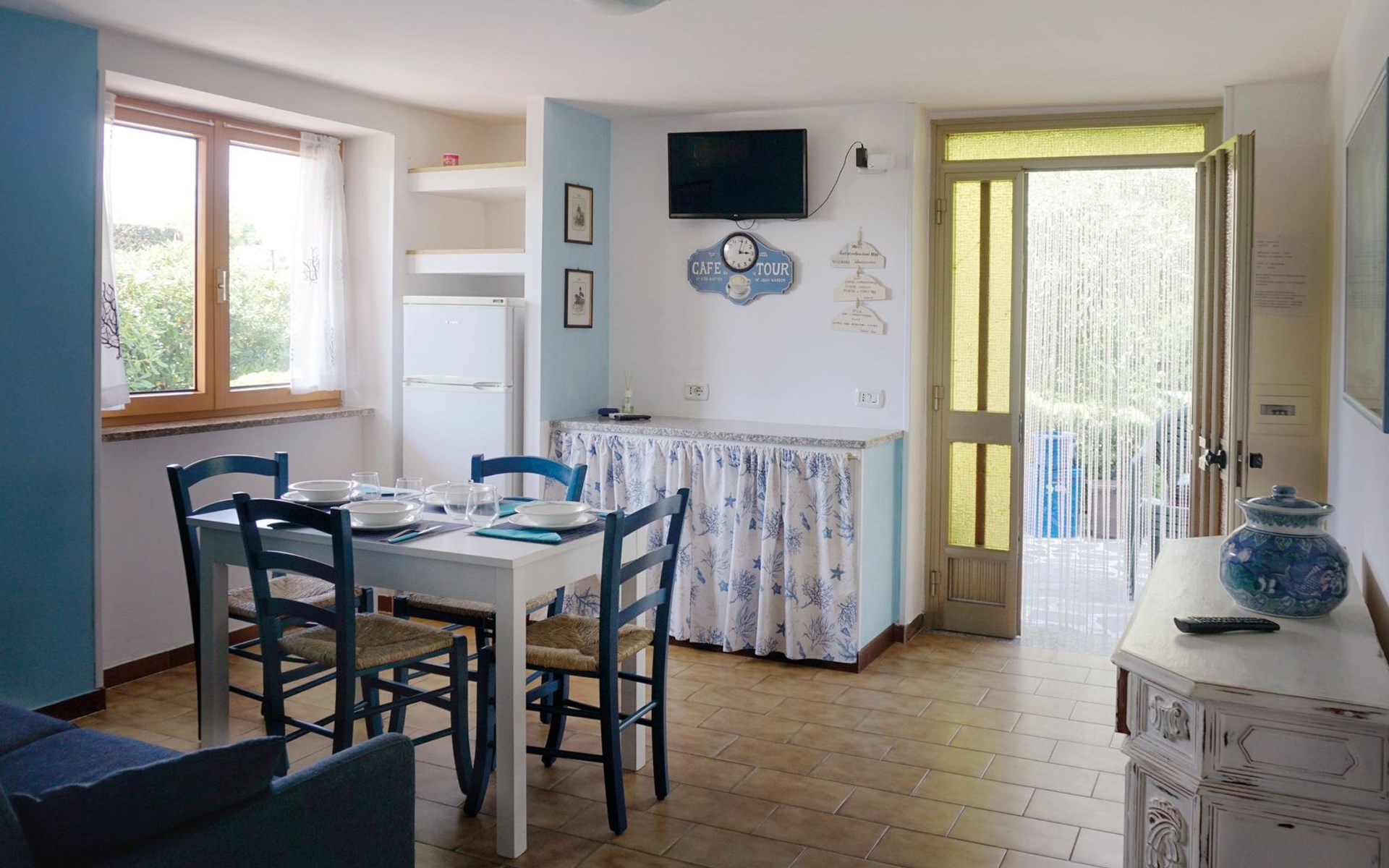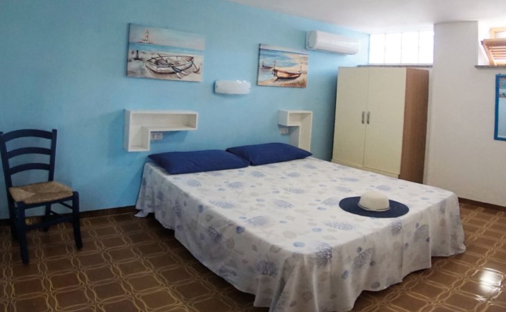 The interior of the Azzurro Apartment, with its 60 square metres of well-organised space, is designed to offer maximum comfort and a warm welcoming feeling. The two bedrooms, both furnished with double beds, promise rest and privacy; the living room, equipped with a flat-screen TV and sofa bed, is perfect for accommodating additional guests. You will also find a dining area with an elegant white table and blue chairs, as well as a fully equipped kitchen that invites you to try out local recipes. The bathroom is complete with shower, bidet and washing machine, ensuring convenience and comfort throughout your stay.
