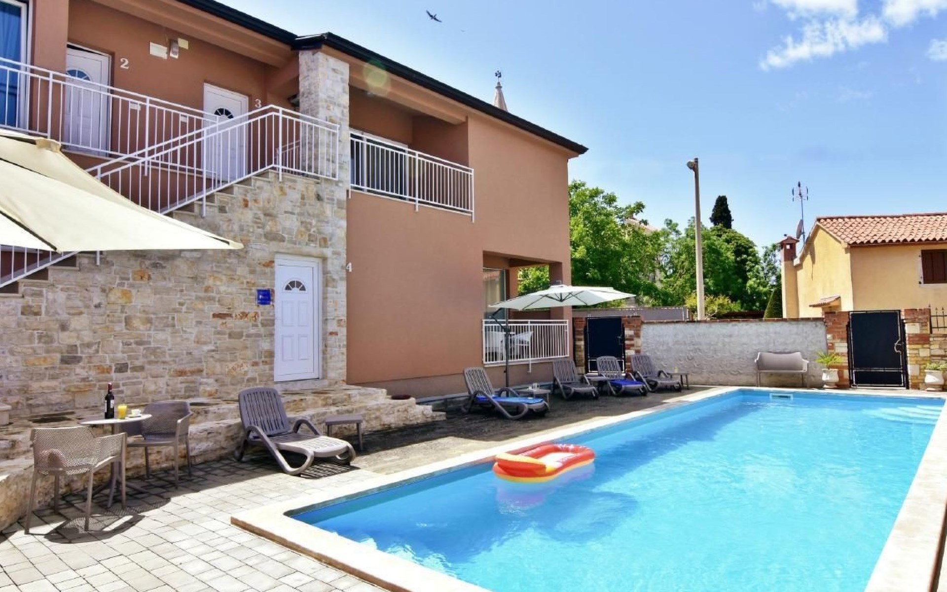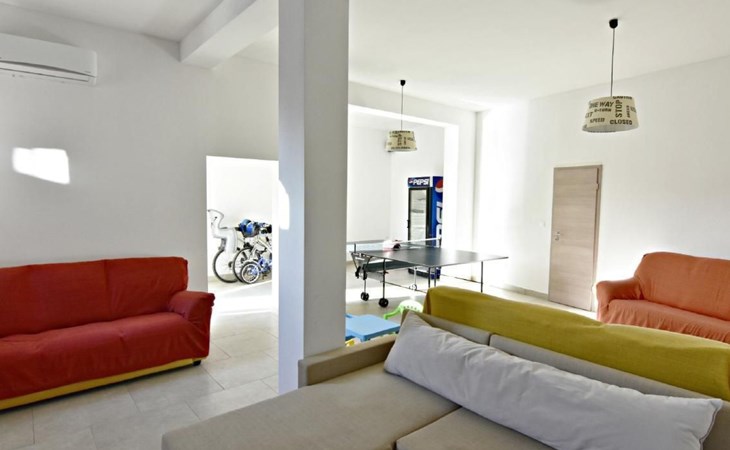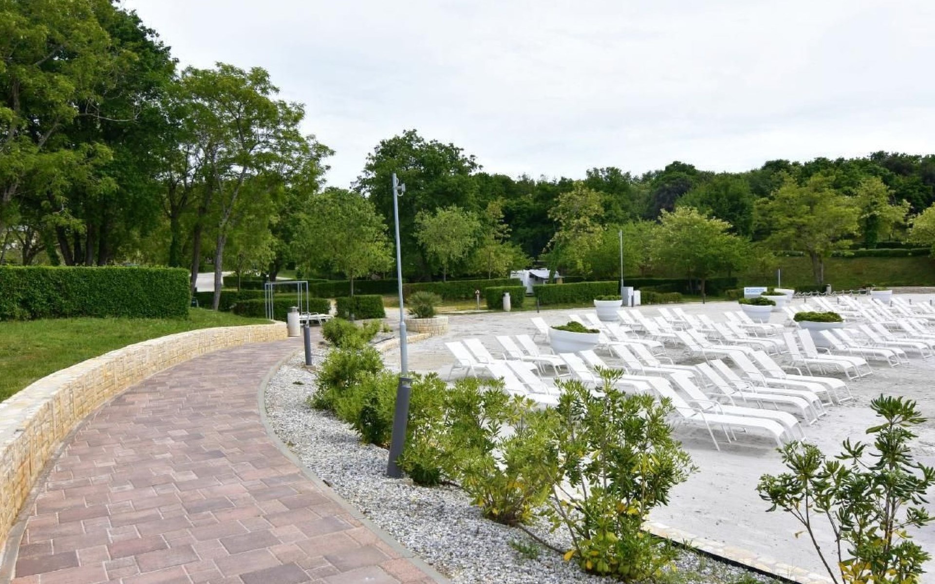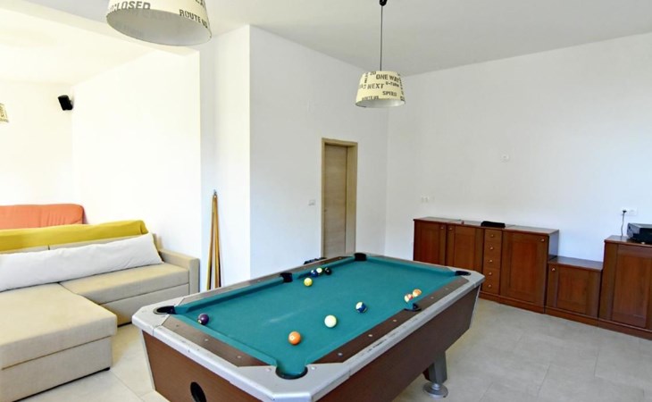 The outdoor area invites you to relax with a shared pool, sun loungers and parasols. A small balcony overlooking the pool offers space for cosy hours outdoors. For added comfort, there is an outdoor shower, a barbecue and a garden table with Istrian stone benches. Not forgetting the games room, which will delight both children and adults with its pool table, flat-screen TV and comfortable seating. The entire complex is fenced, ensuring security and privacy during your stay.