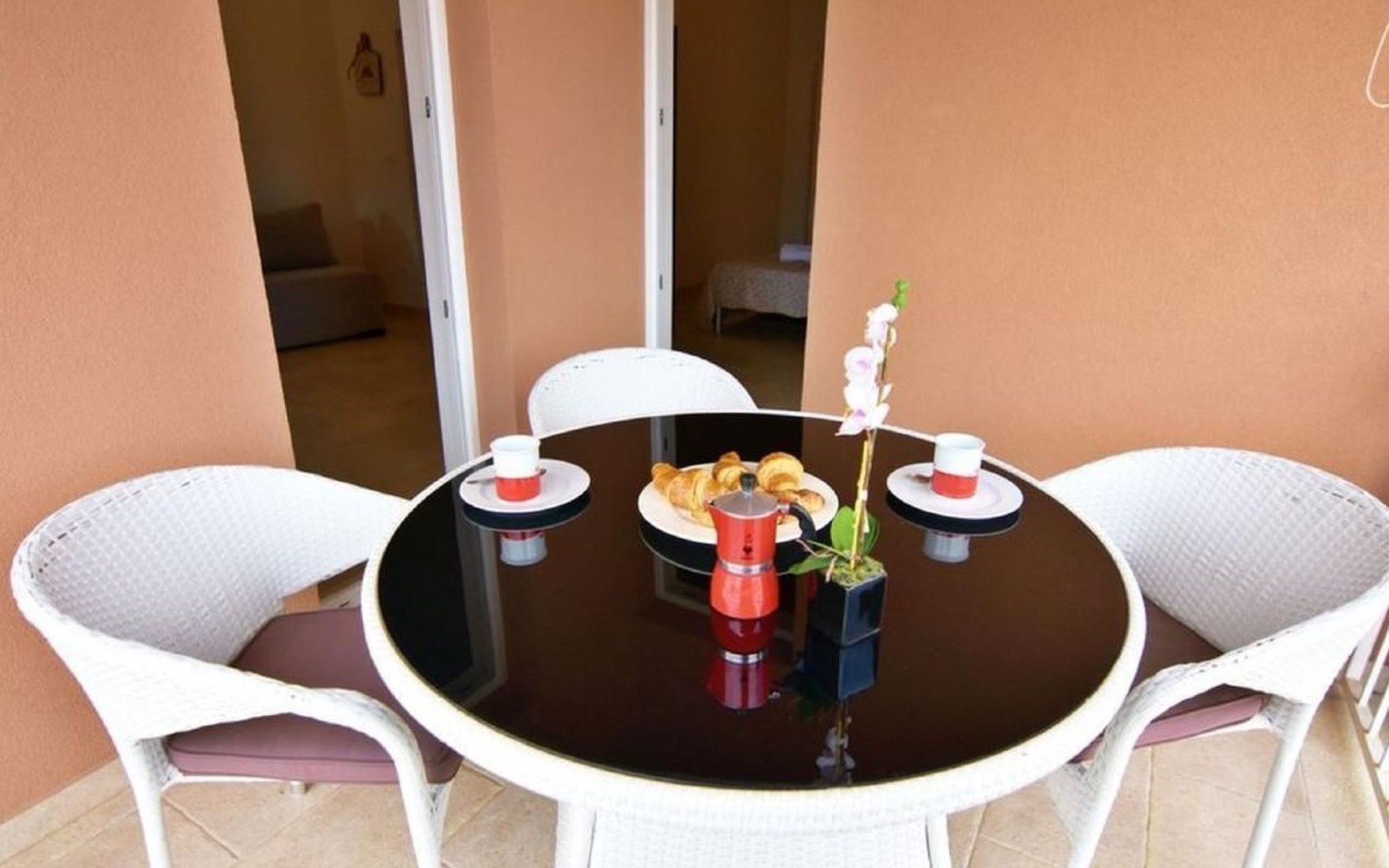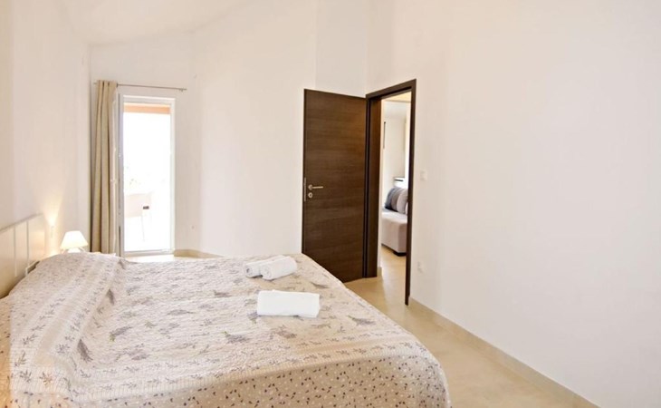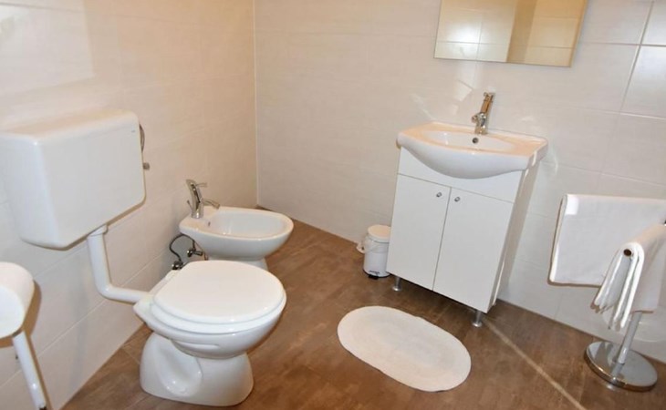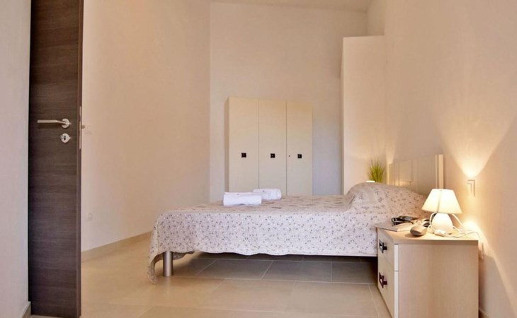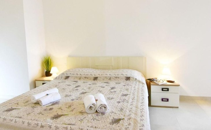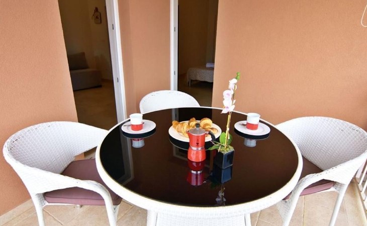 Inside this air-conditioned flat on the first floor of the main building, you will find a bedroom with a comfortable double bed (160x200) and direct balcony access that promises cosiness. A sofa bed in the living area provides additional sleeping options, allowing the flat to accommodate up to four people. In addition to a modern bathroom with shower cubicle, bidet and hairdryer, the flat has a fully equipped kitchenette (with electric hobs, fridge, toaster and coffee machine) and a living area with flat-screen satellite TV and dining table, which gives a feeling of spaciousness thanks to a second balcony access.