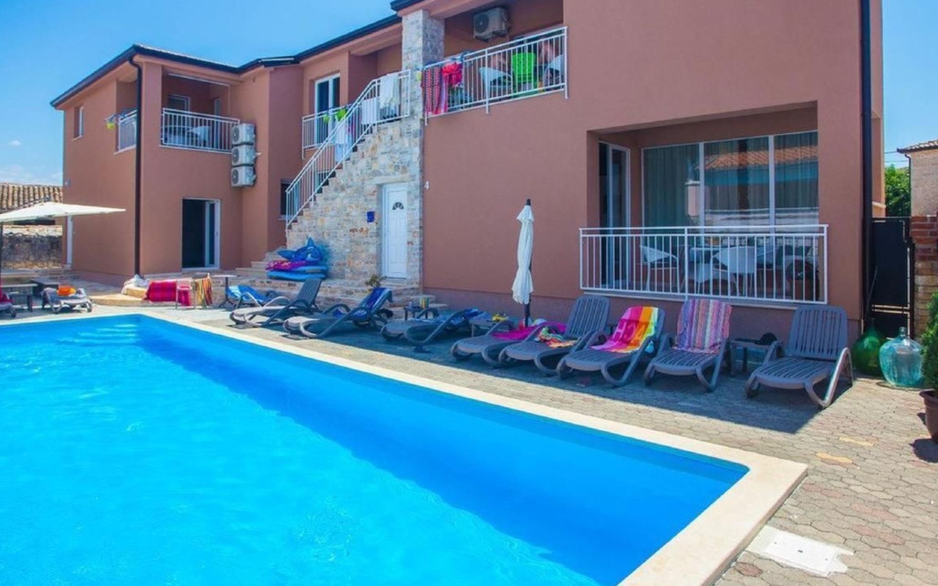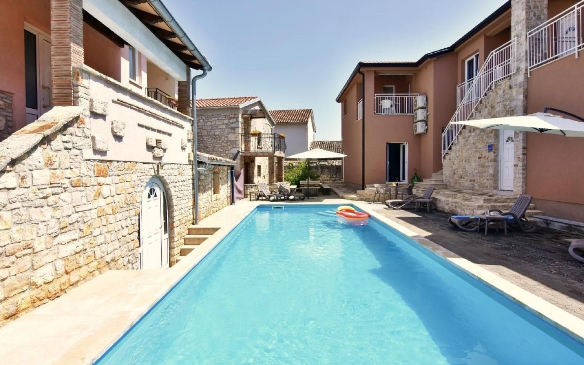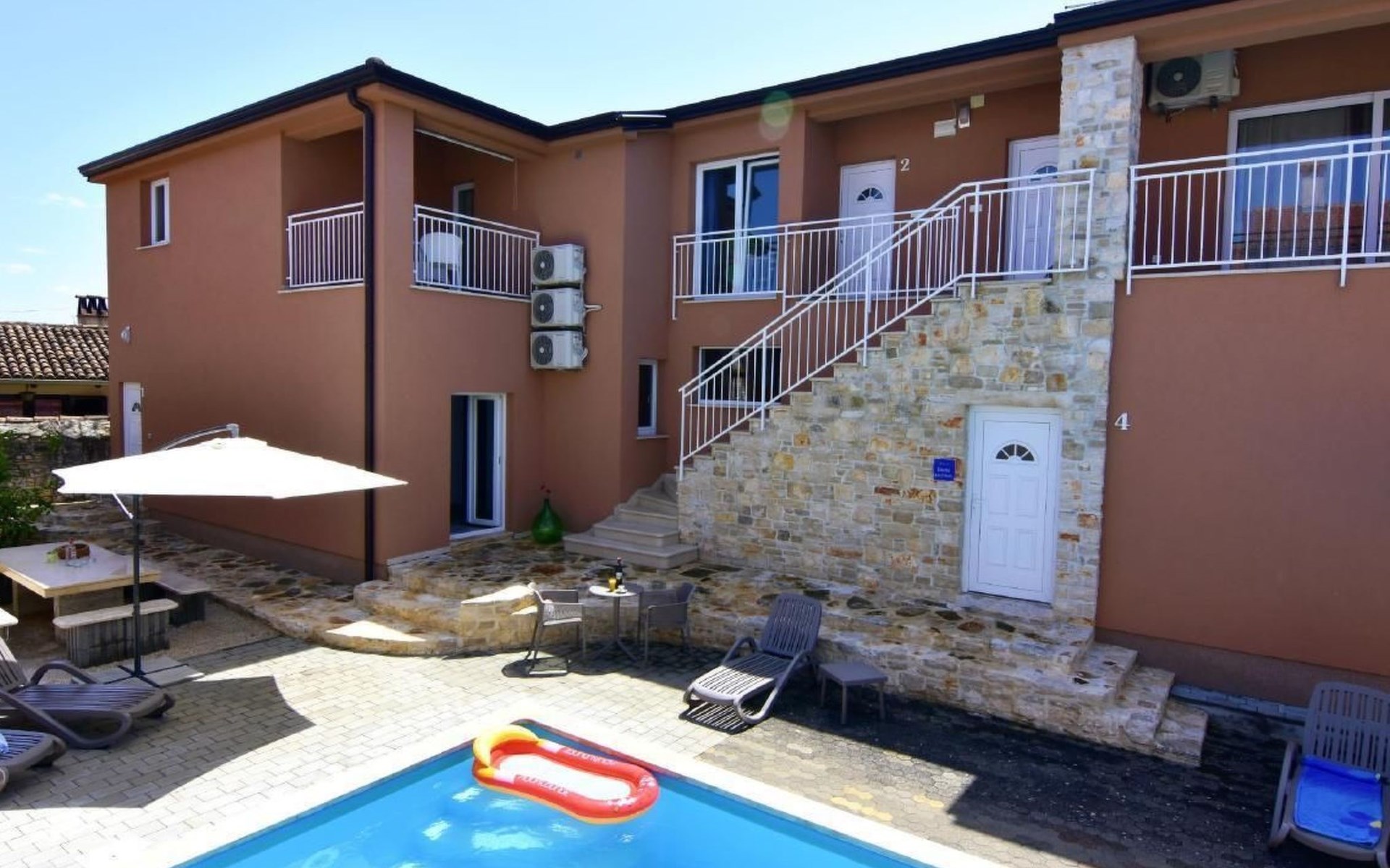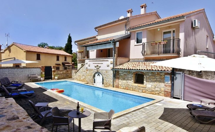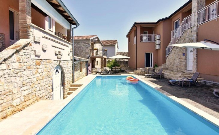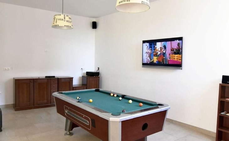 Outside, a communal pool surrounded by sun loungers, parasols and an outdoor shower is waiting to offer you relaxation. For the ultimate holiday experience, there is also a barbecue area and a garden table with traditional Istrian stone benches. A games room with a pool table, table tennis table and comfortable seating provides entertainment for all ages.