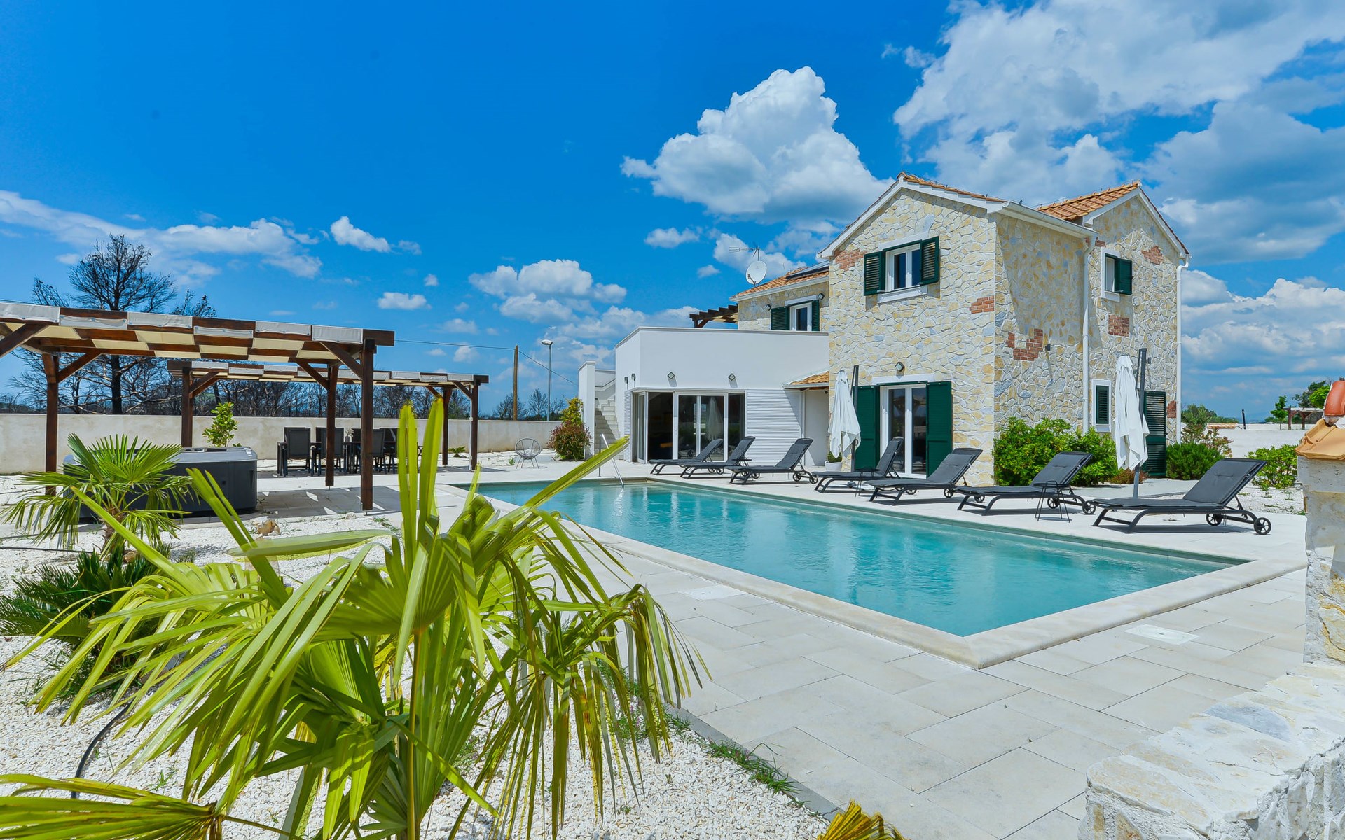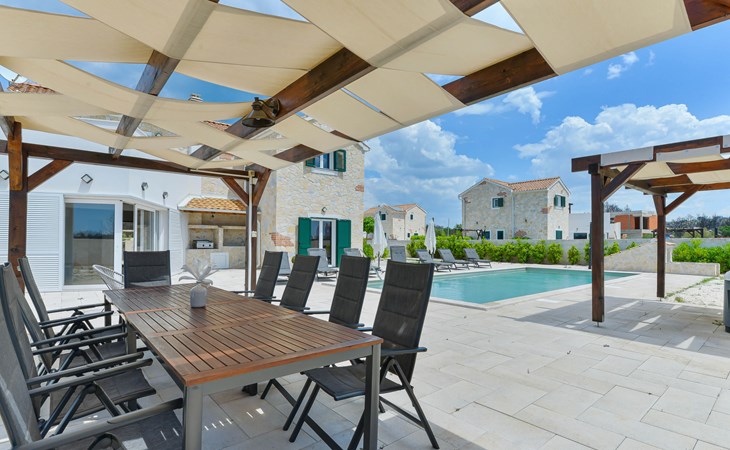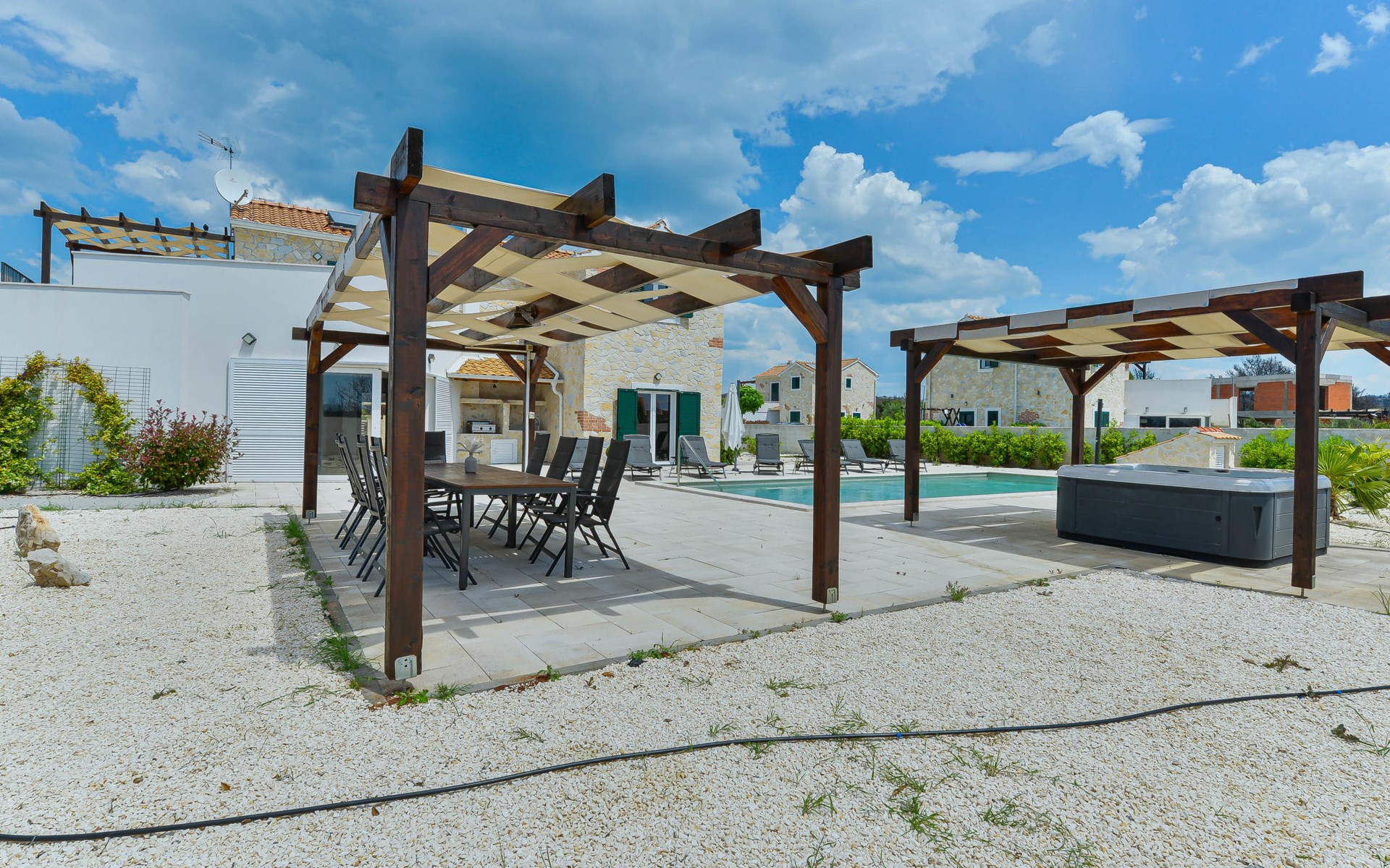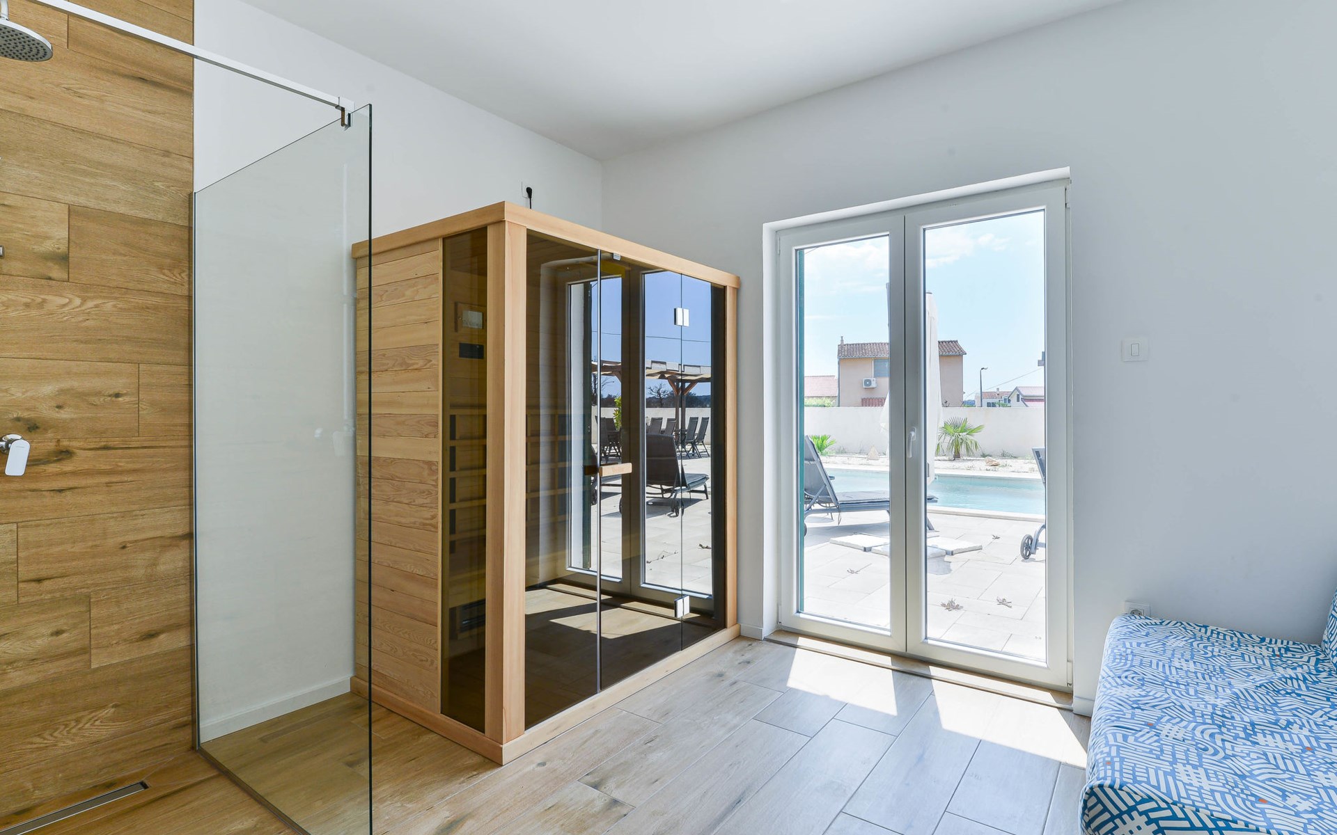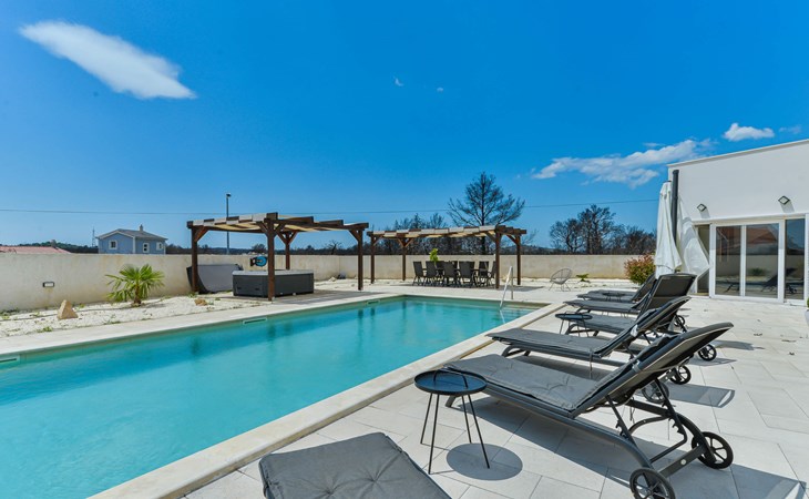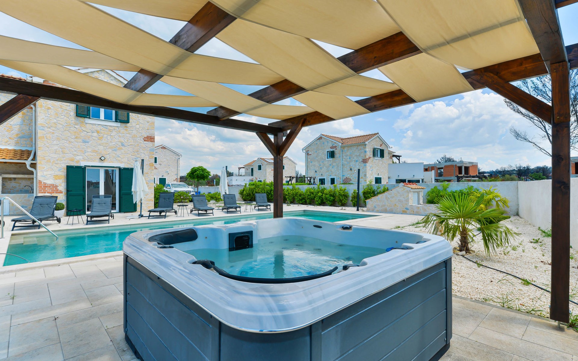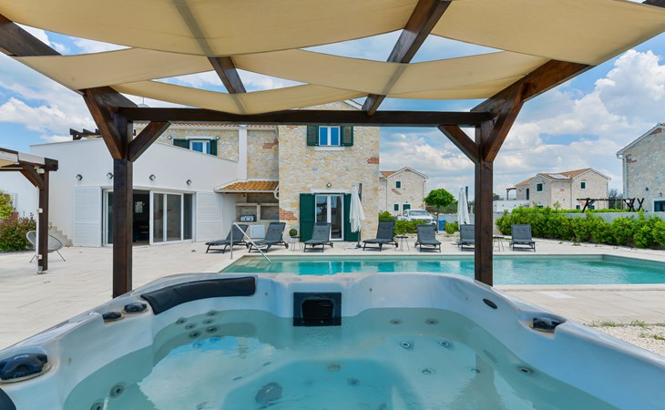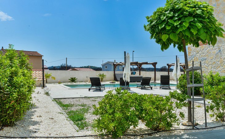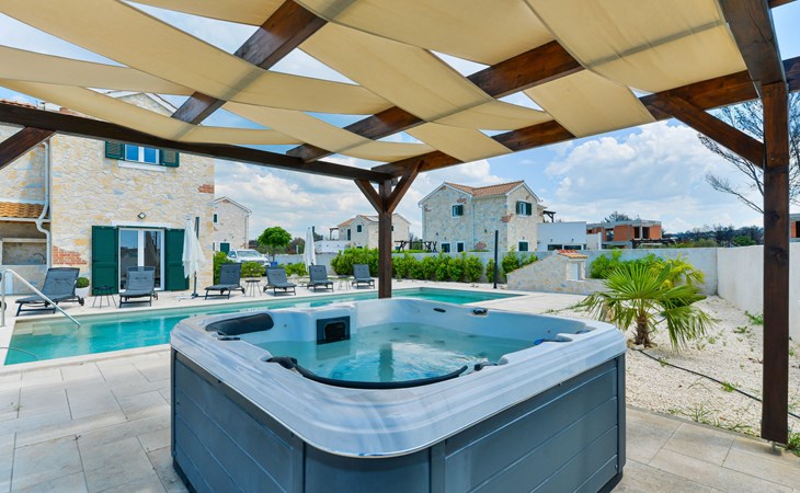 Villa "Violet", 2 storeys, built in 2018. 1.5 km from the centre of Zaton, in a quiet, sunny position, 1.5 km from the sea, 2.5 km from the beach. Private: swimming pool angular (10 x 4 m, depth 150 cm, seasonal availability: 01.May. - 30.Sep.) with internal staircase. Outdoor shower, hot tub, pergola, garden furniture, barbecue. In the house: internet access, sauna, washing machine, tumble dryer. Parking (for 3 cars) at the house on the premises. Shop 1.5 km, restaurant 1.5 km, bus stop 450 m, pebble beach 3 km, concrete beach 2.5 km. Nearby attractions: NP Krka 20 km. Please note: suitable for families.