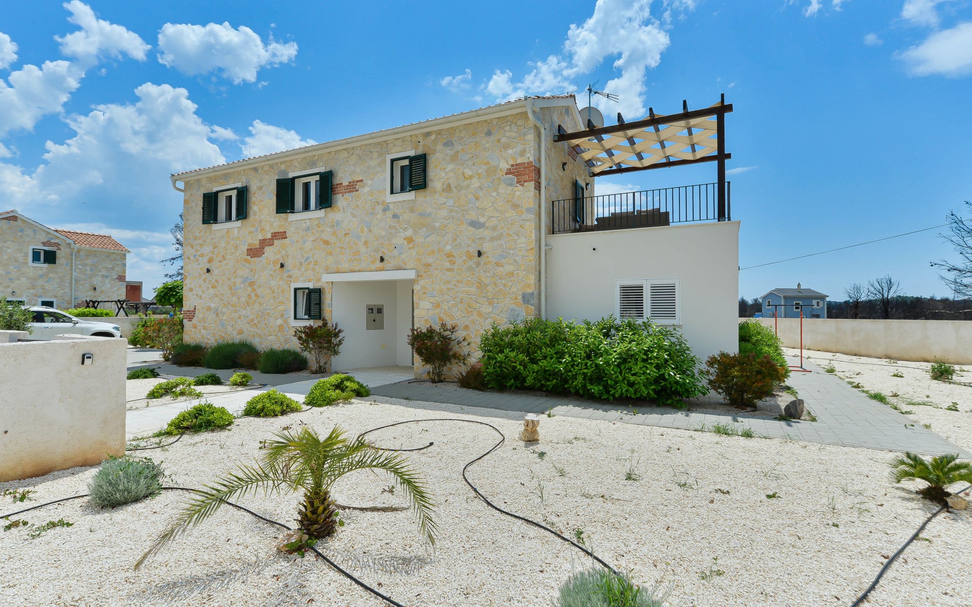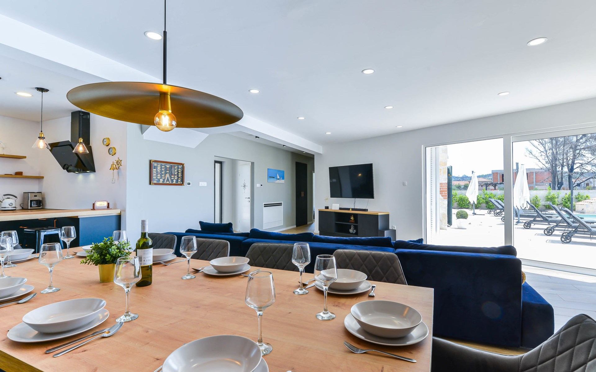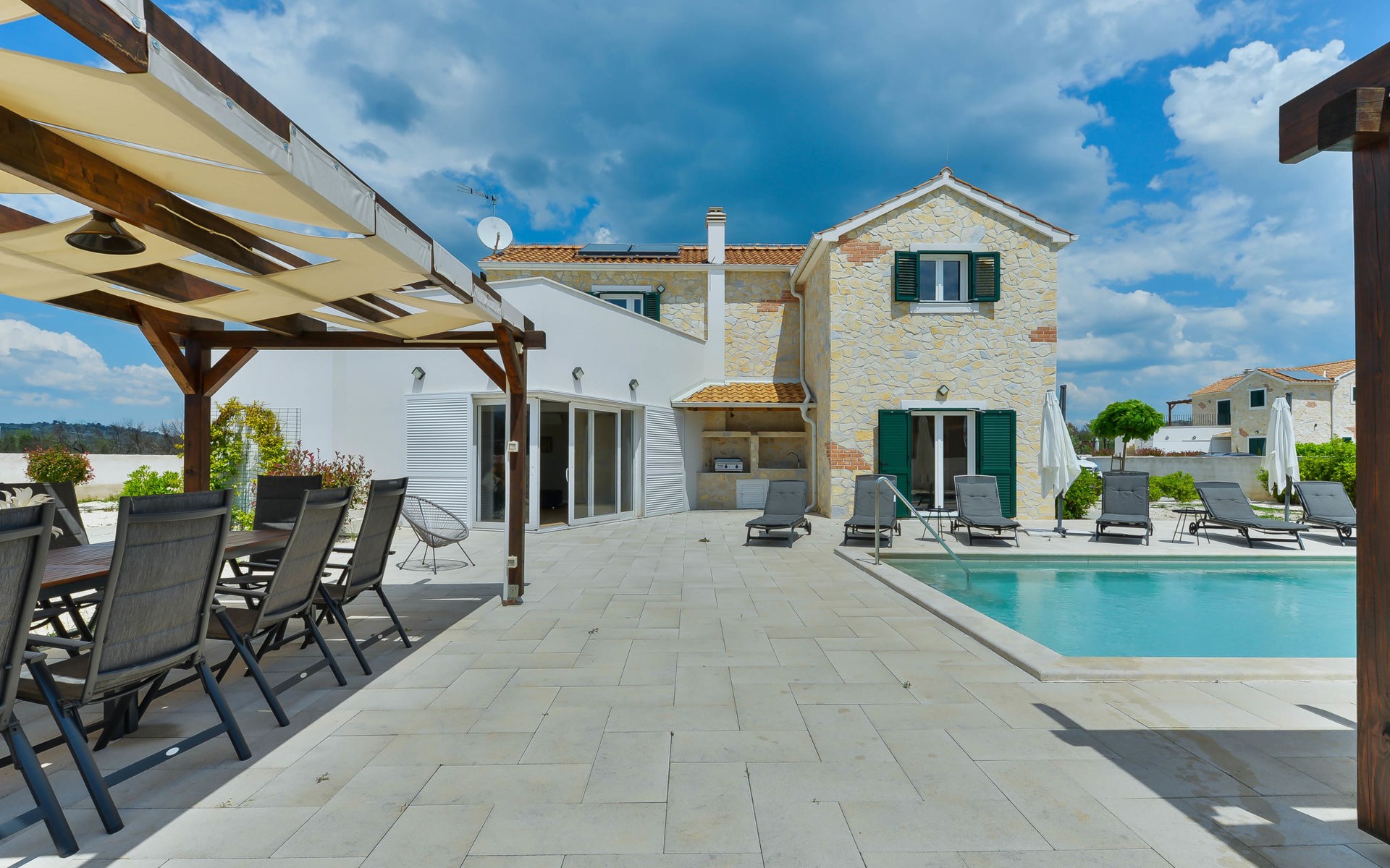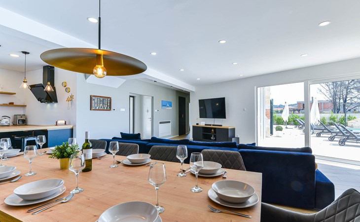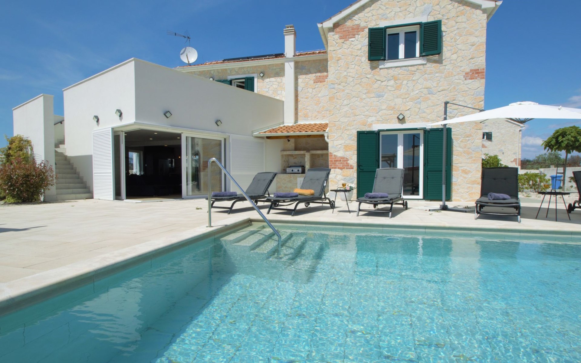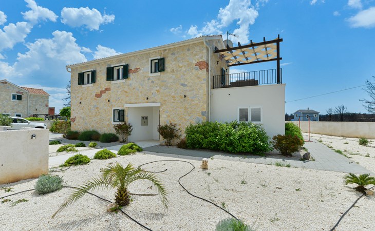 Villa "Violet", 2 storeys, built in 2018. 1.5 km from the centre of Zaton, in a quiet, sunny position, 1.5 km from the sea, 2.5 km from the beach. Private: swimming pool angular (10 x 4 m, depth 150 cm, seasonal availability: 01.May. - 30.Sep.) with internal staircase. Outdoor shower, hot tub, pergola, garden furniture, barbecue. In the house: internet access, sauna, washing machine, tumble dryer. Parking (for 3 cars) at the house on the premises. Shop 1.5 km, restaurant 1.5 km, bus stop 450 m, pebble beach 3 km, concrete beach 2.5 km. Nearby attractions: NP Krka 20 km. Please note: suitable for families.
