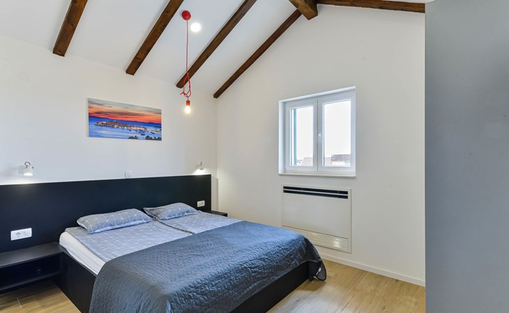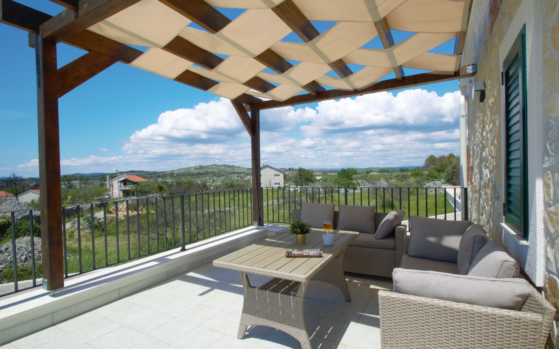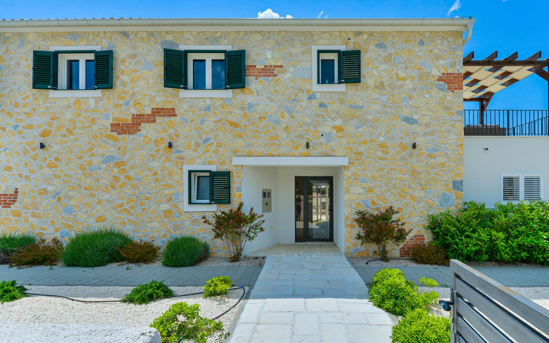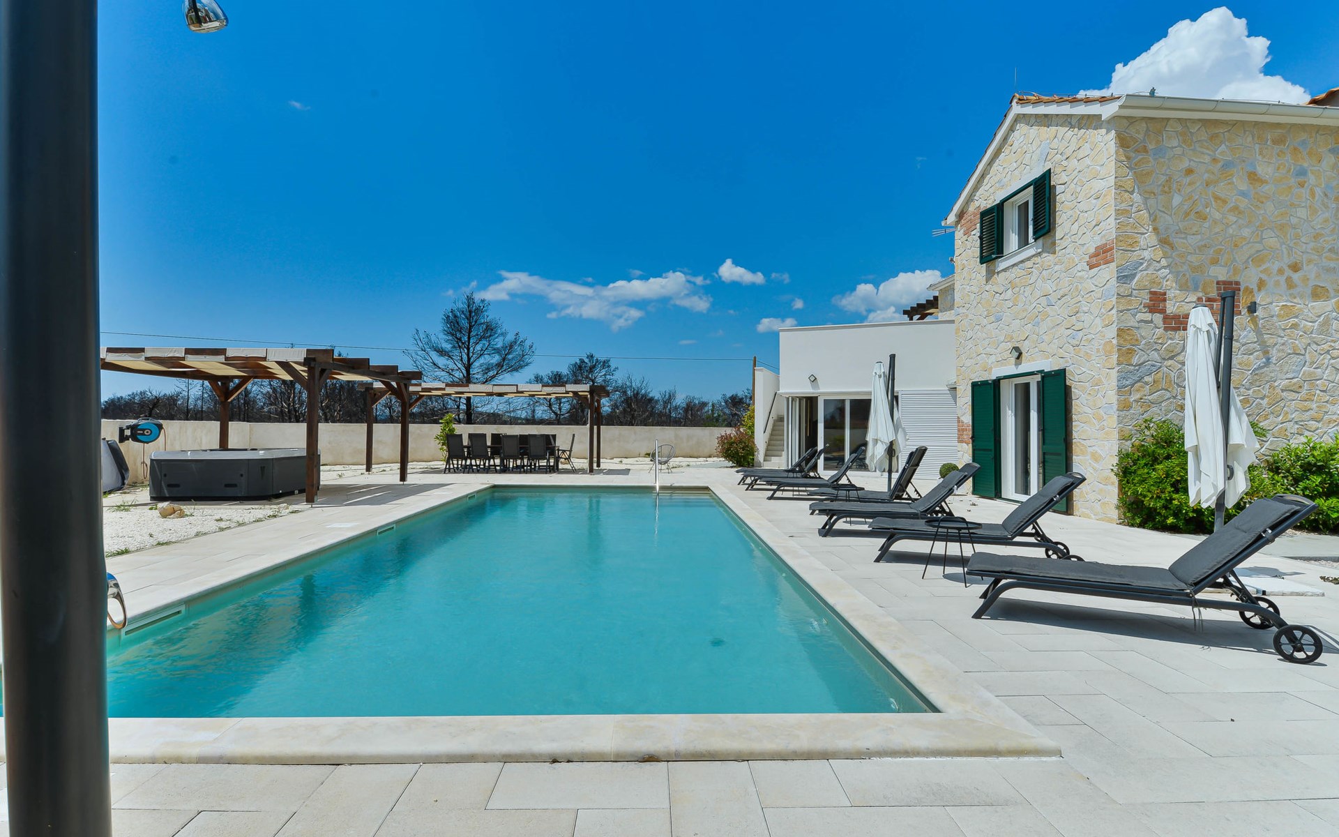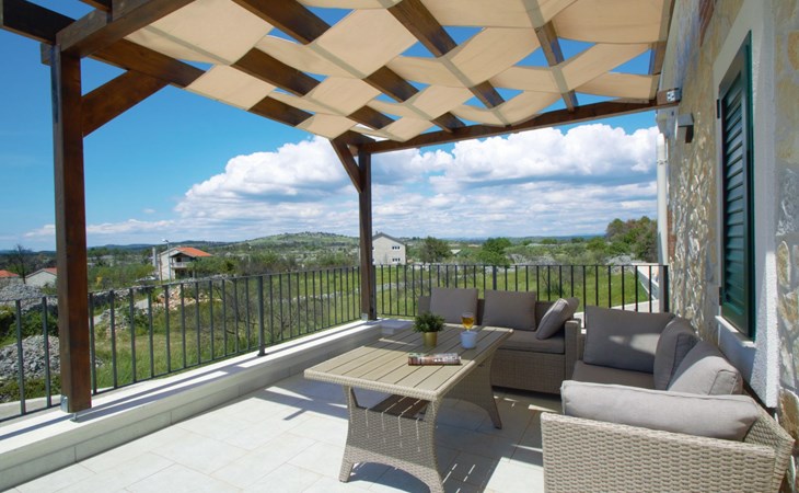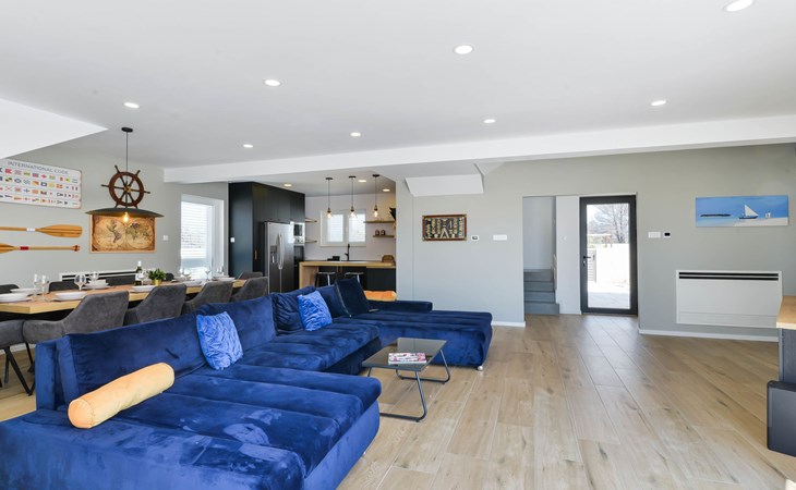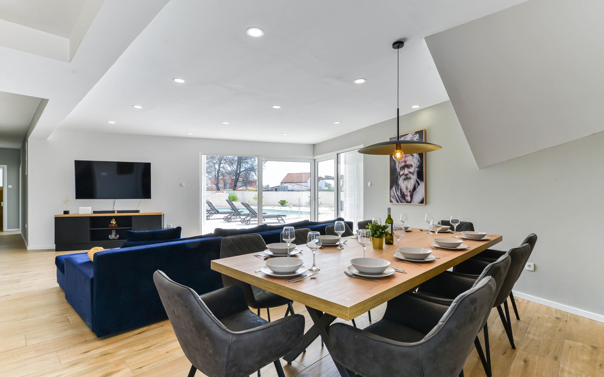 Villa "Violet", 2 storeys, built in 2018. 1.5 km from the centre of Zaton, in a quiet, sunny position, 1.5 km from the sea, 2.5 km from the beach. Private: swimming pool angular (10 x 4 m, depth 150 cm, seasonal availability: 01.May. - 30.Sep.) with internal staircase. Outdoor shower, hot tub, pergola, garden furniture, barbecue. In the house: internet access, sauna, washing machine, tumble dryer. Parking (for 3 cars) at the house on the premises. Shop 1.5 km, restaurant 1.5 km, bus stop 450 m, pebble beach 3 km, concrete beach 2.5 km. Nearby attractions: NP Krka 20 km. Please note: suitable for families.