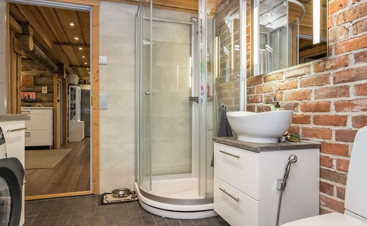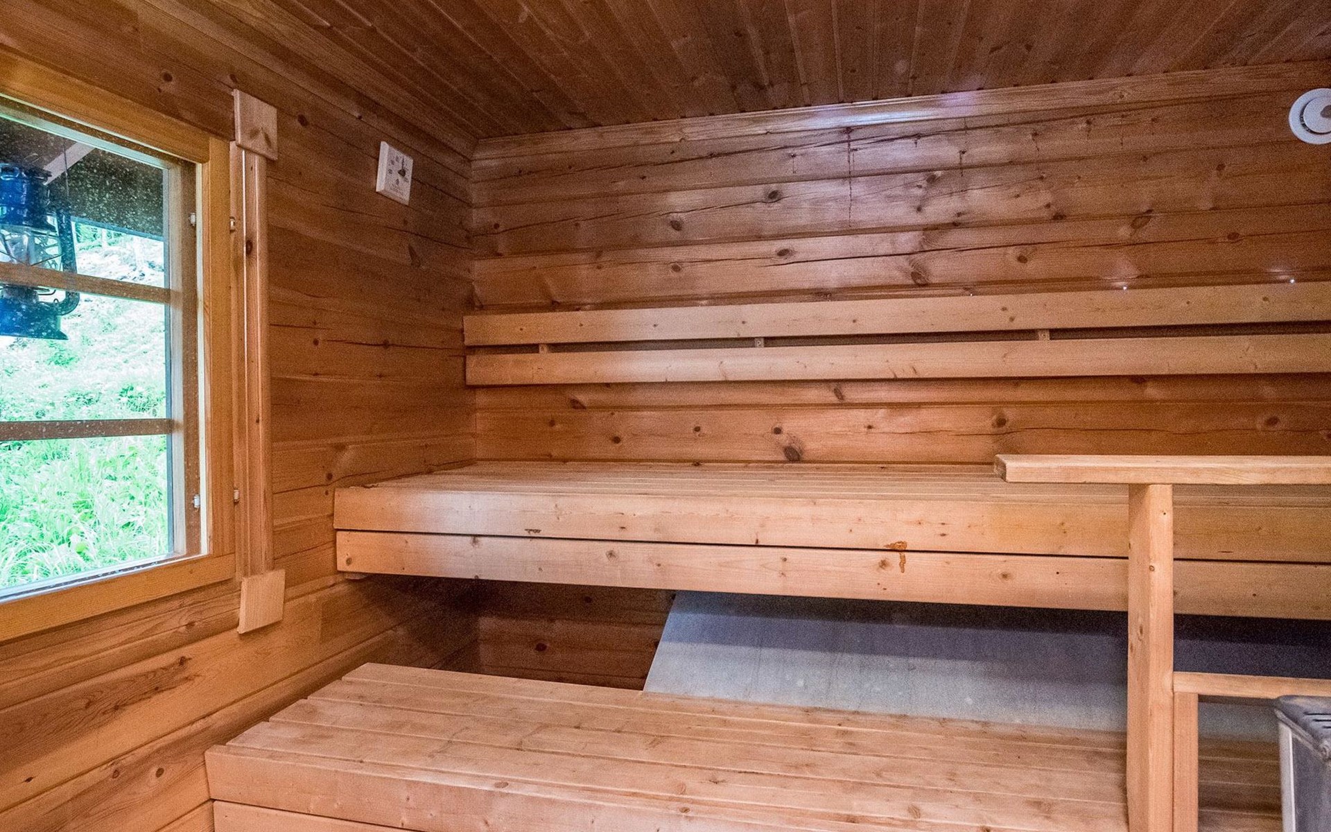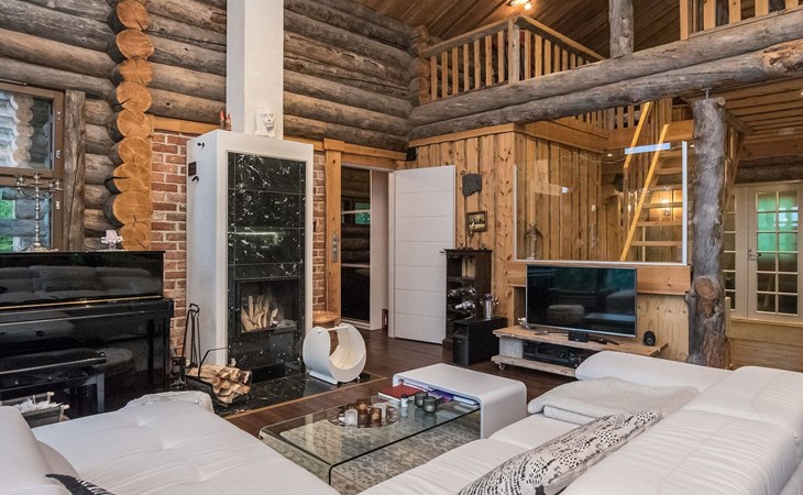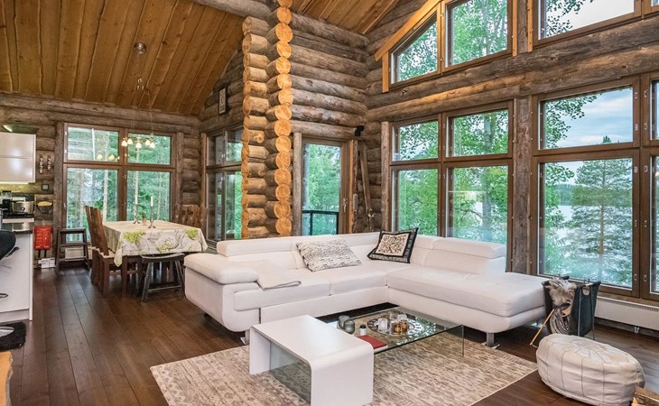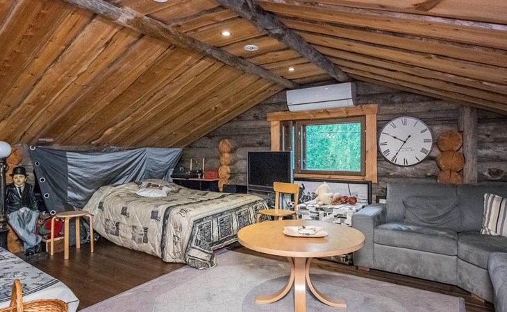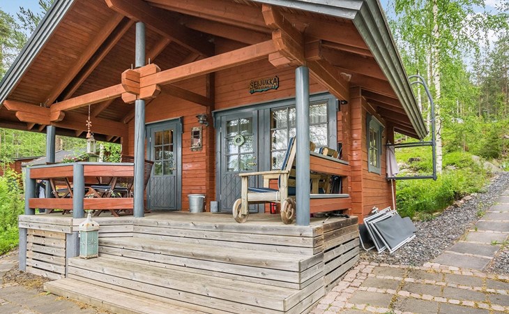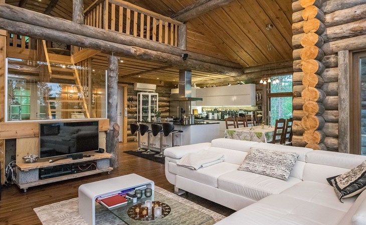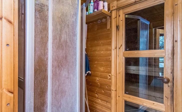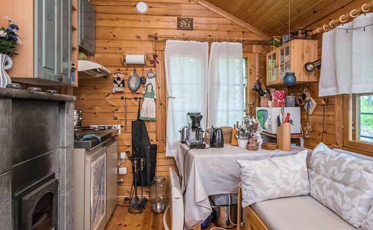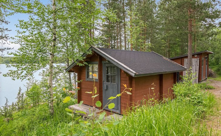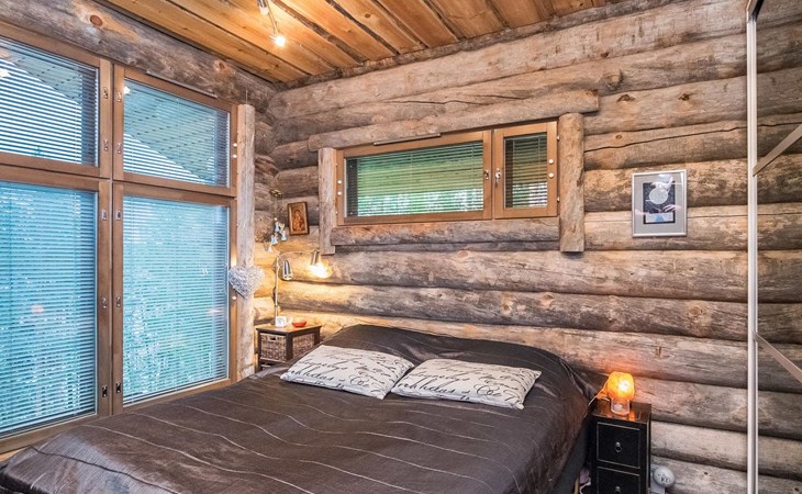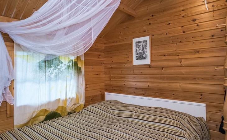 Log cabin 2016, living room/kitchen with sofa bed (130 cm), three bedrooms (10 m²) each with two beds, wide mattress pad for each room (can be used for attaching single beds as a double bed), separate WC, washroom with WC and shower cubicle, no sauna in the cabin.