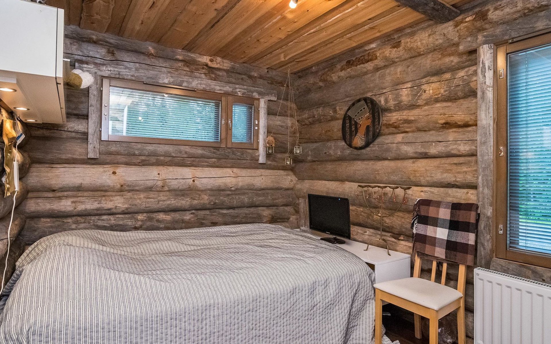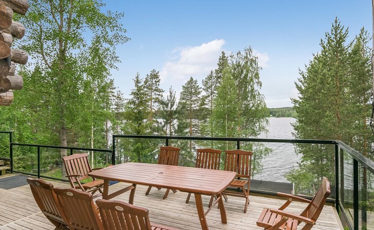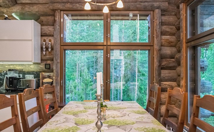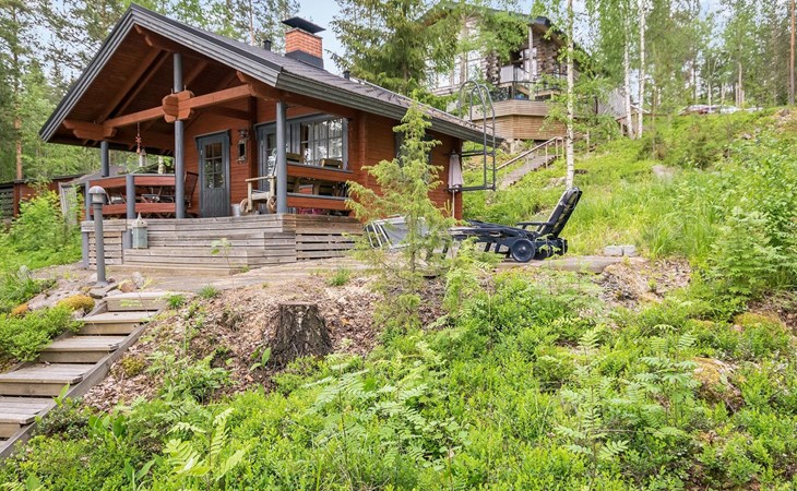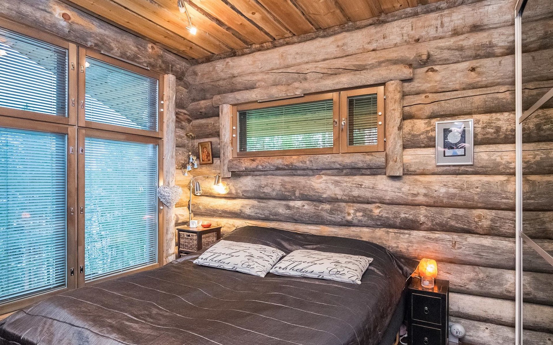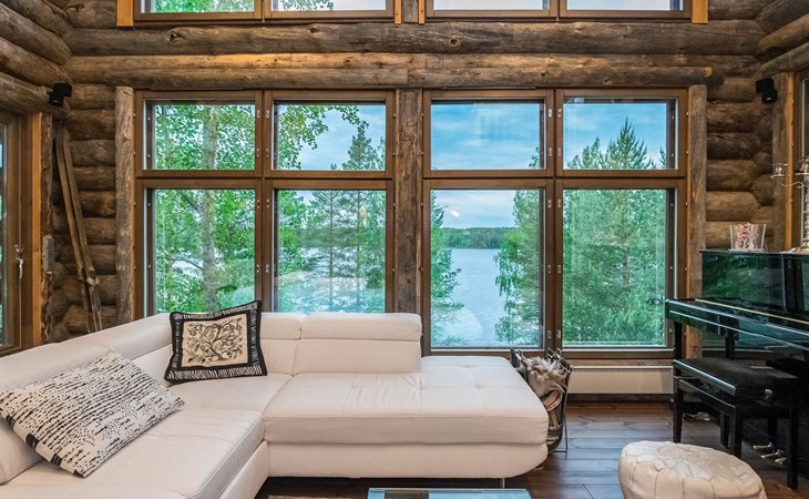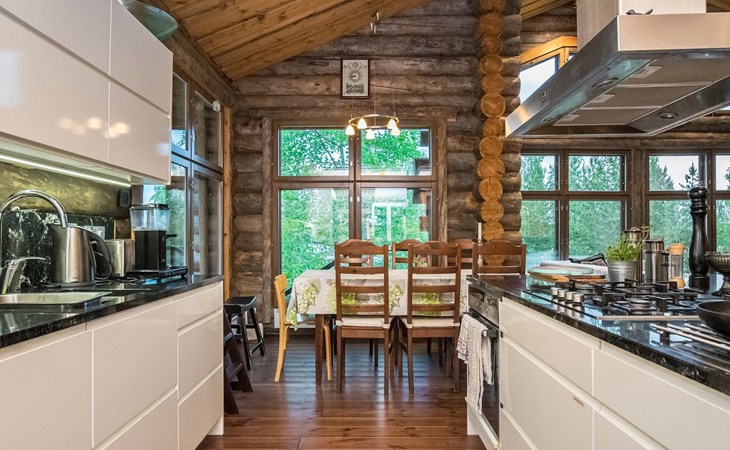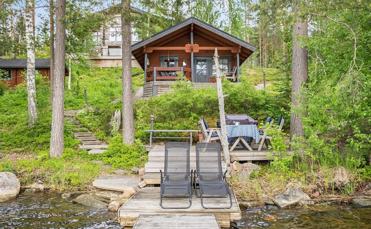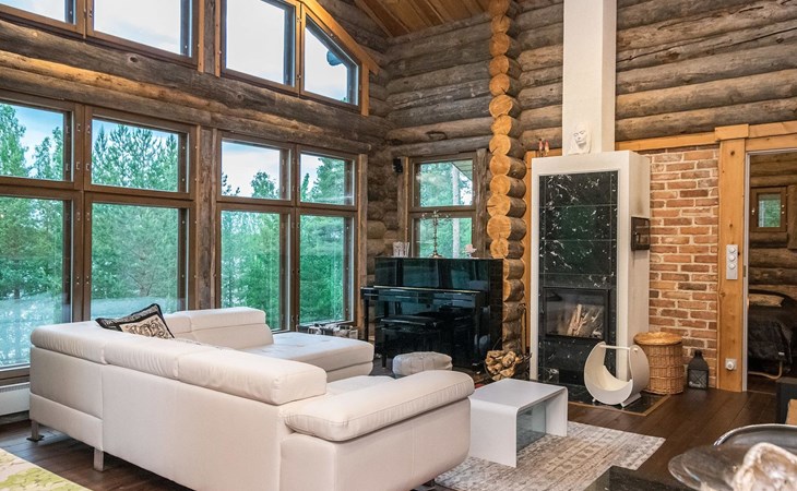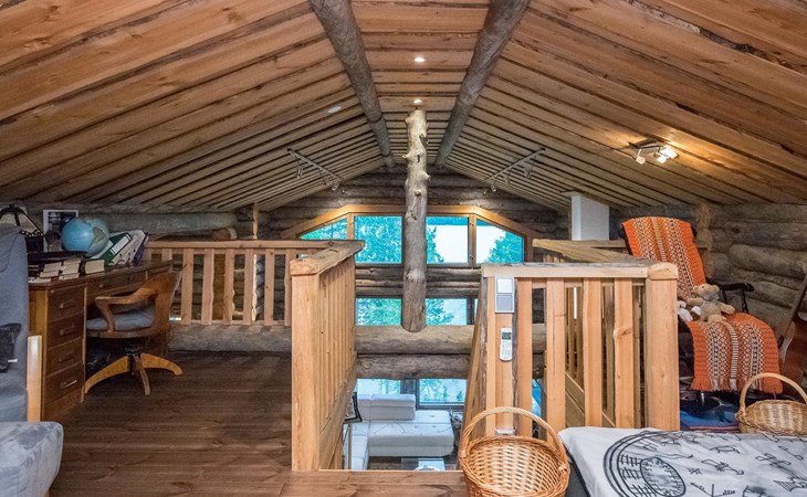 Log cabin 2016, living room/kitchen with sofa bed (130 cm), three bedrooms (10 m²) each with two beds, wide mattress pad for each room (can be used for attaching single beds as a double bed), separate WC, washroom with WC and shower cubicle, no sauna in the cabin.