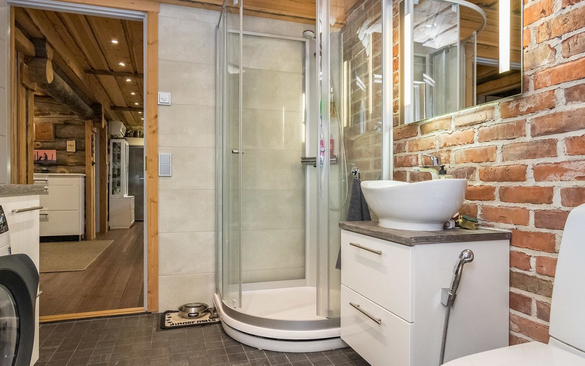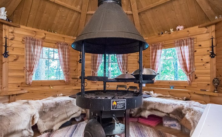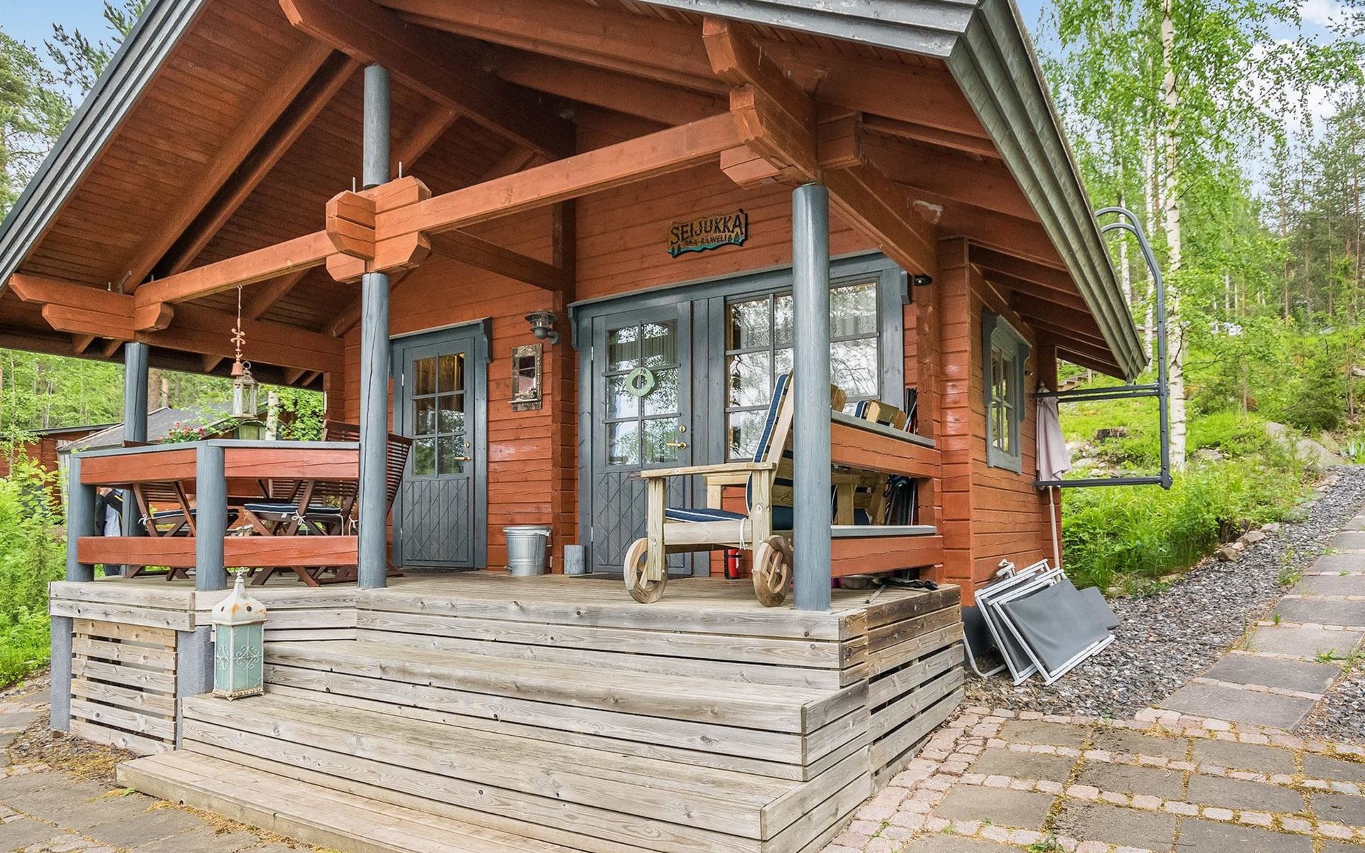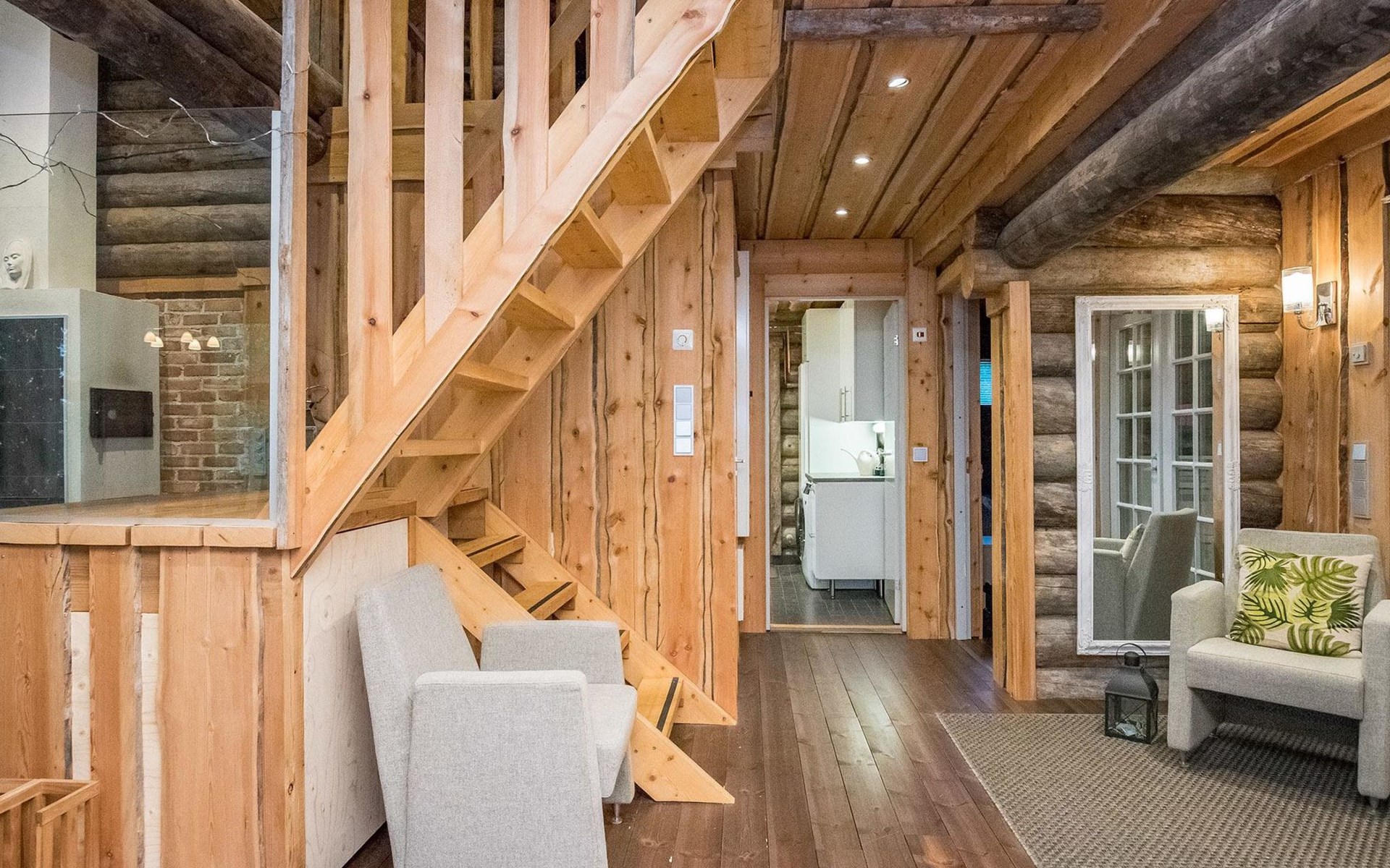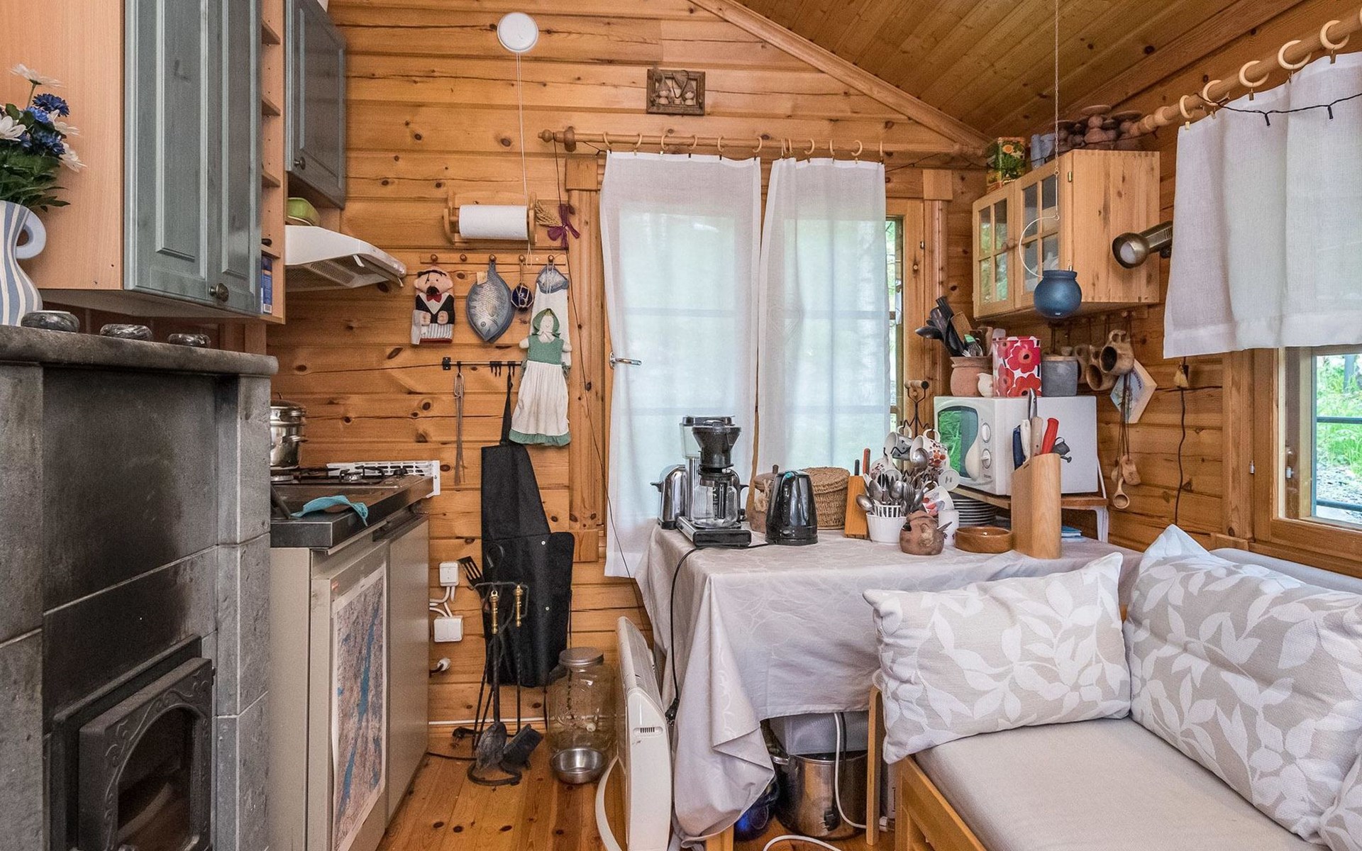 Log cabin 2016, living room/kitchen with sofa bed (130 cm), three bedrooms (10 m²) each with two beds, wide mattress pad for each room (can be used for attaching single beds as a double bed), separate WC, washroom with WC and shower cubicle, no sauna in the cabin.