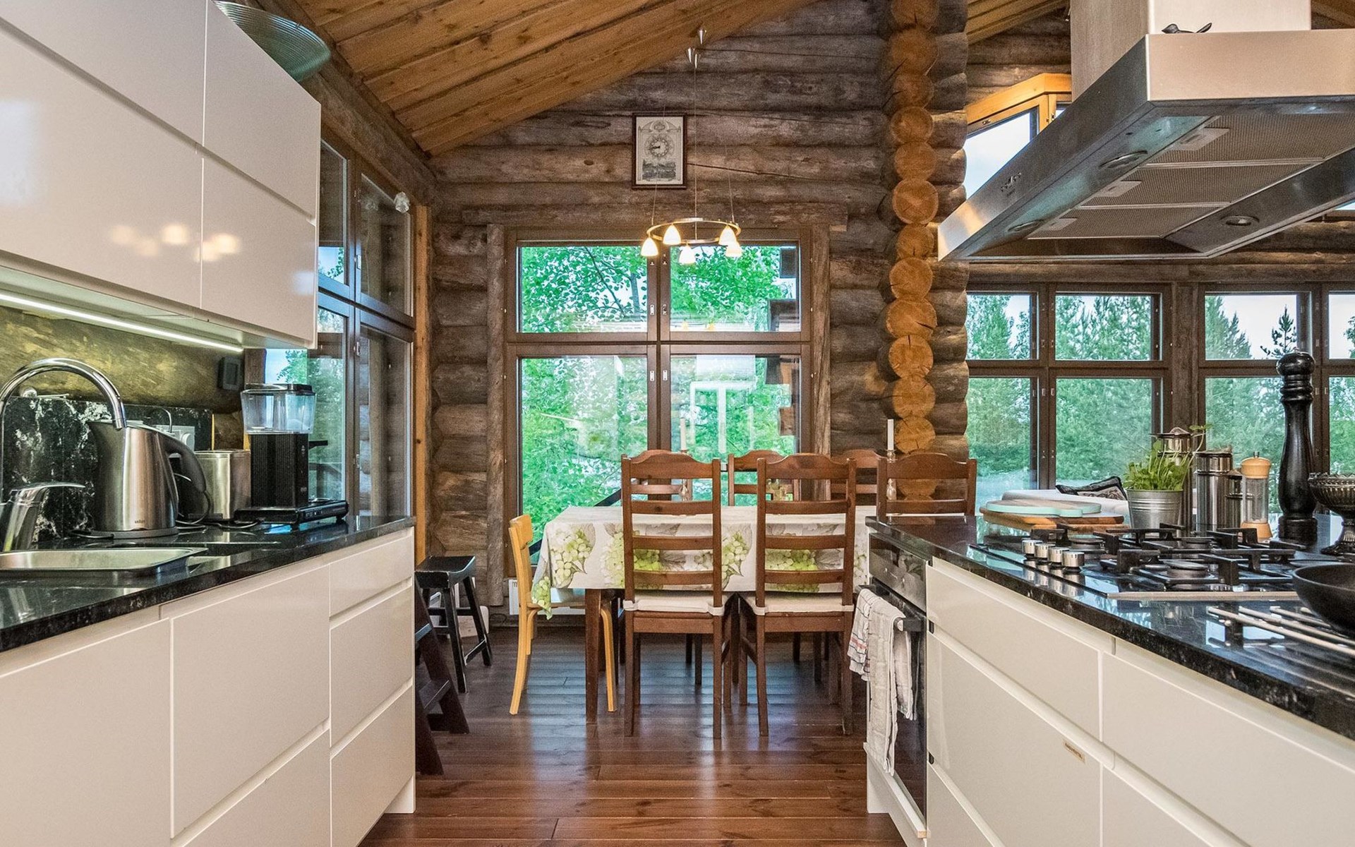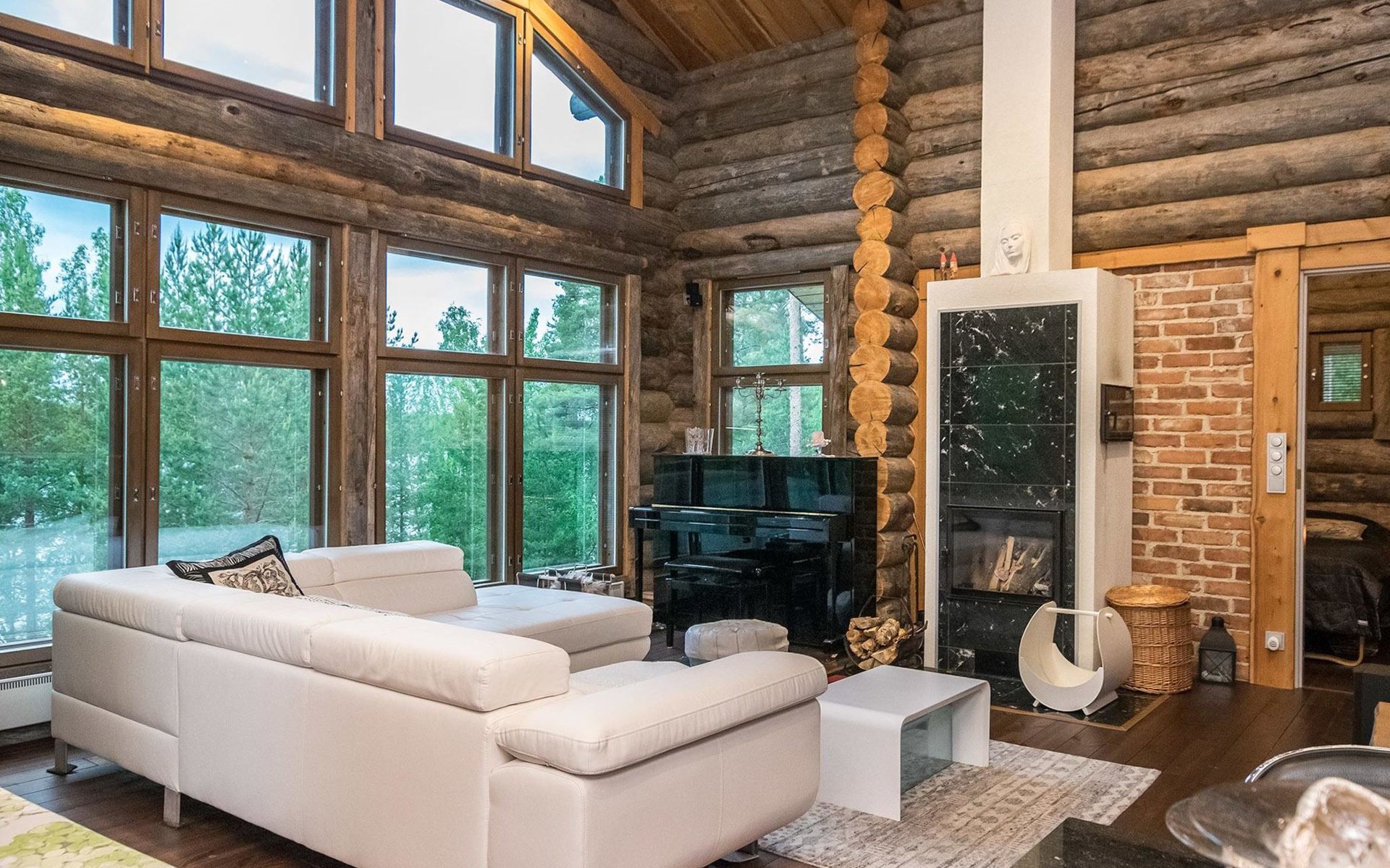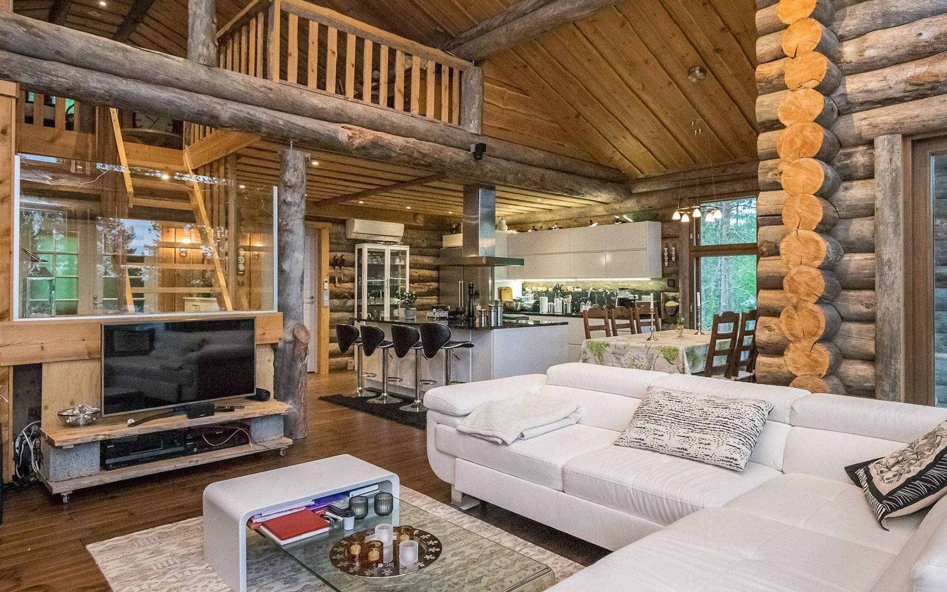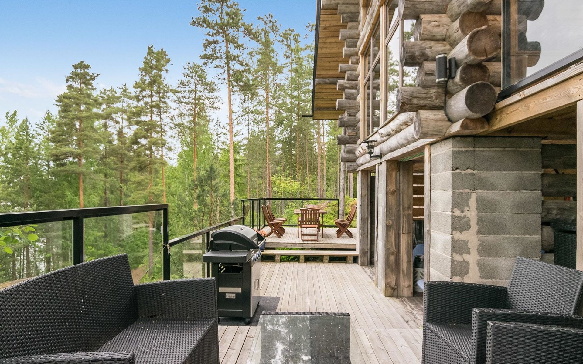 Log cabin 2016, living room/kitchen with sofa bed (130 cm), three bedrooms (10 m²) each with two beds, wide mattress pad for each room (can be used for attaching single beds as a double bed), separate WC, washroom with WC and shower cubicle, no sauna in the cabin.