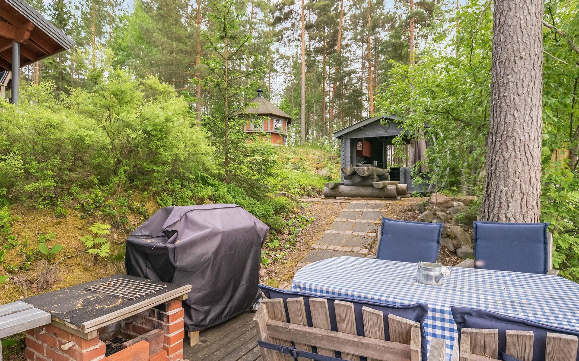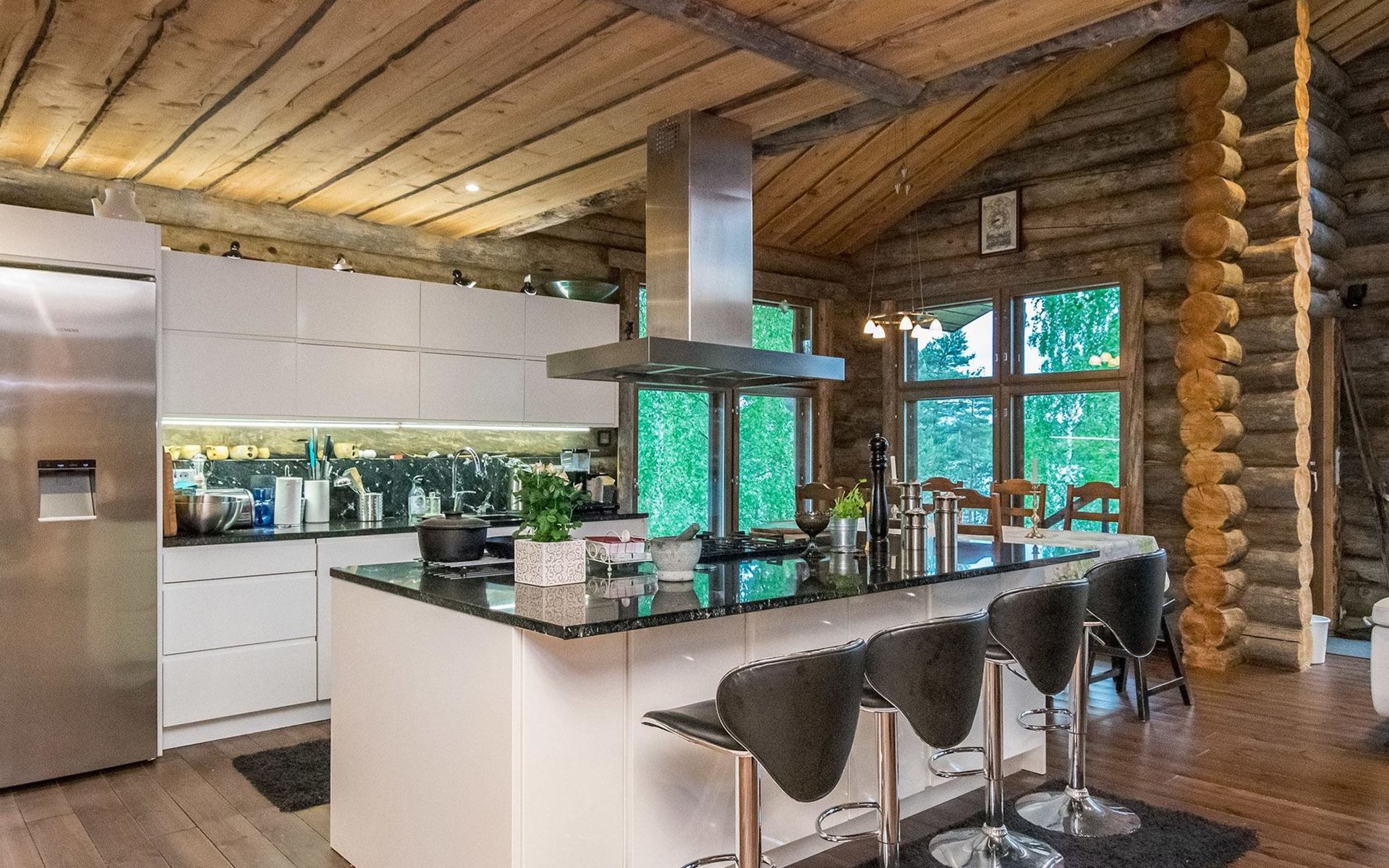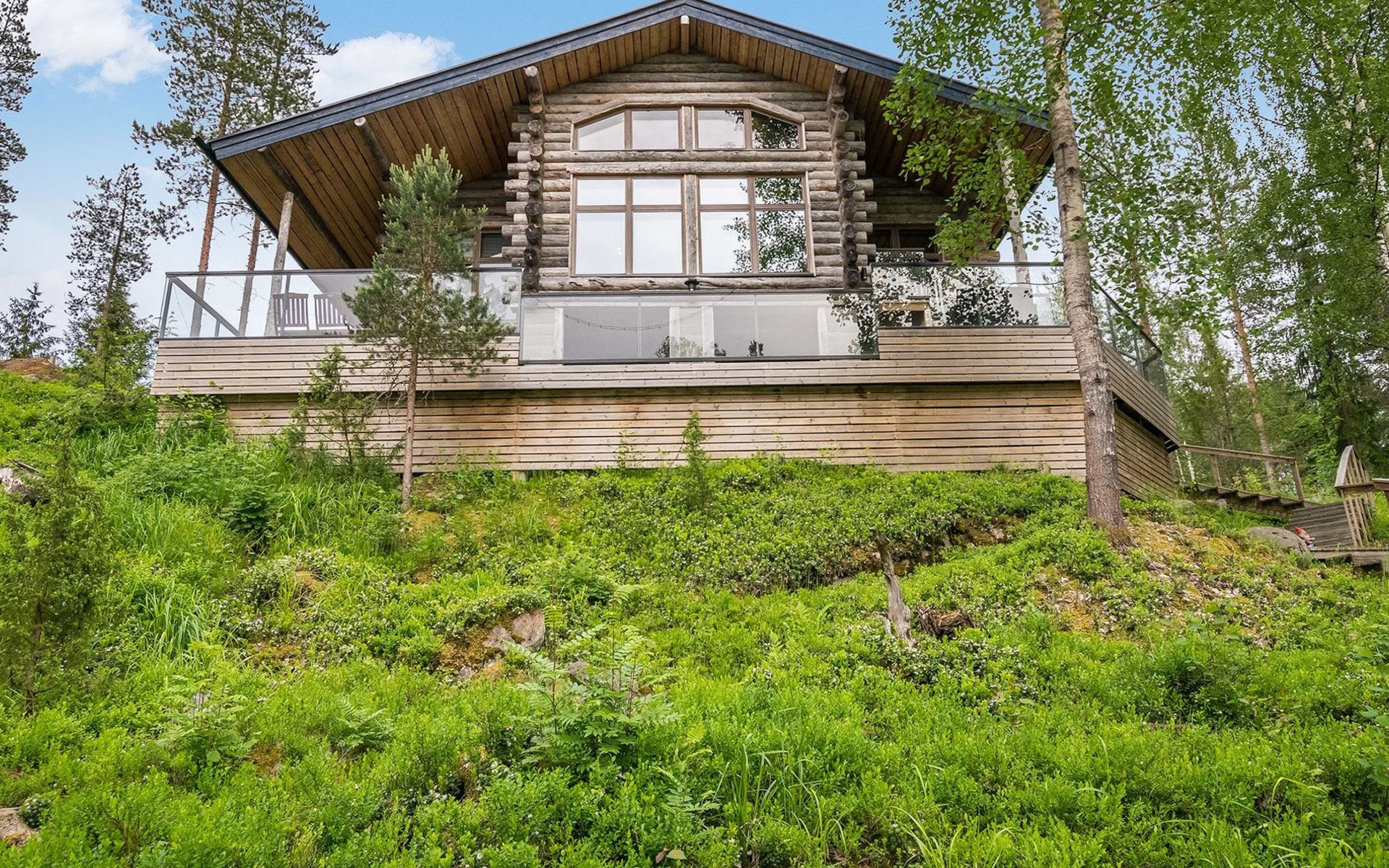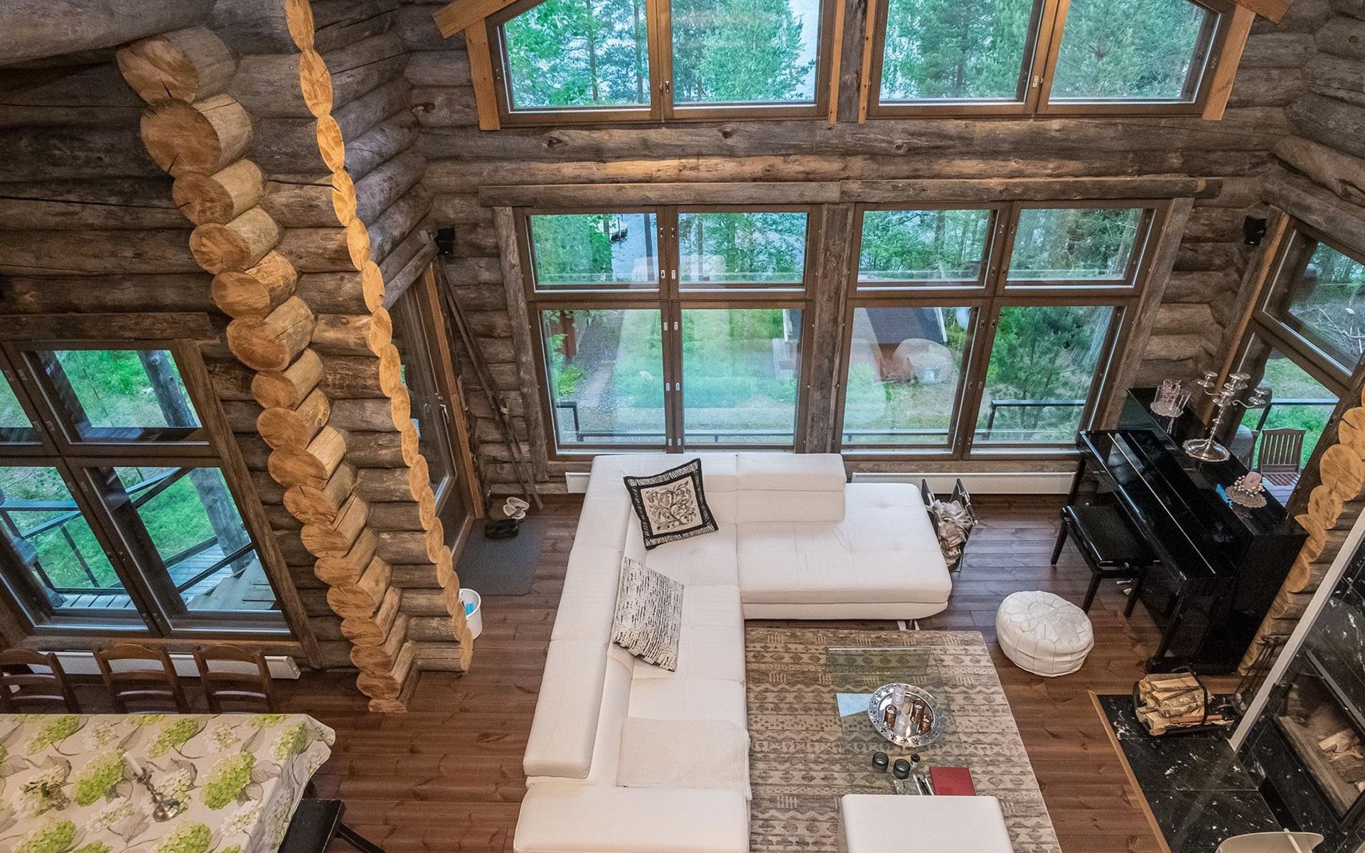 Log cabin 2016, living room/kitchen with sofa bed (130 cm), three bedrooms (10 m²) each with two beds, wide mattress pad for each room (can be used for attaching single beds as a double bed), separate WC, washroom with WC and shower cubicle, no sauna in the cabin.