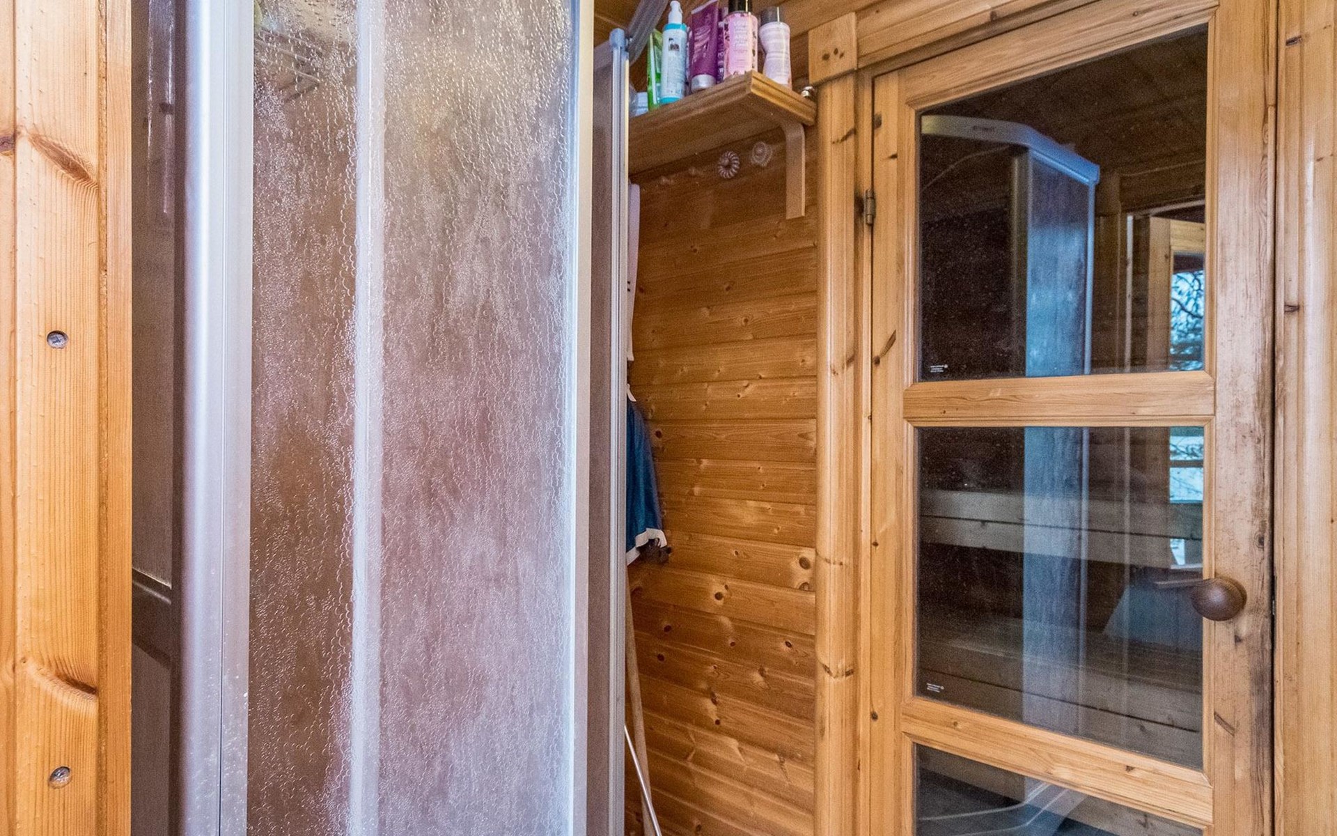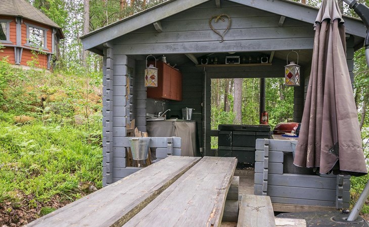 Lakeside sauna with wood-burning sauna stove, shower, kitchenette in the fireplace room.