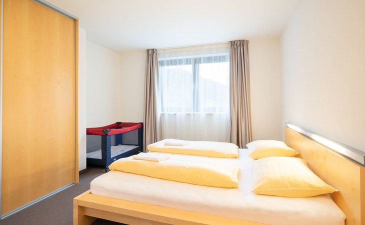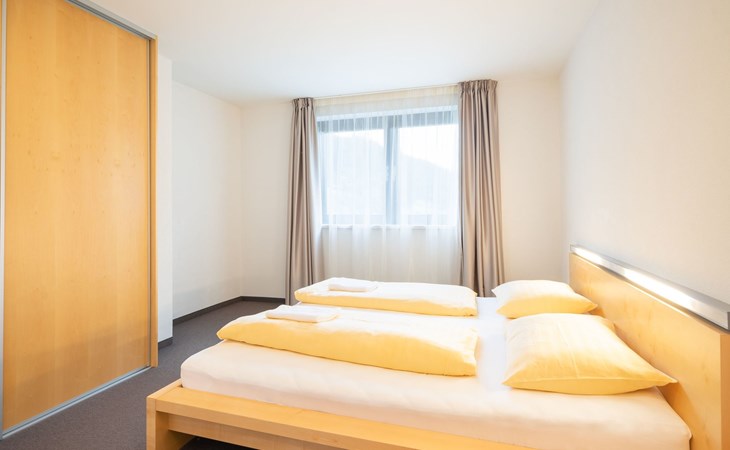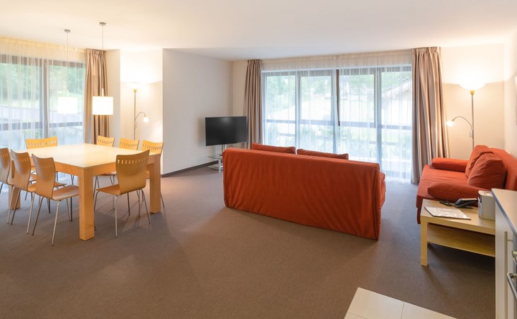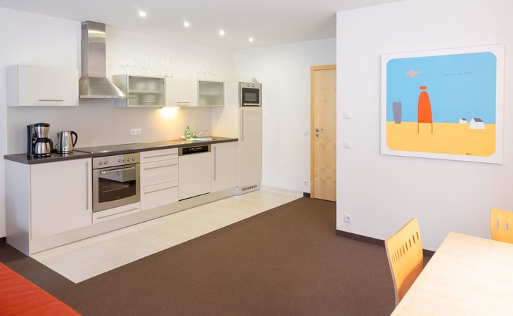 Type 3: 4 - 7 persons (83 m²) with a separate living/bedroom, 2 bedrooms and 2 bathrooms. The flat is generously proportioned and equipped with every comfort and has satellite TV, radio with CD player, DVD player, telephone and FREE internet connection (network/WLAN connection). The bathrooms have a bath, a shower and some have double washbasins. The kitchen is equipped with a dishwasher, microwave, coffee machine, cooker with oven and kettle.
