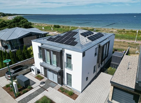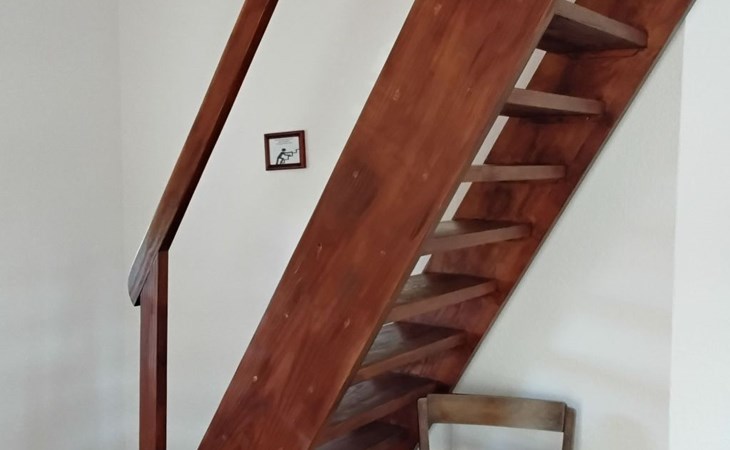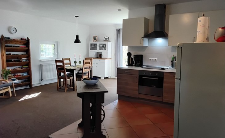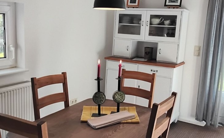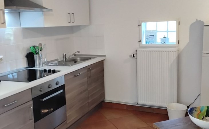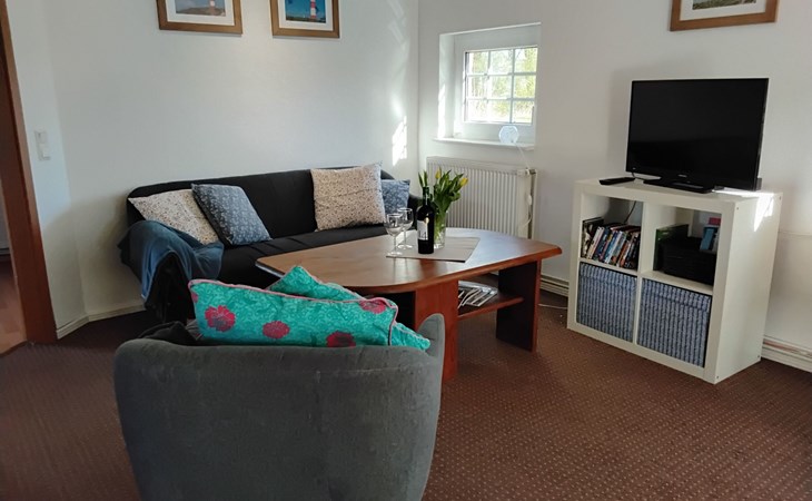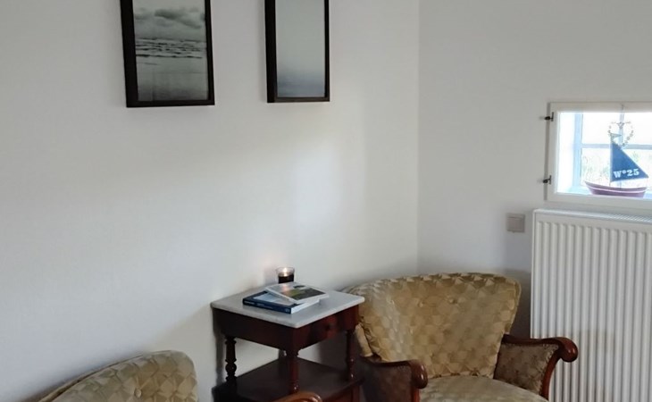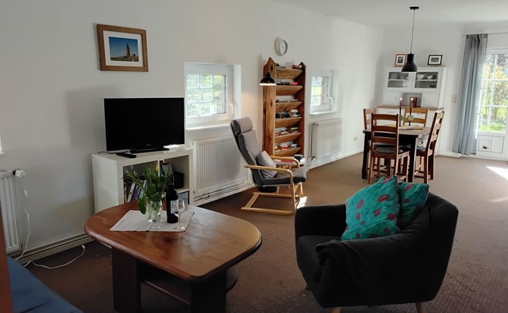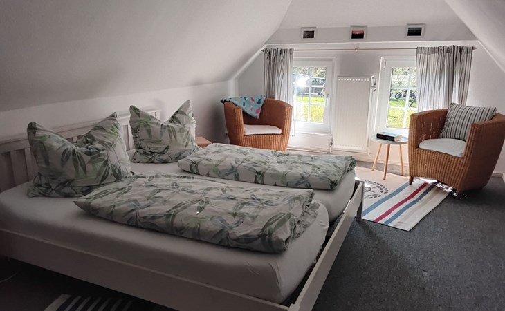 The 75m² house was extensively renovated in 2013. Two adults, two children and a dog can enjoy their holiday here from the very first moment. The two bedrooms are on the upper floor, each with a double bed, and a cot can be provided on request free of charge. The lower floor has a shower room and a big living room flooded with daylight, comprising a kitchen unit, a dining space and a sofa corner. The kitchen unit is equipped with a three-ring ceramic hob, a cooker hood, a convection oven and a dishwasher, and an adjacent standing fridge with a big freezer compartment. The lounge corner provides a two-seater and a three-seater sofa, satellite TV and a DVD player.