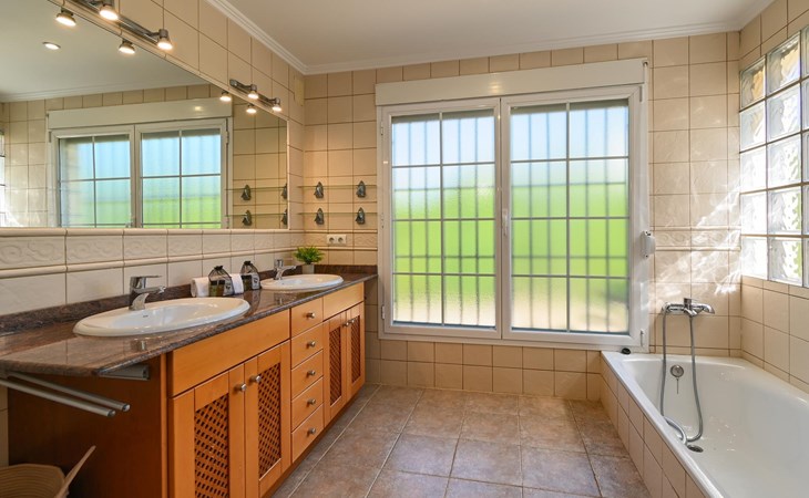 - en-suite bathroom with double washbasin, bath, shower, toilet and hairdryer