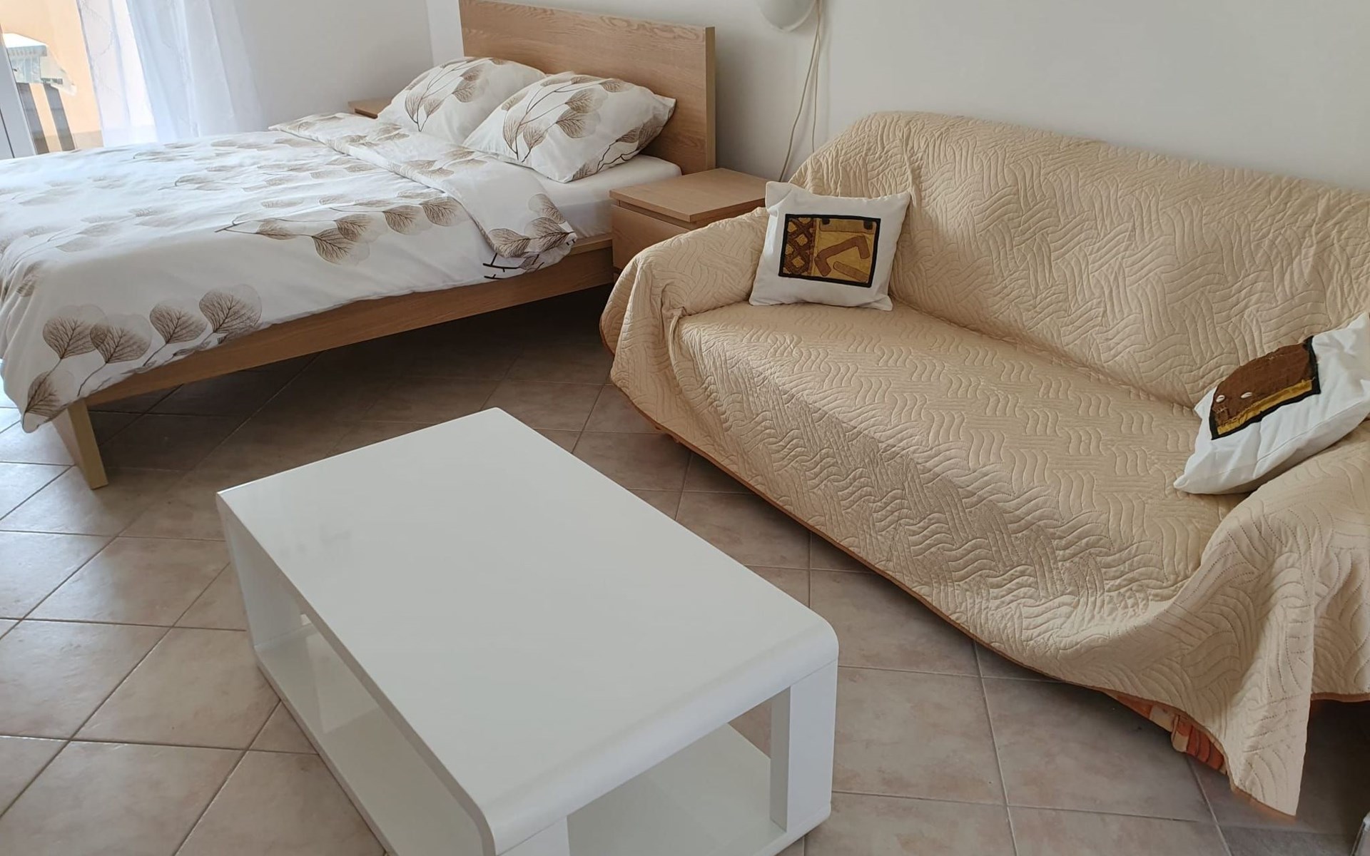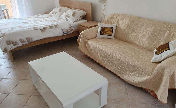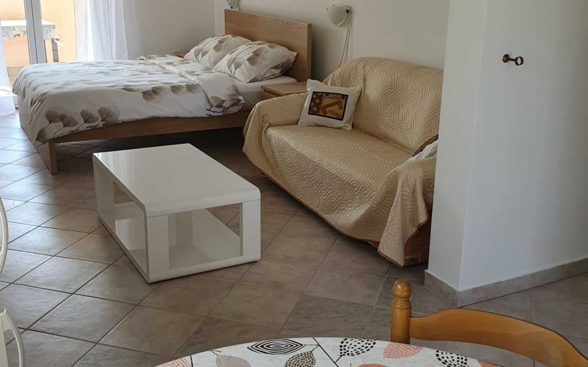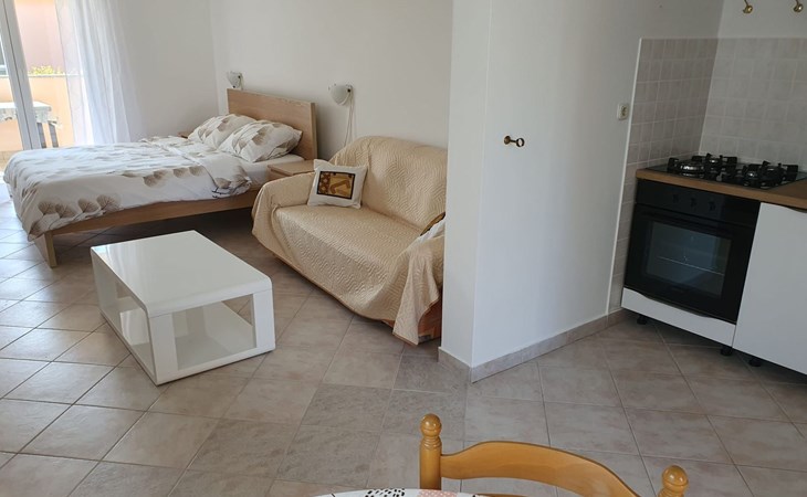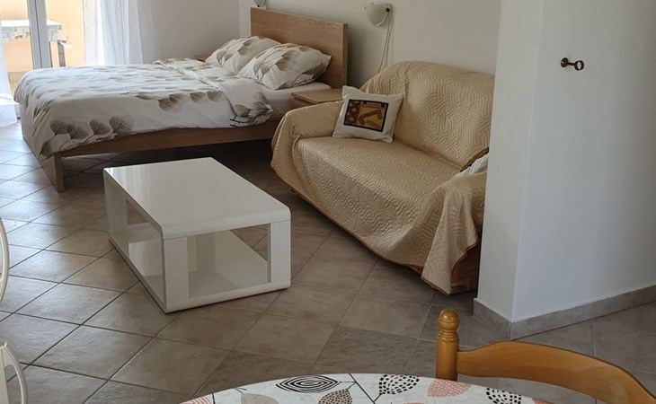 This 40m² studio is on the first floor. It has a double bed (180 x 200cm) and a sofa bed (140 x 200cm). Next to the living and sleeping area there is a dining area, followed by the kitchen unit with a gas stove, oven, fridge, coffee machine and kettle. The bathroom has a shower and WC.Features of the property: Object in residential areaOutside area: Fenced; Garden available; Parking spaces: 1; Private parking space; Terrace; Veranda; Wood grill; House information: 2nd double bed; Altitude above sea level: 100 m; Barrier-free access; Bathrooms: 1; Bedroom; Bicycle rental: 0,70 km; Floor: 0; Property area: 2500 m²; Total number of floors in the building: 1; Year of construction: 2002; Year of renovation: 2015; Living area: Double sofa; Safe; Satellite-tv; TV; Kitchen: Coffee machine; Freezer; Fridge; Gas stove; Oven; Toaster; Water boiler; Other: Air conditioning; Fishing; Hand wash; Heating; Owner lives on the property; Pets allowed: max. 1; Wifi all-inclusive package; Distances (linear, approx.): Canoe for rent: 0,70 km; Distance Bar / Club: 7,00 km; Distance hiking trail: 0,10 km; Distance to airport: 10,00 km; Distance to beach: 0,10 km; Distance to buoy: 0,10 km; Distance to cafés/ restaurants: 50 m; Distance to concrete beach: 0,70 km; Distance to fishing: 0,10 km; Distance to food market: 1,00 km; Distance to grass beach: 0,50 km; Distance to moorings: 0,10 km; Distance to next public transport stop: 1,00 km; Distance to pebble beach: 0,70 km; Distance to railway station: 10,00 km; Distance to sand beach: 0,10 km; Distance to tennis court: 1,00 km; Distance to the sea: 0,10 km; Distance to water sports: 1,00 km; Distance to water: 0,10 km; Next location: 1,00 km; Riding facilities: 7,00 km; Surfboard rental: 0,70 km;Short descriptionOther : Handicapped and wheelchair accessibleSurroundingNearby sports facilities : FishingRental Facilities : Bicycle rental serviceGarden and outdoorGarden facilities : GrillOutside area: Garden available; Grill; Parking spaces: 1; Private parking space; Terrace; Veranda; House information: Barrier-free access; Bathrooms: 1; Bedroom; Bicycle rental: 0,00 km; Property area: 2500 m²; Living area: Satellite-tv; TV; Kitchen: Coffee machine; Fridge; Gas stove; Oven; Toaster; Water boiler; Other: Air conditioning; Fishing; Heating; Internet; Pets allowed: max. 1; Washing machine; Distances (linear, approx.): Distance to airport: 10,00 km; Distance to cafés/ restaurants: 50 m; Distance to fishing: 0,10 km; Distance to railway station: 10,00 km; Distance to the sea: 0,10 km;Short descriptionOther : Handicapped and wheelchair accessibleSurroundingNearby sports facilities : FishingRental Facilities : Bicycle rental serviceGarden and outdoorGarden facilities : Grill