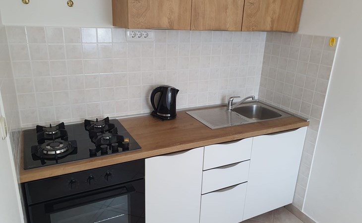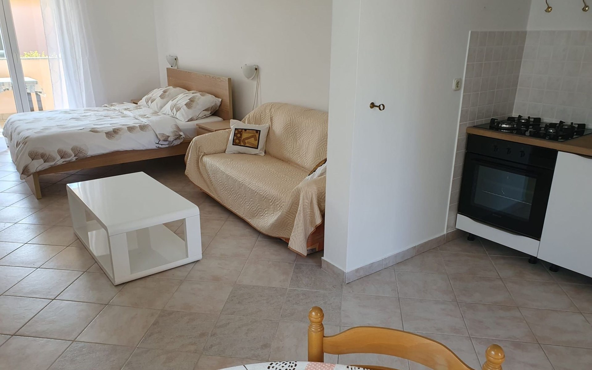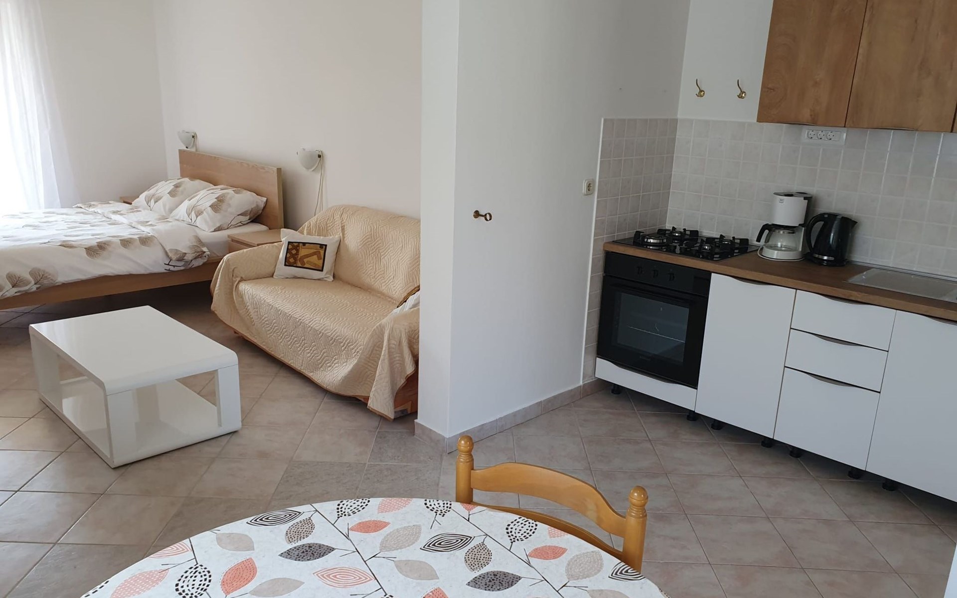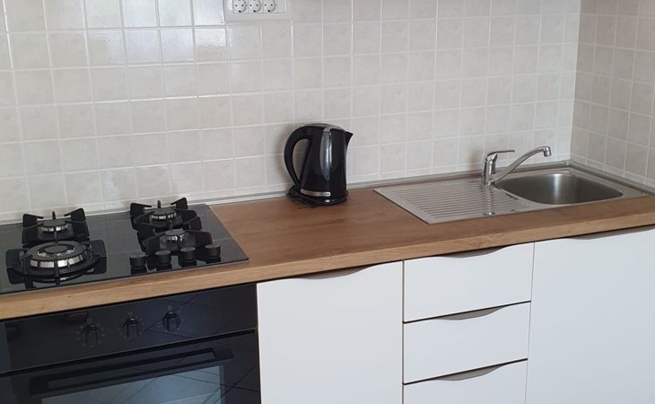 This 40m² studio is on the first floor. It has a double bed (180 x 200cm) and a sofa bed (140 x 200cm). Next to the living and sleeping area there is a dining area, followed by the kitchen unit with a gas stove, oven, fridge, coffee machine and kettle. The bathroom has a shower and WC.Features of the property: Object in residential areaOutside area: Fenced; Garden available; Parking spaces: 1; Private parking space; Terrace; Veranda; Wood grill; House information: 2nd double bed; Altitude above sea level: 100 m; Barrier-free access; Bathrooms: 1; Bedroom; Bicycle rental: 0,70 km; Floor: 0; Property area: 2500 m²; Total number of floors in the building: 1; Year of construction: 2002; Year of renovation: 2015; Living area: Double sofa; Safe; Satellite-tv; TV; Kitchen: Coffee machine; Freezer; Fridge; Gas stove; Oven; Toaster; Water boiler; Other: Air conditioning; Fishing; Hand wash; Heating; Owner lives on the property; Pets allowed: max. 1; Wifi all-inclusive package; Distances (linear, approx.): Canoe for rent: 0,70 km; Distance Bar / Club: 7,00 km; Distance hiking trail: 0,10 km; Distance to airport: 10,00 km; Distance to beach: 0,10 km; Distance to buoy: 0,10 km; Distance to cafés/ restaurants: 50 m; Distance to concrete beach: 0,70 km; Distance to fishing: 0,10 km; Distance to food market: 1,00 km; Distance to grass beach: 0,50 km; Distance to moorings: 0,10 km; Distance to next public transport stop: 1,00 km; Distance to pebble beach: 0,70 km; Distance to railway station: 10,00 km; Distance to sand beach: 0,10 km; Distance to tennis court: 1,00 km; Distance to the sea: 0,10 km; Distance to water sports: 1,00 km; Distance to water: 0,10 km; Next location: 1,00 km; Riding facilities: 7,00 km; Surfboard rental: 0,70 km;Short descriptionOther : Handicapped and wheelchair accessibleSurroundingNearby sports facilities : FishingRental Facilities : Bicycle rental serviceGarden and outdoorGarden facilities : GrillOutside area: Garden available; Grill; Parking spaces: 1; Private parking space; Terrace; Veranda; House information: Barrier-free access; Bathrooms: 1; Bedroom; Bicycle rental: 0,00 km; Property area: 2500 m²; Living area: Satellite-tv; TV; Kitchen: Coffee machine; Fridge; Gas stove; Oven; Toaster; Water boiler; Other: Air conditioning; Fishing; Heating; Internet; Pets allowed: max. 1; Washing machine; Distances (linear, approx.): Distance to airport: 10,00 km; Distance to cafés/ restaurants: 50 m; Distance to fishing: 0,10 km; Distance to railway station: 10,00 km; Distance to the sea: 0,10 km;Short descriptionOther : Handicapped and wheelchair accessibleSurroundingNearby sports facilities : FishingRental Facilities : Bicycle rental serviceGarden and outdoorGarden facilities : Grill