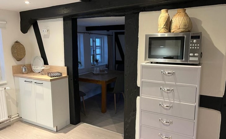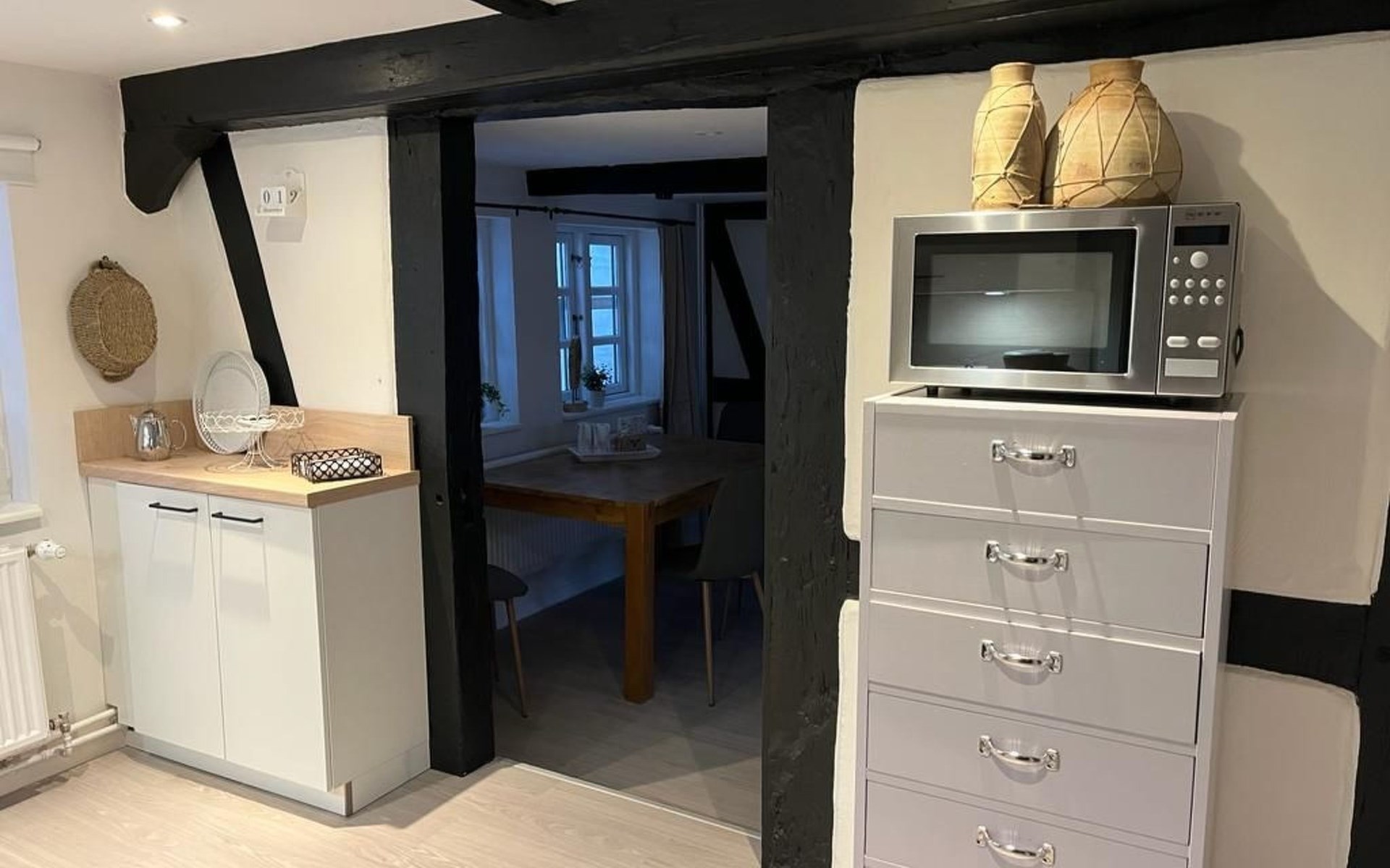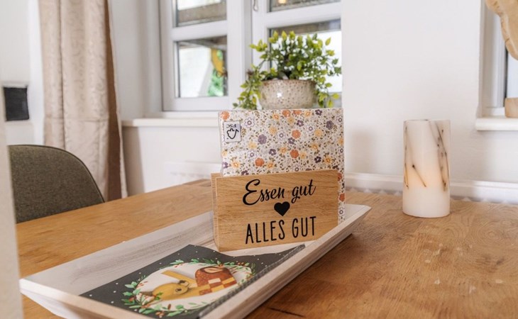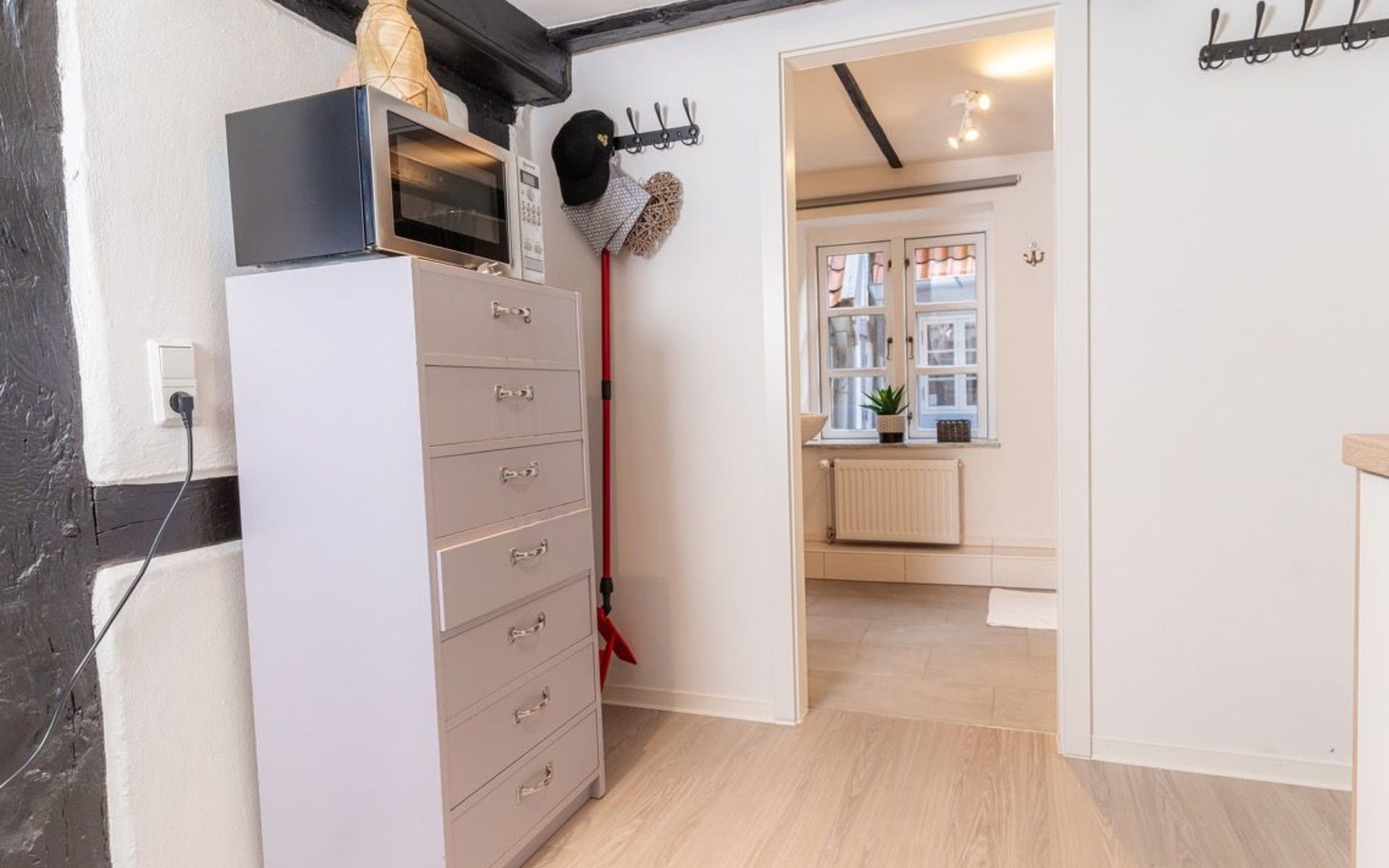 Inside, you will find a practically furnished holiday flat equipped with all the necessary amenities to make your stay as pleasant as possible. A washing machine and tumble dryer for your exclusive use ensure that you always have fresh clothes to hand, even when travelling for longer periods. The kitchen is equipped with a filter coffee machine, kettle and dishwasher, making preparing meals and cleaning up afterwards a breeze.
