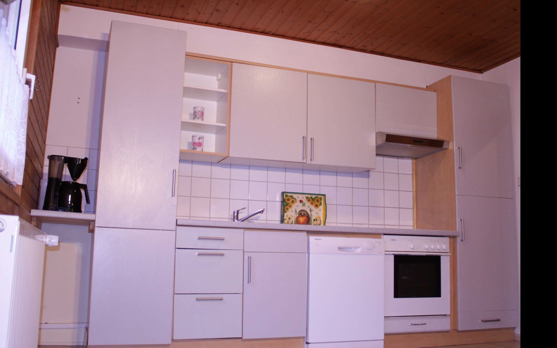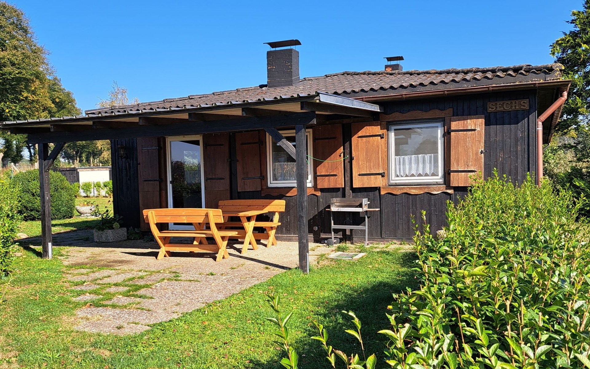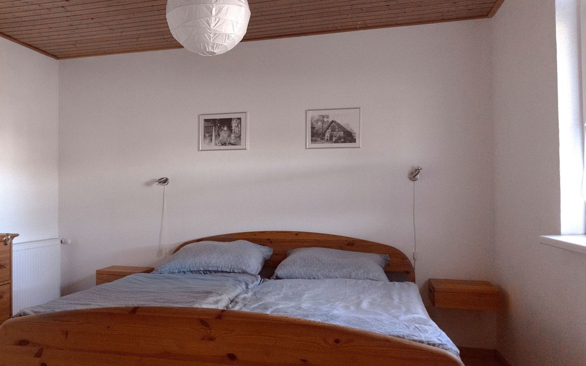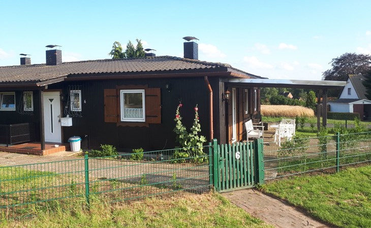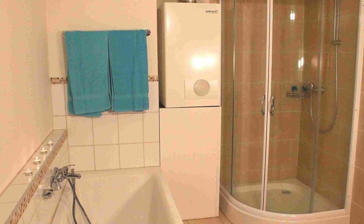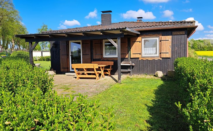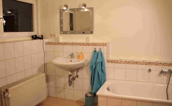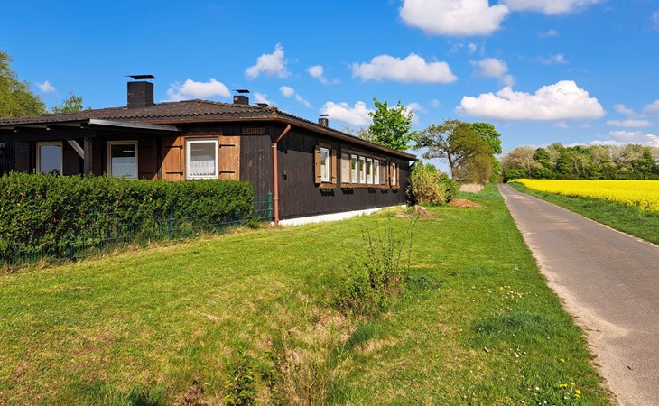 The so-called "customs house" from the 1960s has been lovingly renovated and brought up to date. The interior creates a cosy atmosphere of rustic comfort and modern elements. The large garden and the covered terrace have been retained. The holiday accommodation extends over a living space of 70 m² and is divided into a bedroom, a large living room, a separate kitchen with dining area and a daylight bathroom. The heart of the flat is the stately living room, which has a bright laminate floor and a wonderful wood-burning stove that spreads cosiness in autumn, on cool spring days and of course in winter. Independently of this, central heating also keeps the house warm. Relax on the corner sofa after a day out, while the large flat-screen TV, a Blu-Ray player with a small selection of films and a hi-fi system provide entertainment. The bedroom sleeps two people in a double bed measuring 1.80 x 2.00 metres and has enough space for your clothes in a wardrobe and chest of drawers. The pine design is in keeping with the ambience of the holiday home. Here, too, you have a modern, light-coloured laminate floor. There is another wood-burning stove in the kitchen. Come in after a walk in the still cool spring or a golden autumn day, enjoy a hot soup and the firelight from the stove - the perfect welcome to your temporary home. The tiled kitchen allows for extensive self-catering with a four-zone ceramic hob with oven, fridge, dishwasher and the usual appliances such as a coffee machine, kettle and toaster. In the spacious bathroom, you can choose between a modern shower cubicle and a bathtub. You are welcome to leave your hairdryer at home, there is already one there. The use of WLAN is included.