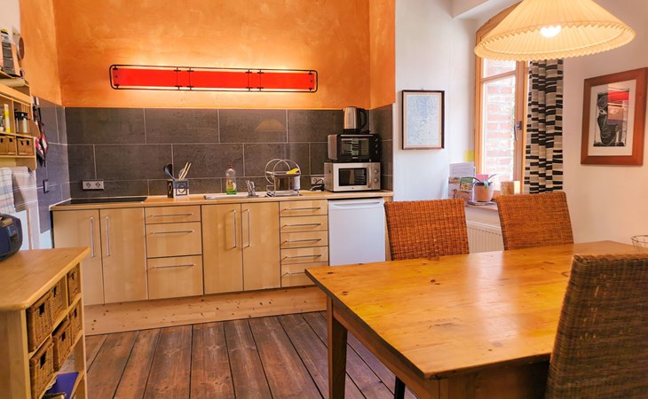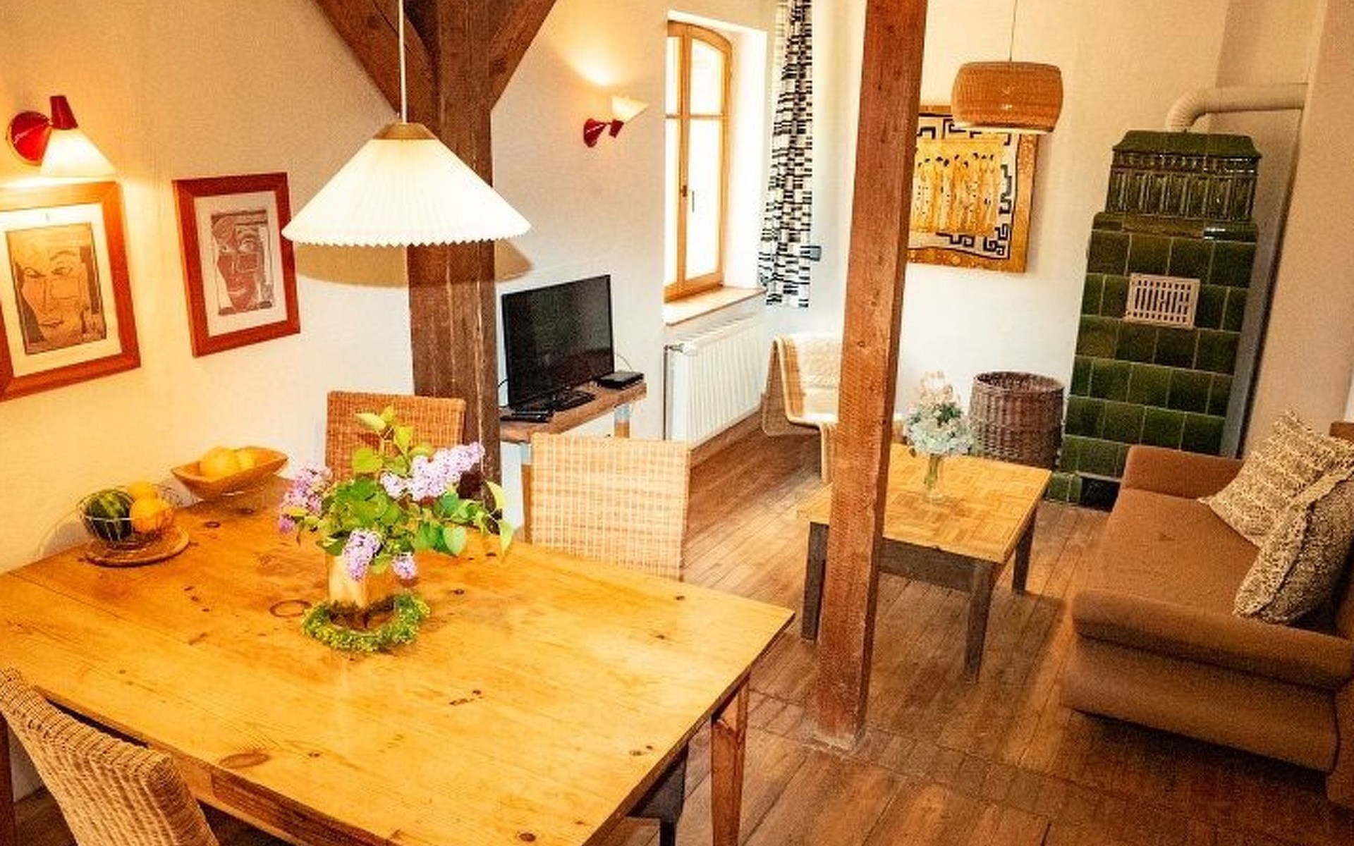 In this cosy holiday flat you will find everything you need for an uncomplicated stay. In addition to a bedroom that can be completely darkened, a pull-out sofa bed in the living area provides additional sleeping accommodation. The central heating and a beautiful tiled stove ensure cosiness on cooler days. The communal washing machine in the building is at your disposal, and the kitchen is equipped with amenities such as an induction hob, a filter coffee machine, a kettle and a mini oven.