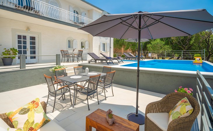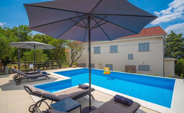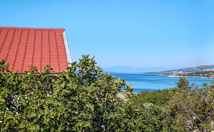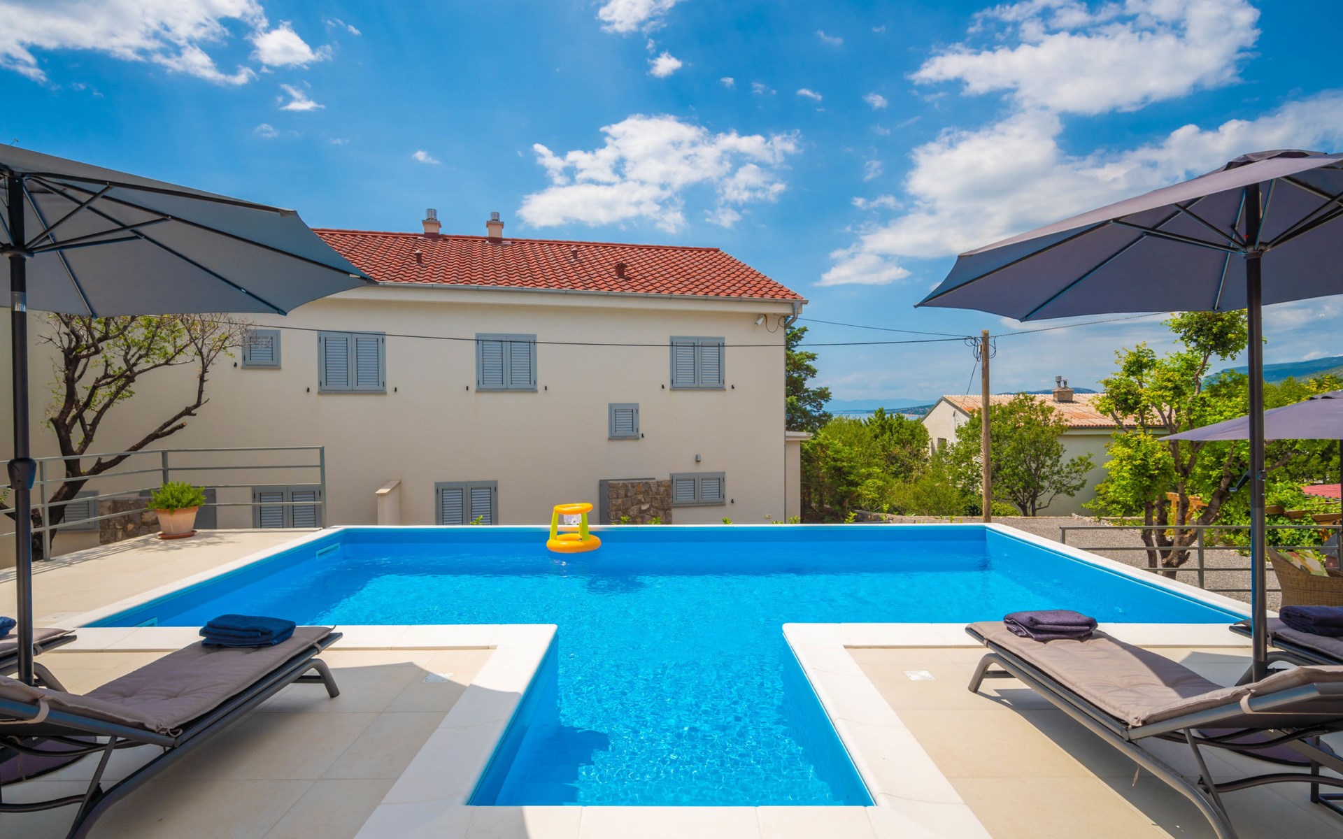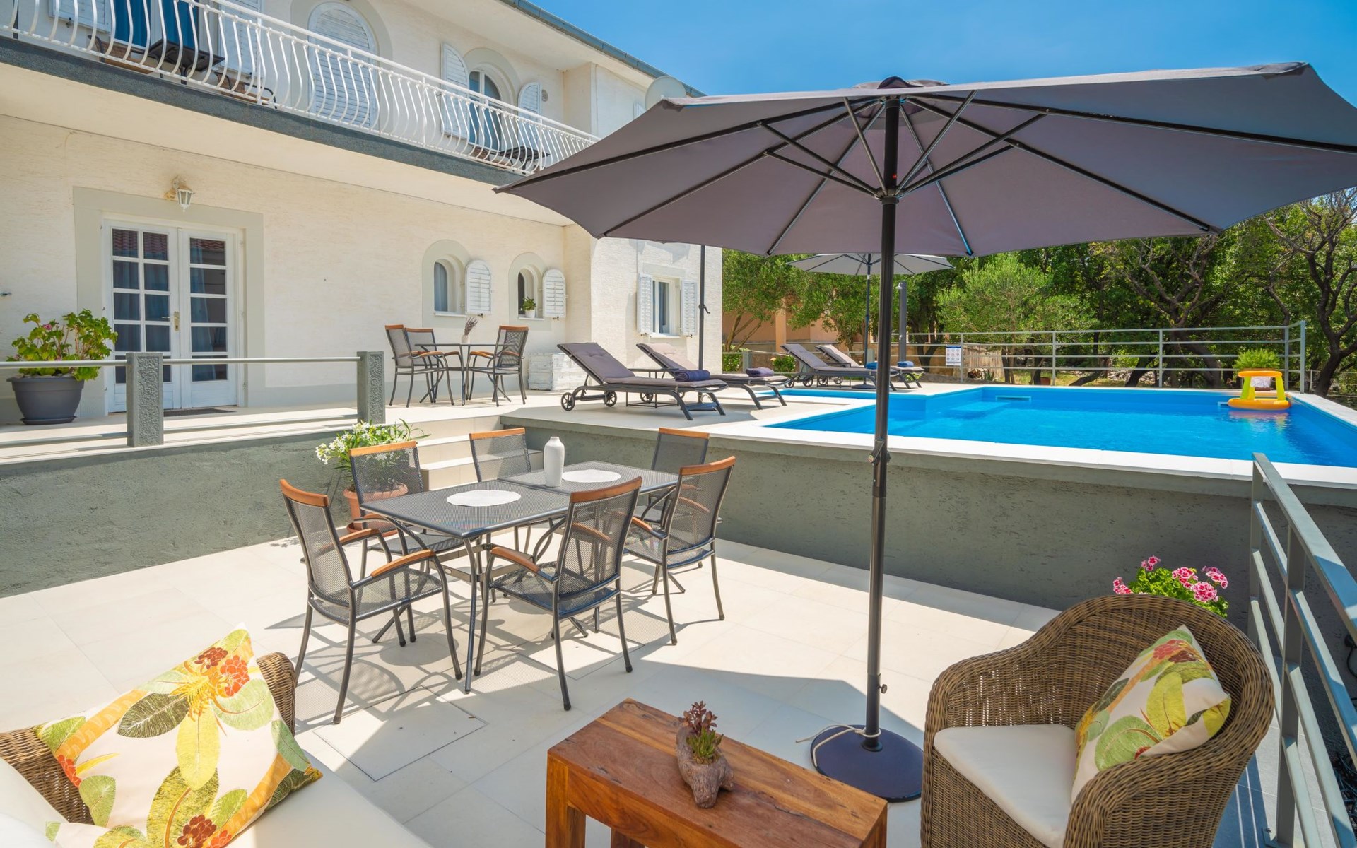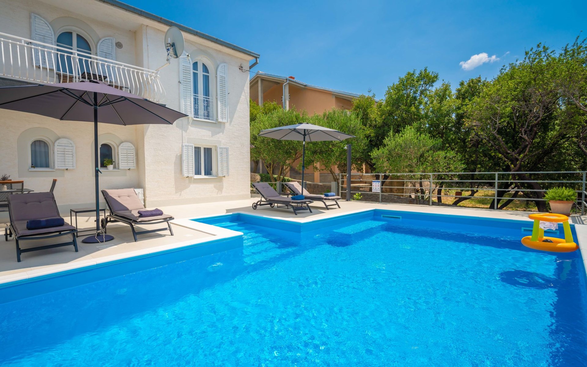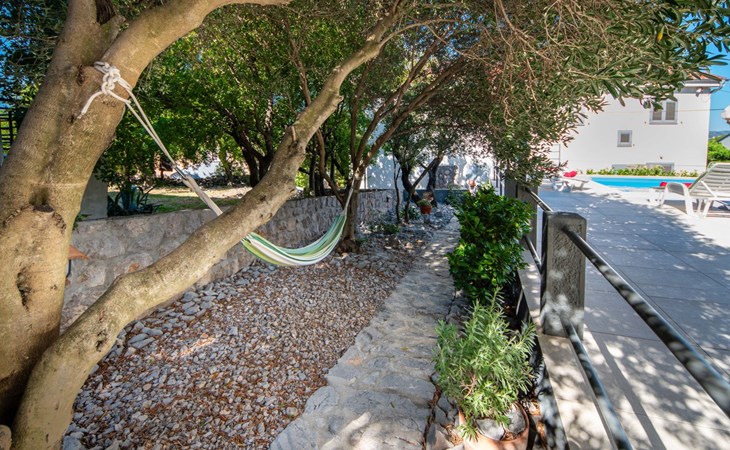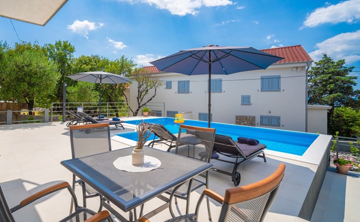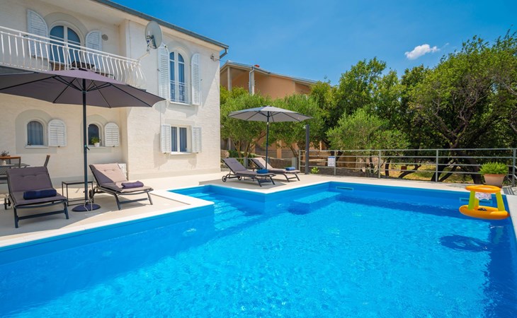 Klenovica 8 km from Novi Vinodolski: Single-family house "My Day House", 2 storeys. 600 m from the centre of Klenovica, in a quiet, sunny, elevated position, 350 m from the sea, 350 m from the beach, in a cul-de-sac. Private: property 1'000 m2 (fenced) with lawn 80 m2 wildlife garden, swimming pool angular (8 x 4 m, depth 150 cm, seasonal availability: 01.May. - 30.Sep.) with internal staircase. Outdoor shower, terrace (150 m2), garden furniture, barbecue. In the house: internet access, washing machine. Parking (for 6 cars) at the house on the premises. Shop, restaurant 600 m, bus stop 950 m, pebble beach 350 m. Groups of teenagers on request only. By groups of young people double deposit is requested on arrival. The house consists of 3 apartments rented as one unit.