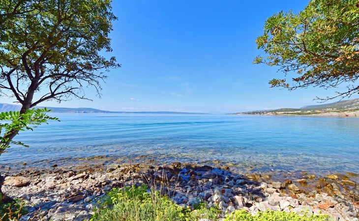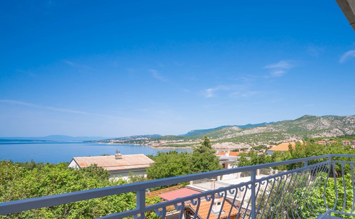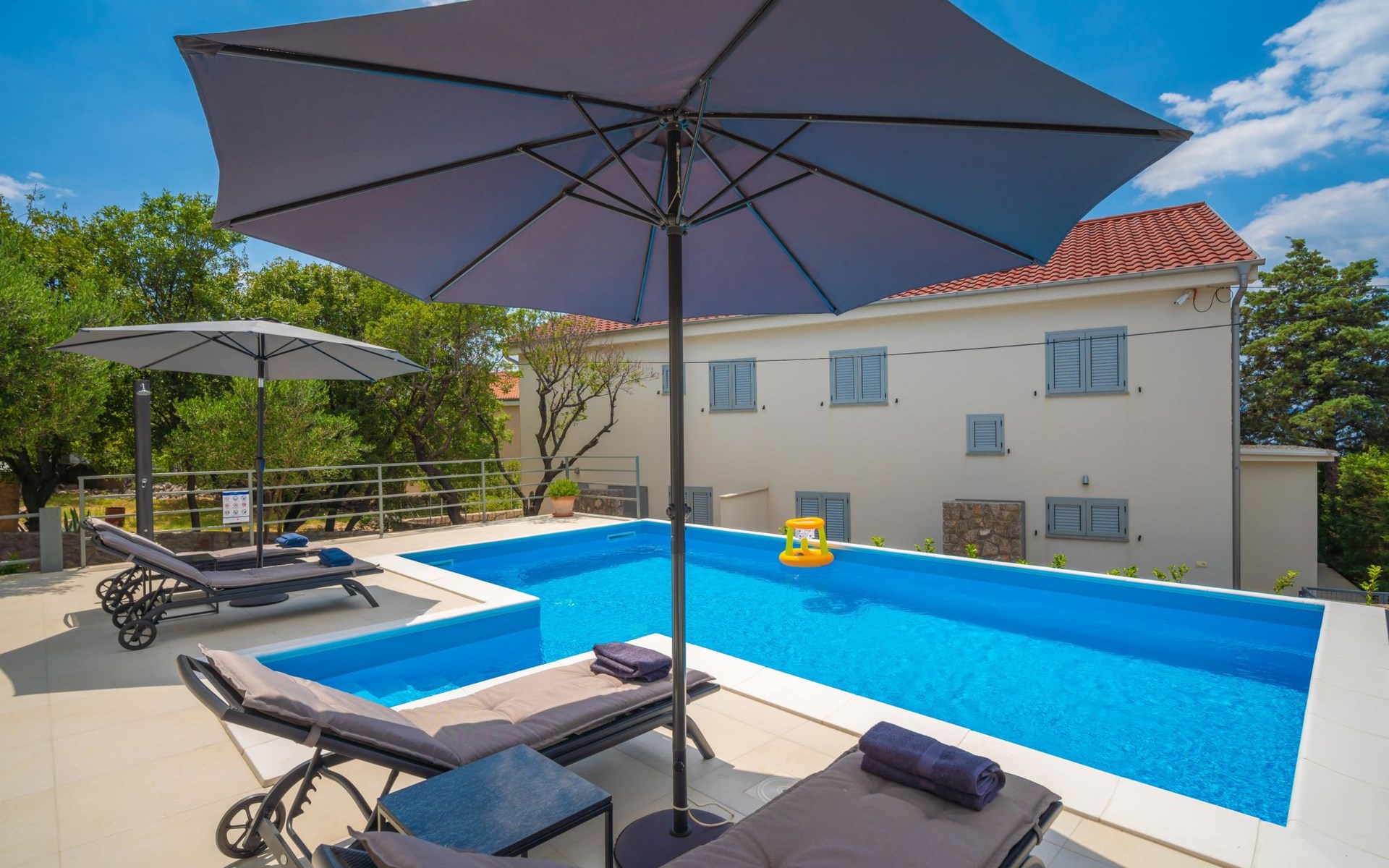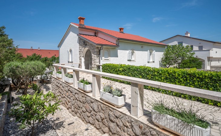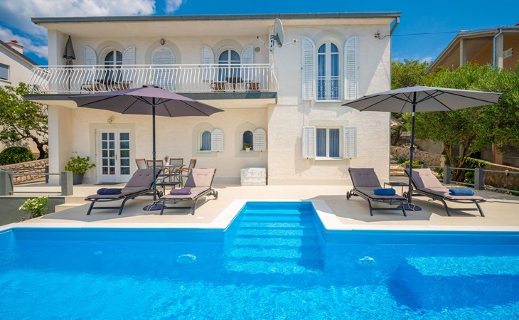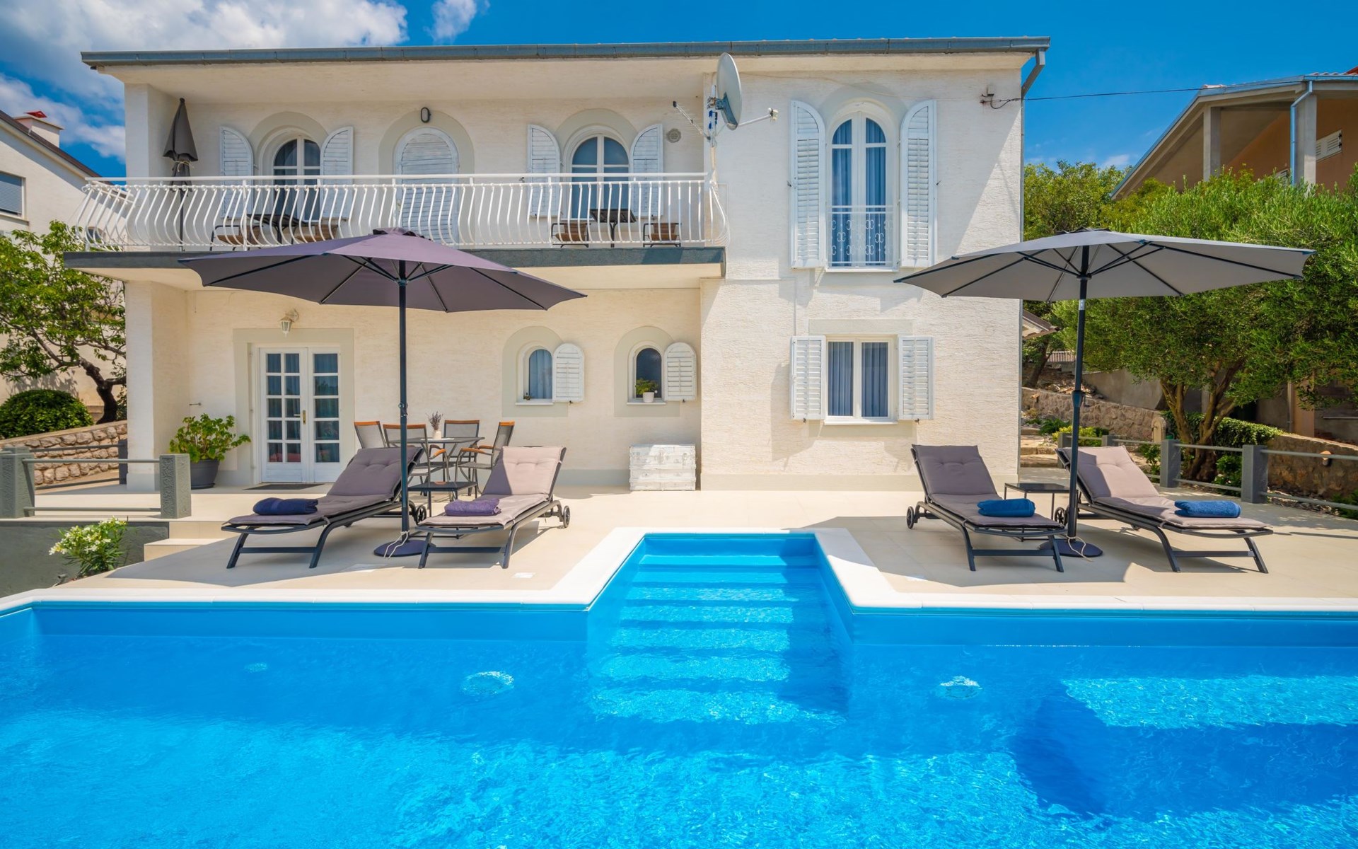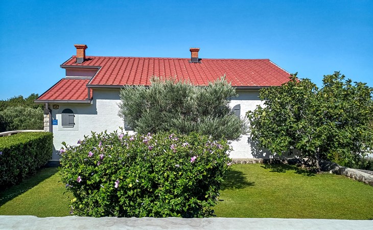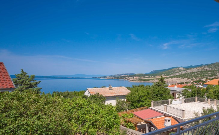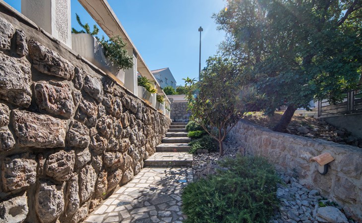 Klenovica 8 km from Novi Vinodolski: Single-family house "My Day House", 2 storeys. 600 m from the centre of Klenovica, in a quiet, sunny, elevated position, 350 m from the sea, 350 m from the beach, in a cul-de-sac. Private: property 1'000 m2 (fenced) with lawn 80 m2 wildlife garden, swimming pool angular (8 x 4 m, depth 150 cm, seasonal availability: 01.May. - 30.Sep.) with internal staircase. Outdoor shower, terrace (150 m2), garden furniture, barbecue. In the house: internet access, washing machine. Parking (for 6 cars) at the house on the premises. Shop, restaurant 600 m, bus stop 950 m, pebble beach 350 m. Groups of teenagers on request only. By groups of young people double deposit is requested on arrival. The house consists of 3 apartments rented as one unit.