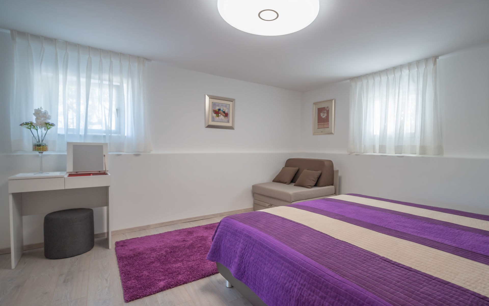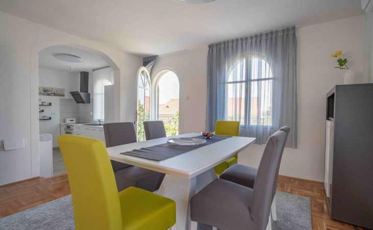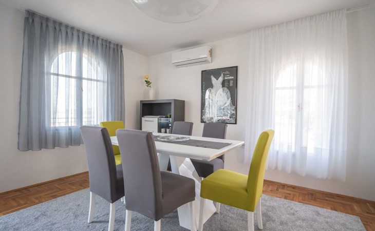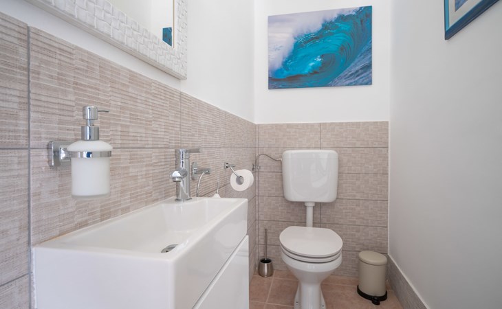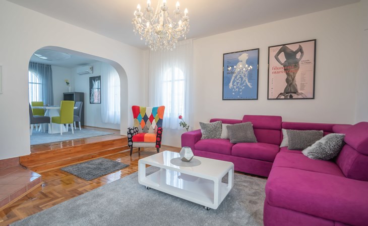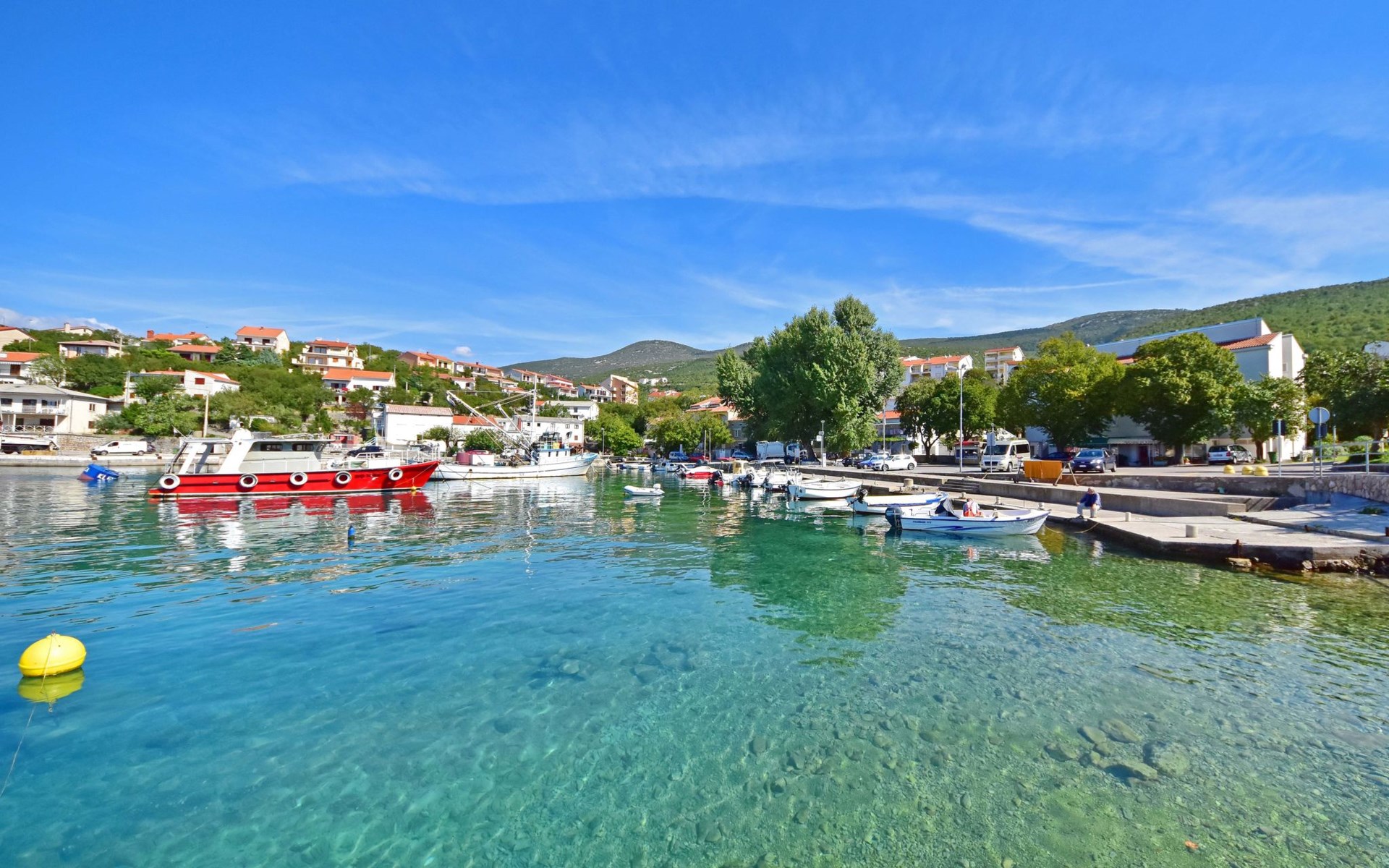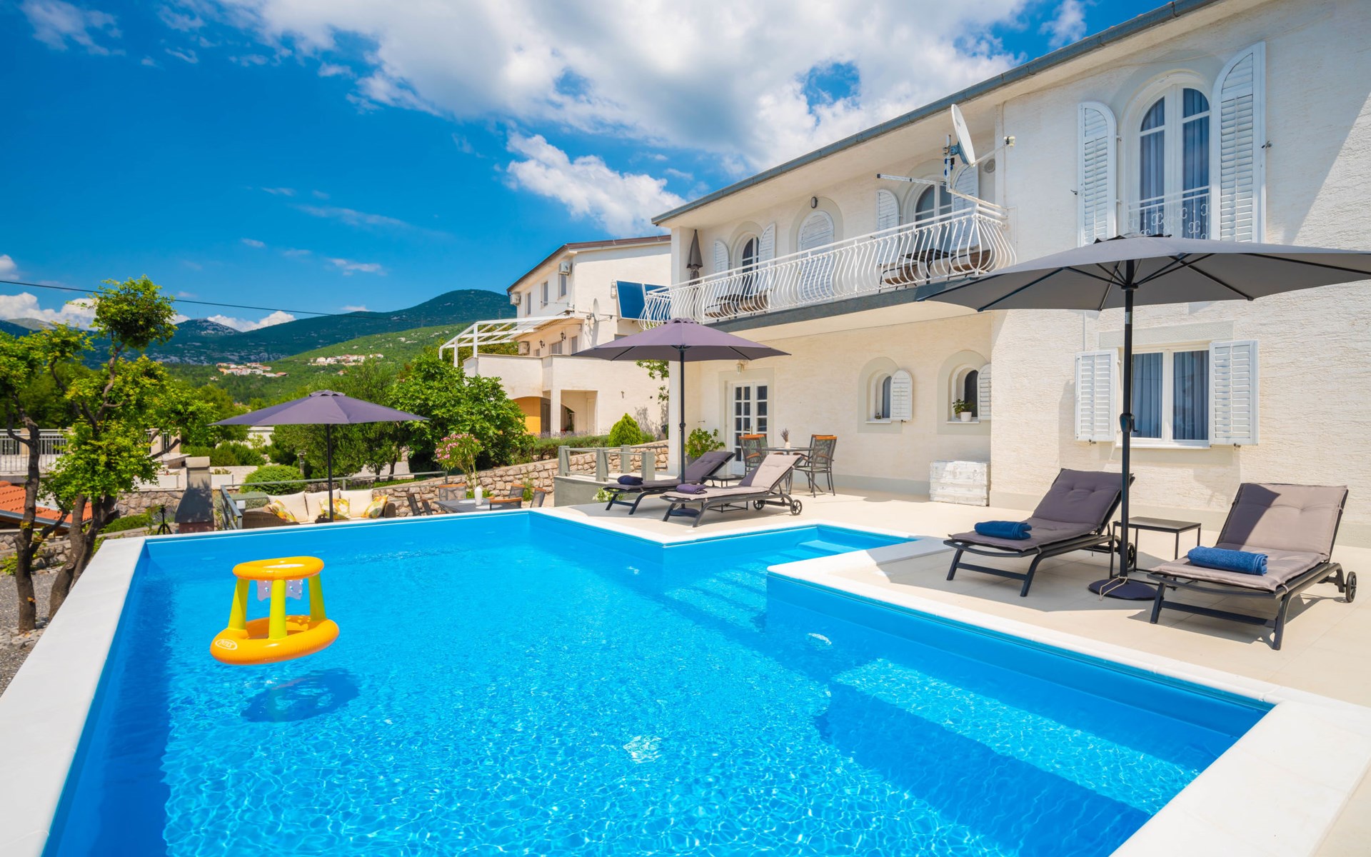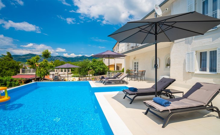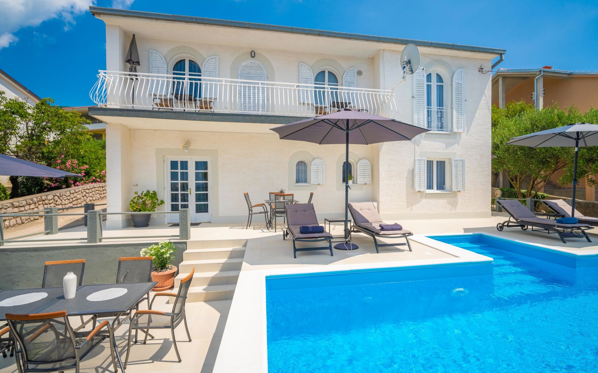 Klenovica 8 km from Novi Vinodolski: Single-family house "My Day House", 2 storeys. 600 m from the centre of Klenovica, in a quiet, sunny, elevated position, 350 m from the sea, 350 m from the beach, in a cul-de-sac. Private: property 1'000 m2 (fenced) with lawn 80 m2 wildlife garden, swimming pool angular (8 x 4 m, depth 150 cm, seasonal availability: 01.May. - 30.Sep.) with internal staircase. Outdoor shower, terrace (150 m2), garden furniture, barbecue. In the house: internet access, washing machine. Parking (for 6 cars) at the house on the premises. Shop, restaurant 600 m, bus stop 950 m, pebble beach 350 m. Groups of teenagers on request only. By groups of young people double deposit is requested on arrival. The house consists of 3 apartments rented as one unit.