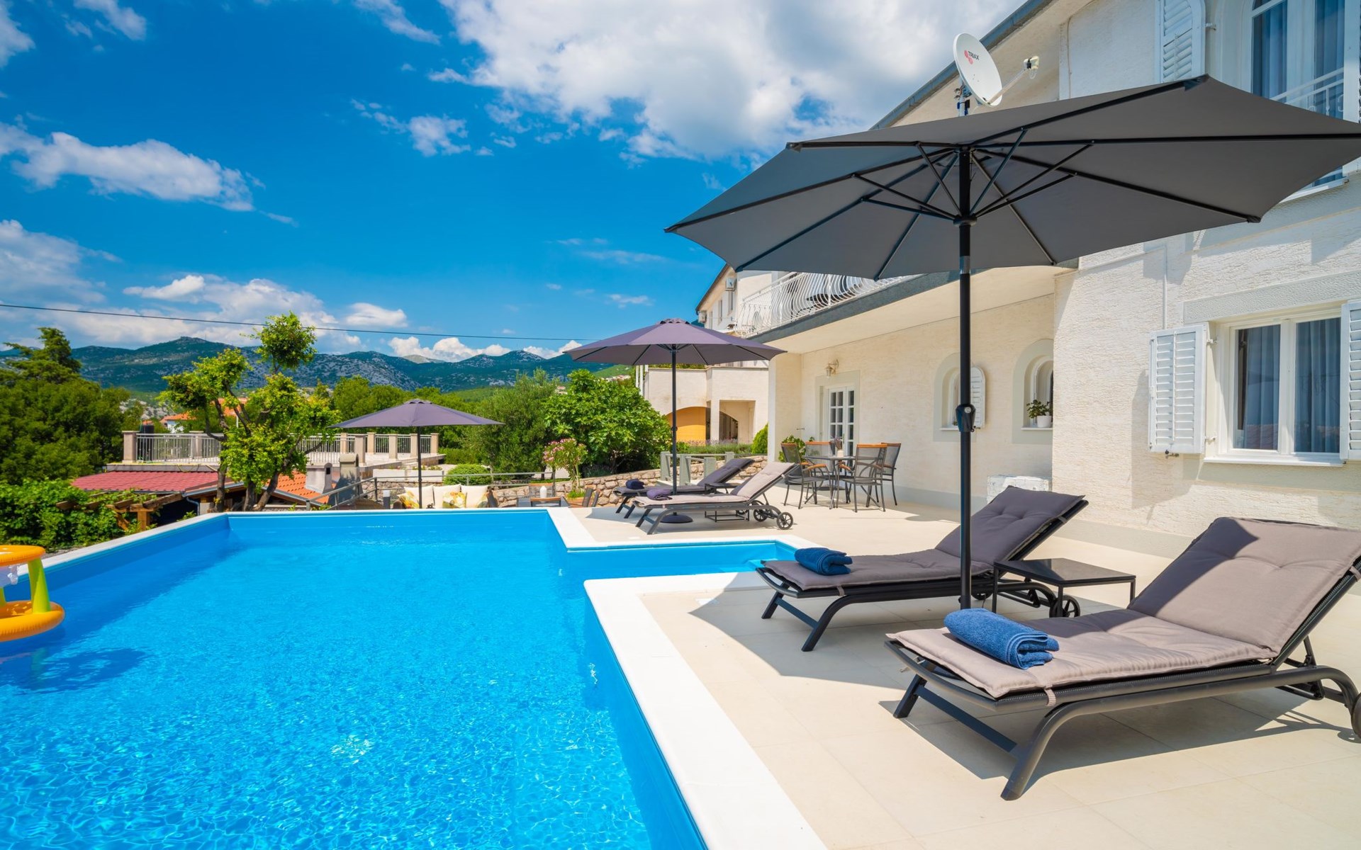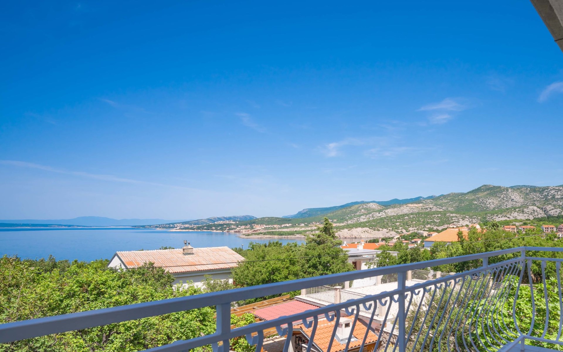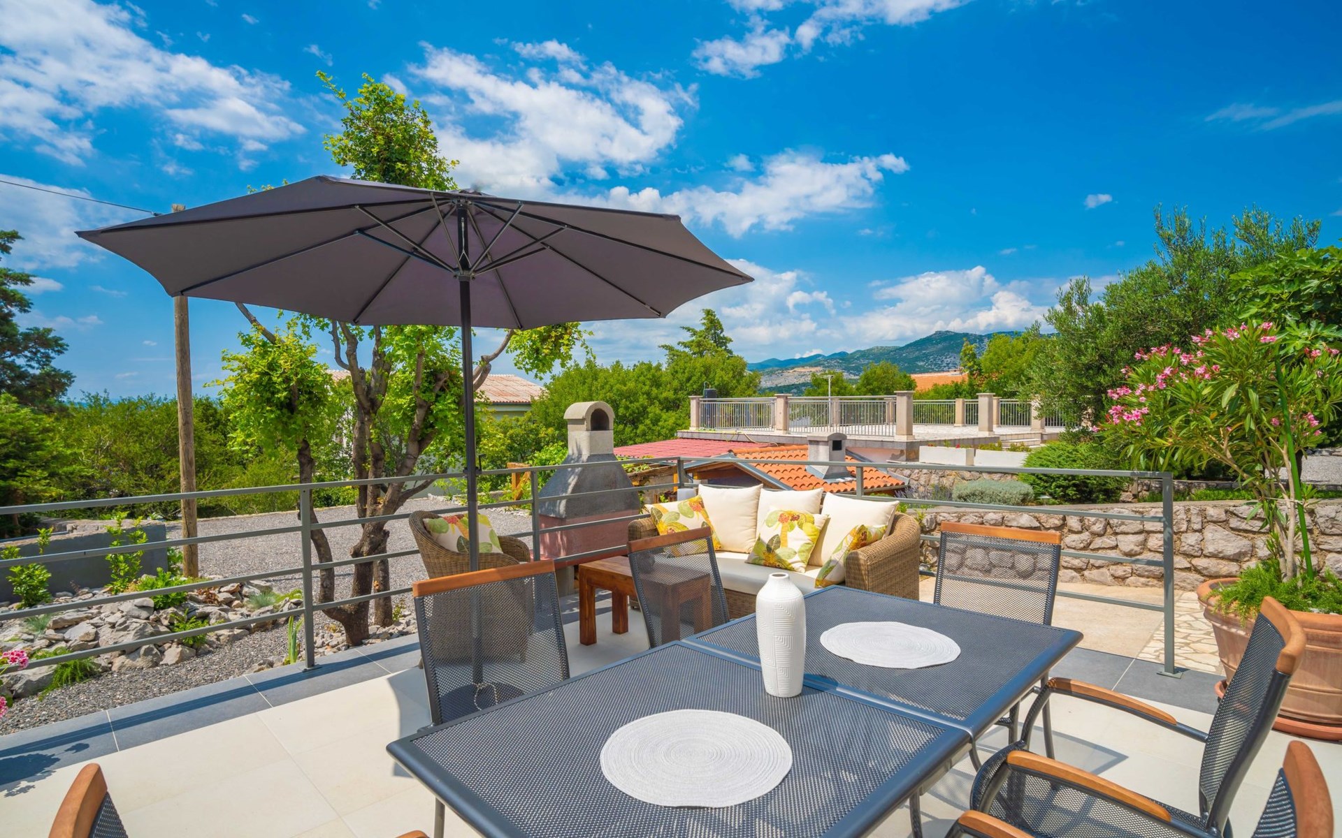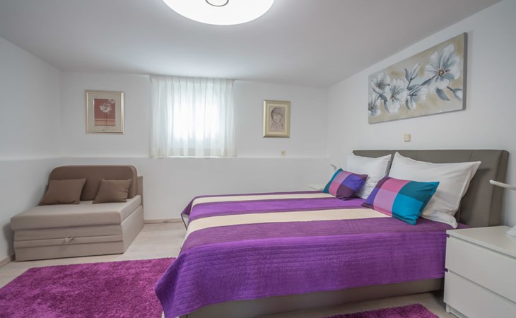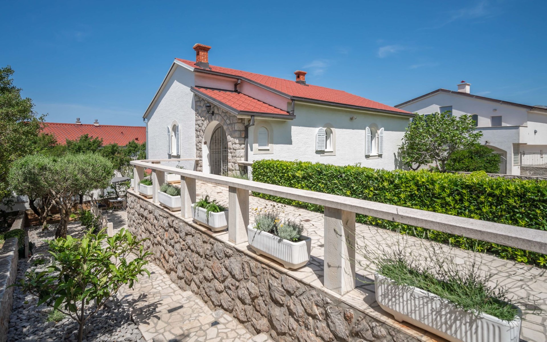 Klenovica 8 km from Novi Vinodolski: Single-family house "My Day House", 2 storeys. 600 m from the centre of Klenovica, in a quiet, sunny, elevated position, 350 m from the sea, 350 m from the beach, in a cul-de-sac. Private: property 1'000 m2 (fenced) with lawn 80 m2 wildlife garden, swimming pool angular (8 x 4 m, depth 150 cm, seasonal availability: 01.May. - 30.Sep.) with internal staircase. Outdoor shower, terrace (150 m2), garden furniture, barbecue. In the house: internet access, washing machine. Parking (for 6 cars) at the house on the premises. Shop, restaurant 600 m, bus stop 950 m, pebble beach 350 m. Groups of teenagers on request only. By groups of young people double deposit is requested on arrival. The house consists of 3 apartments rented as one unit.