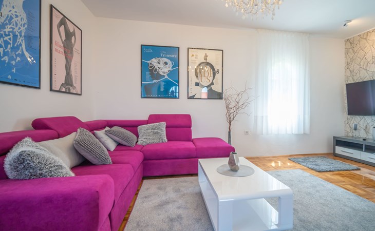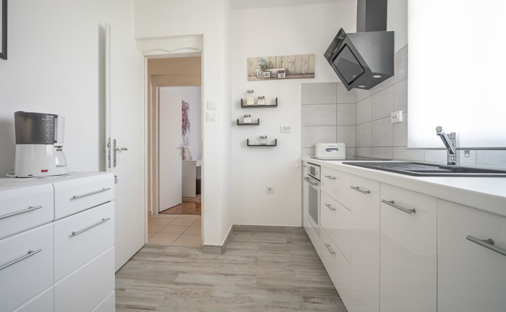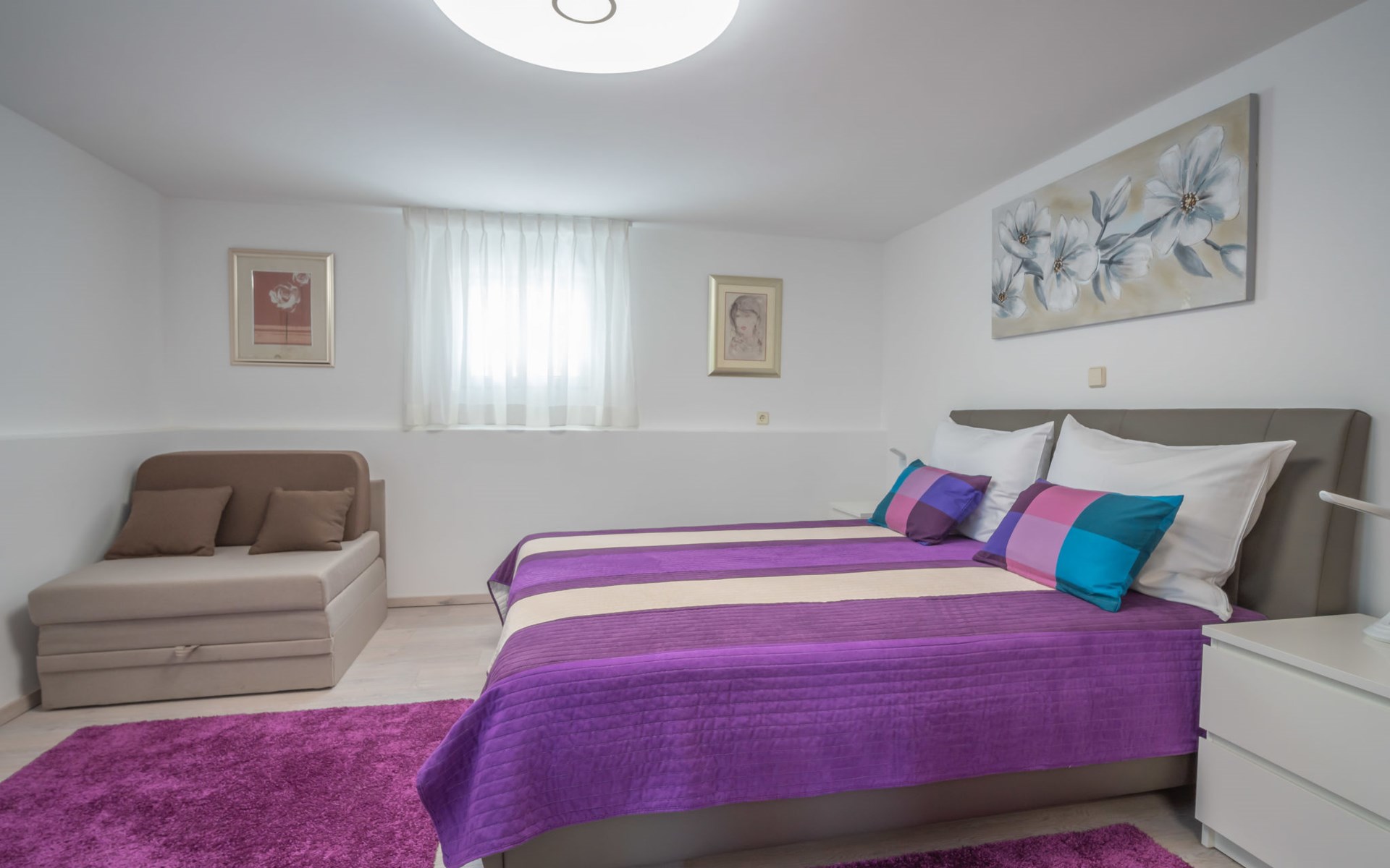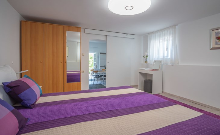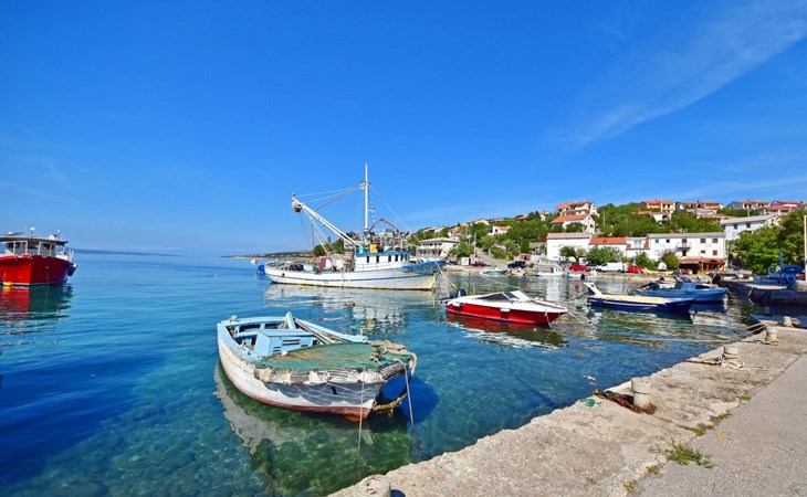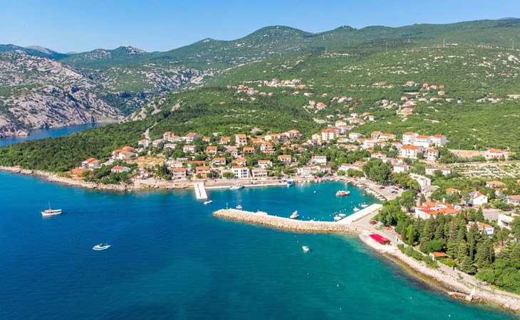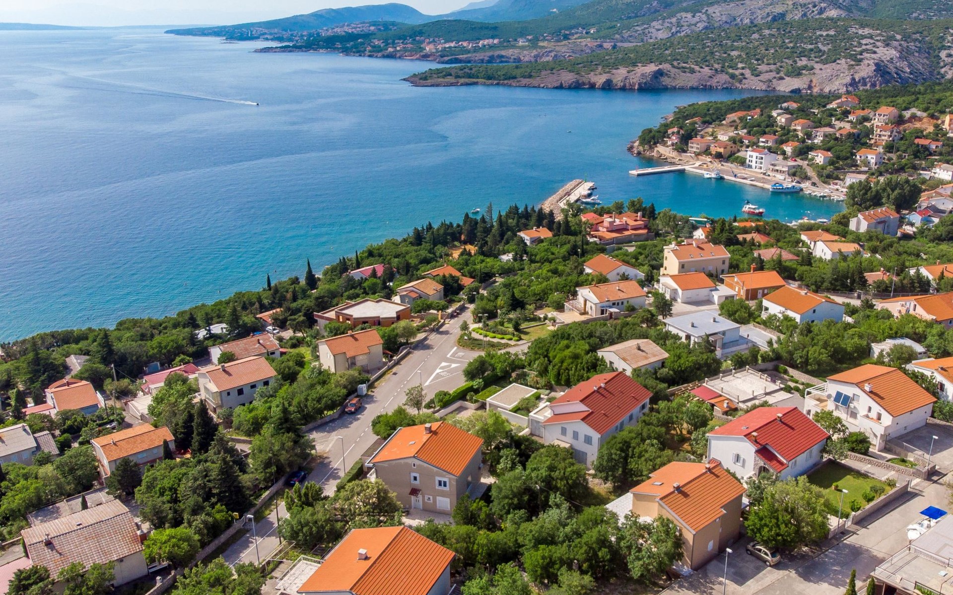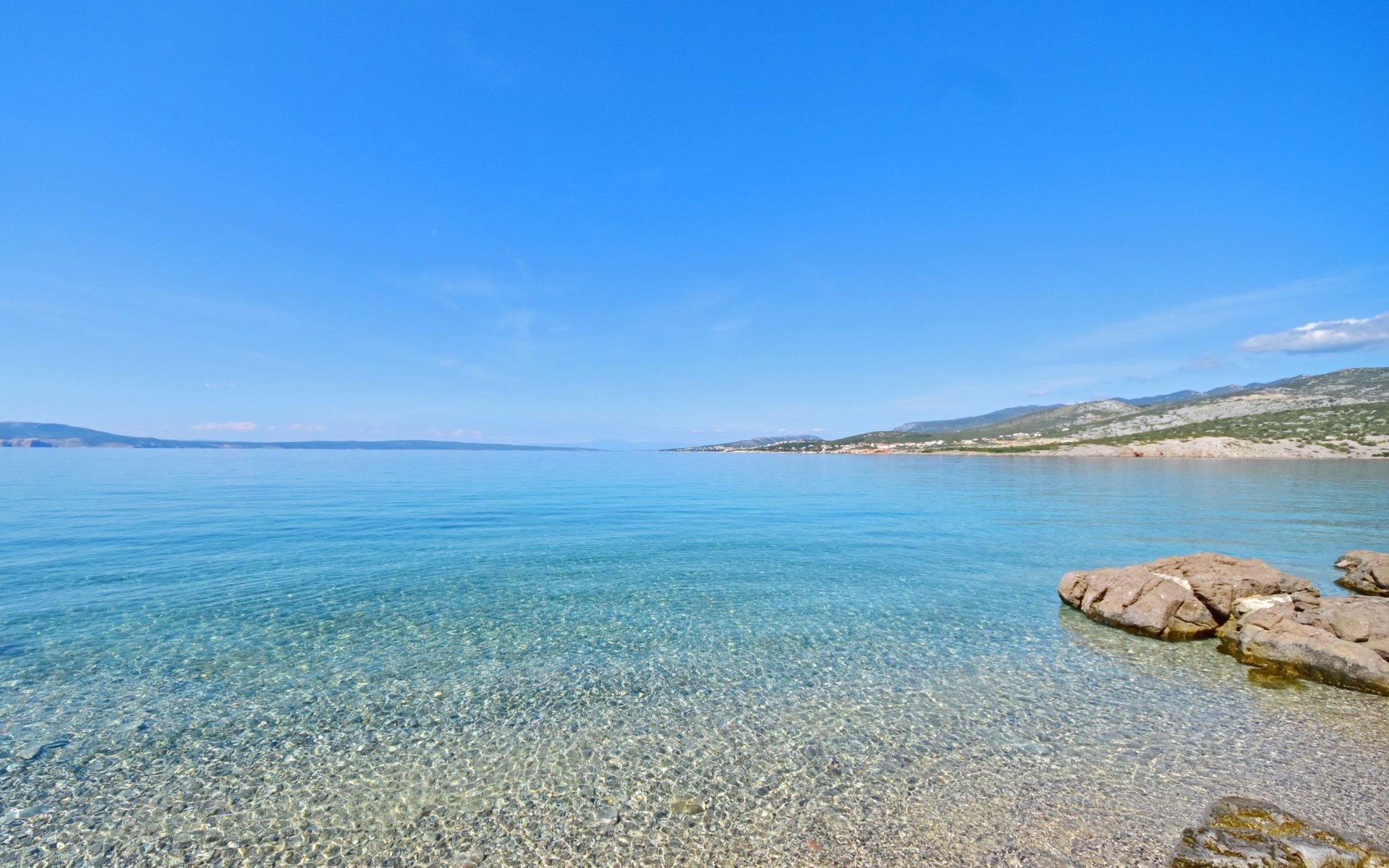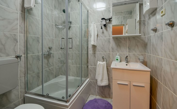 Klenovica 8 km from Novi Vinodolski: Single-family house "My Day House", 2 storeys. 600 m from the centre of Klenovica, in a quiet, sunny, elevated position, 350 m from the sea, 350 m from the beach, in a cul-de-sac. Private: property 1'000 m2 (fenced) with lawn 80 m2 wildlife garden, swimming pool angular (8 x 4 m, depth 150 cm, seasonal availability: 01.May. - 30.Sep.) with internal staircase. Outdoor shower, terrace (150 m2), garden furniture, barbecue. In the house: internet access, washing machine. Parking (for 6 cars) at the house on the premises. Shop, restaurant 600 m, bus stop 950 m, pebble beach 350 m. Groups of teenagers on request only. By groups of young people double deposit is requested on arrival. The house consists of 3 apartments rented as one unit.