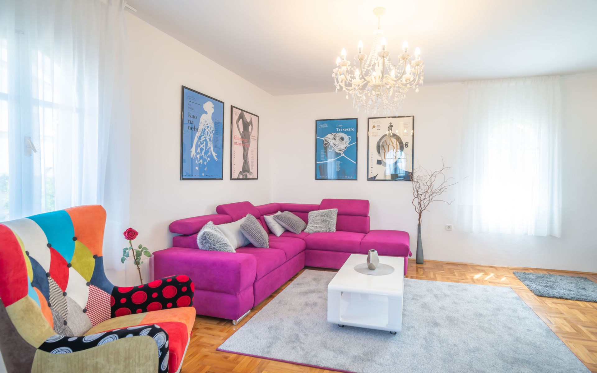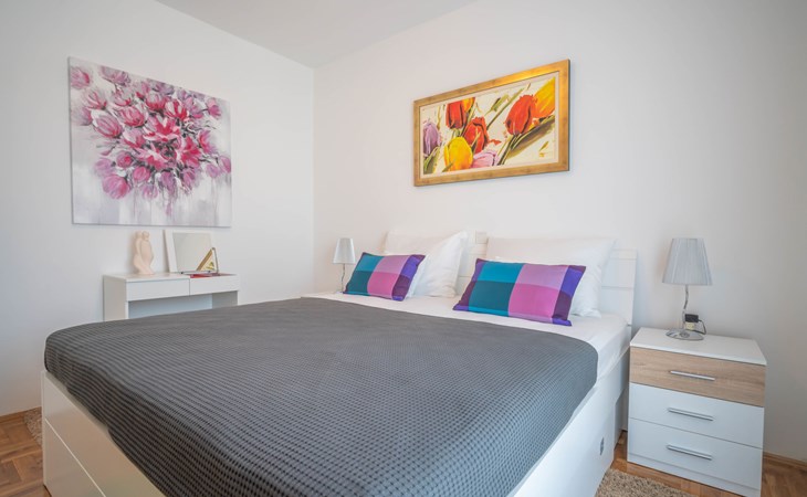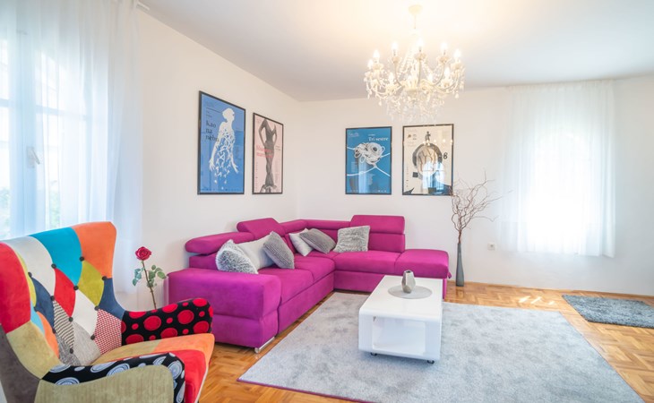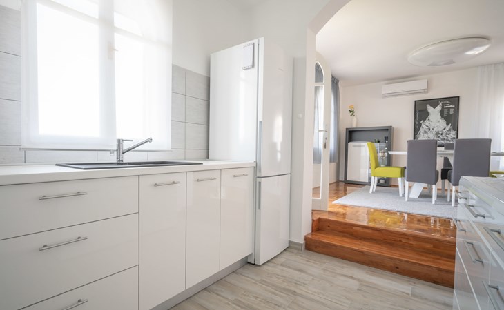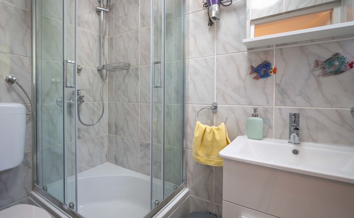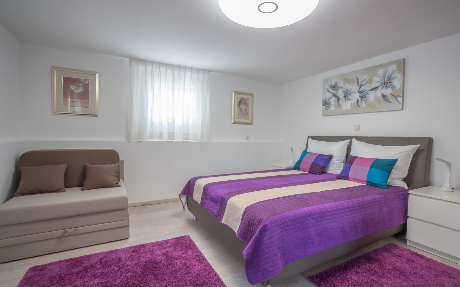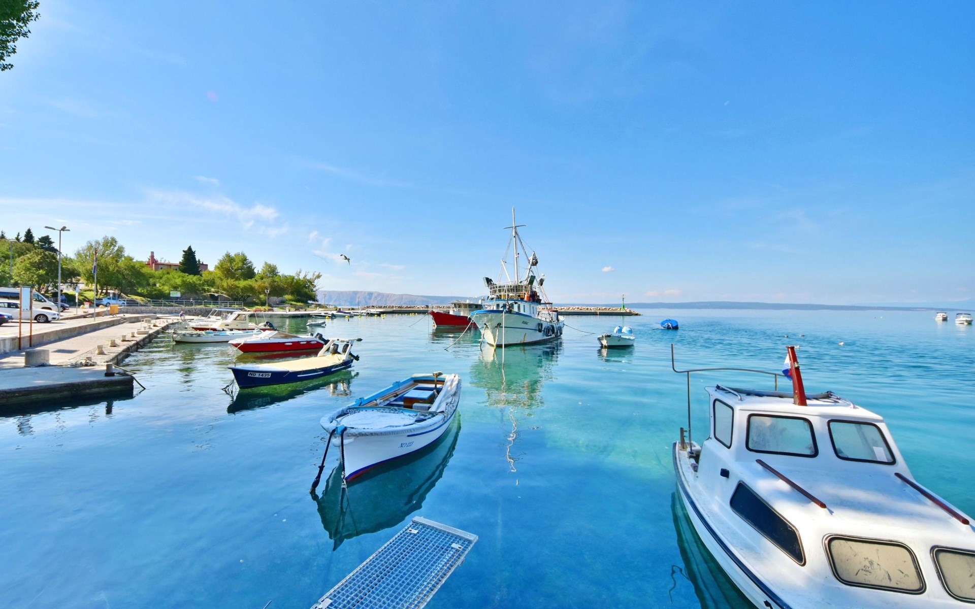 Klenovica 8 km from Novi Vinodolski: Single-family house "My Day House", 2 storeys. 600 m from the centre of Klenovica, in a quiet, sunny, elevated position, 350 m from the sea, 350 m from the beach, in a cul-de-sac. Private: property 1'000 m2 (fenced) with lawn 80 m2 wildlife garden, swimming pool angular (8 x 4 m, depth 150 cm, seasonal availability: 01.May. - 30.Sep.) with internal staircase. Outdoor shower, terrace (150 m2), garden furniture, barbecue. In the house: internet access, washing machine. Parking (for 6 cars) at the house on the premises. Shop, restaurant 600 m, bus stop 950 m, pebble beach 350 m. Groups of teenagers on request only. By groups of young people double deposit is requested on arrival. The house consists of 3 apartments rented as one unit.