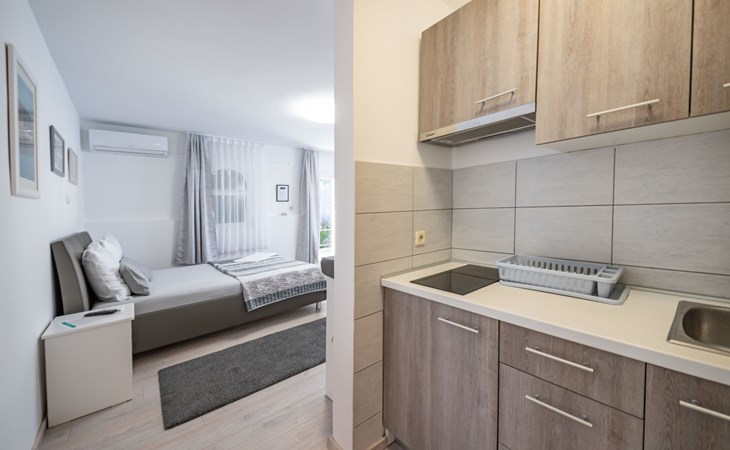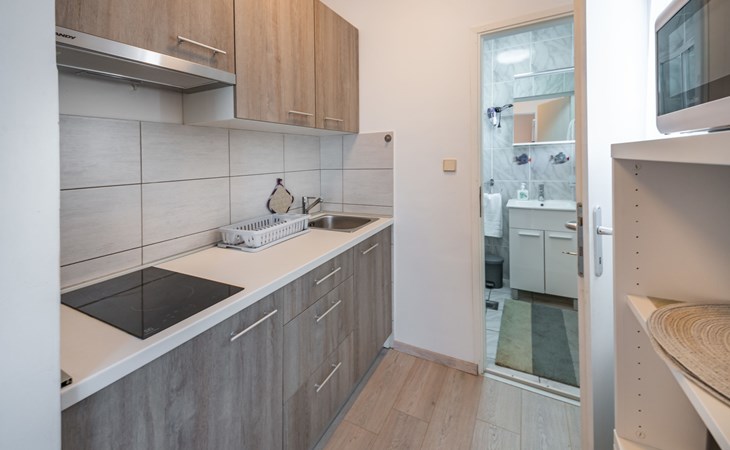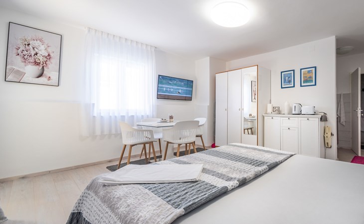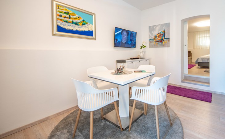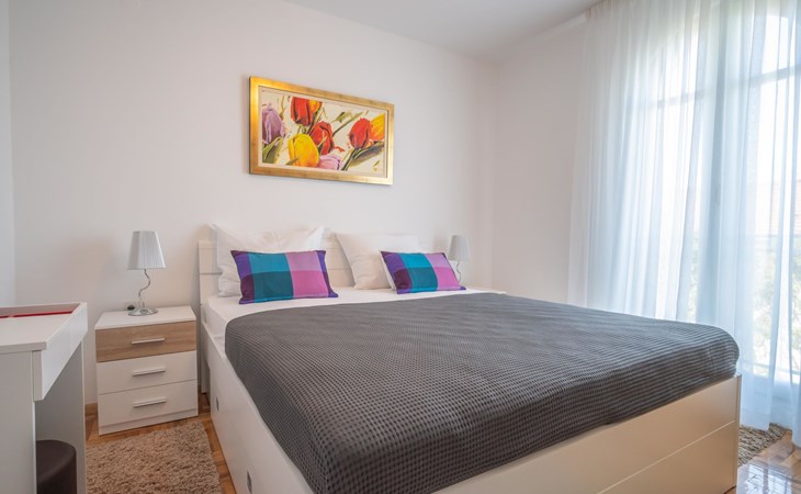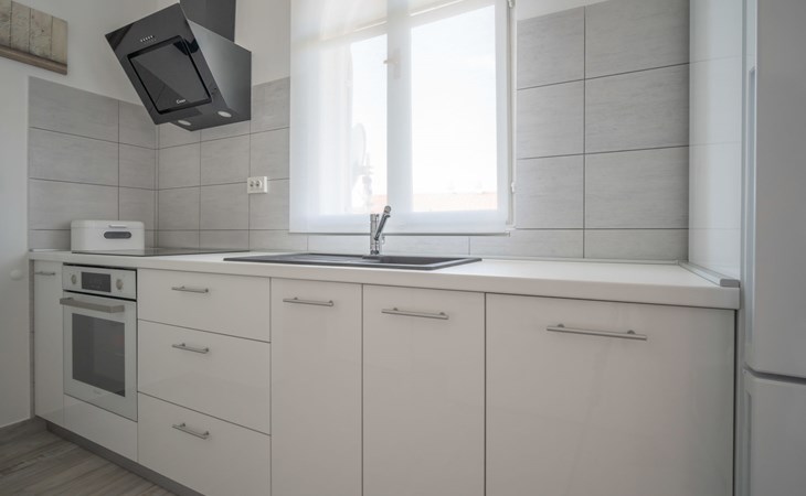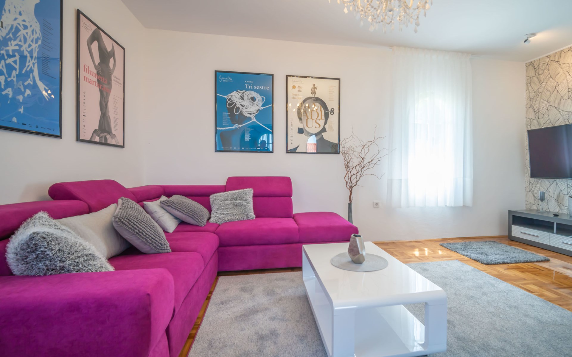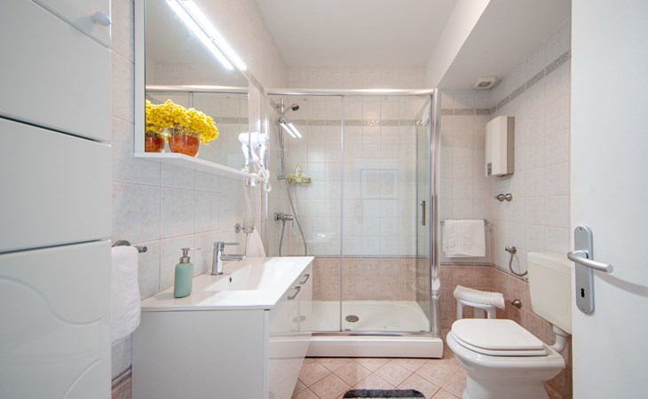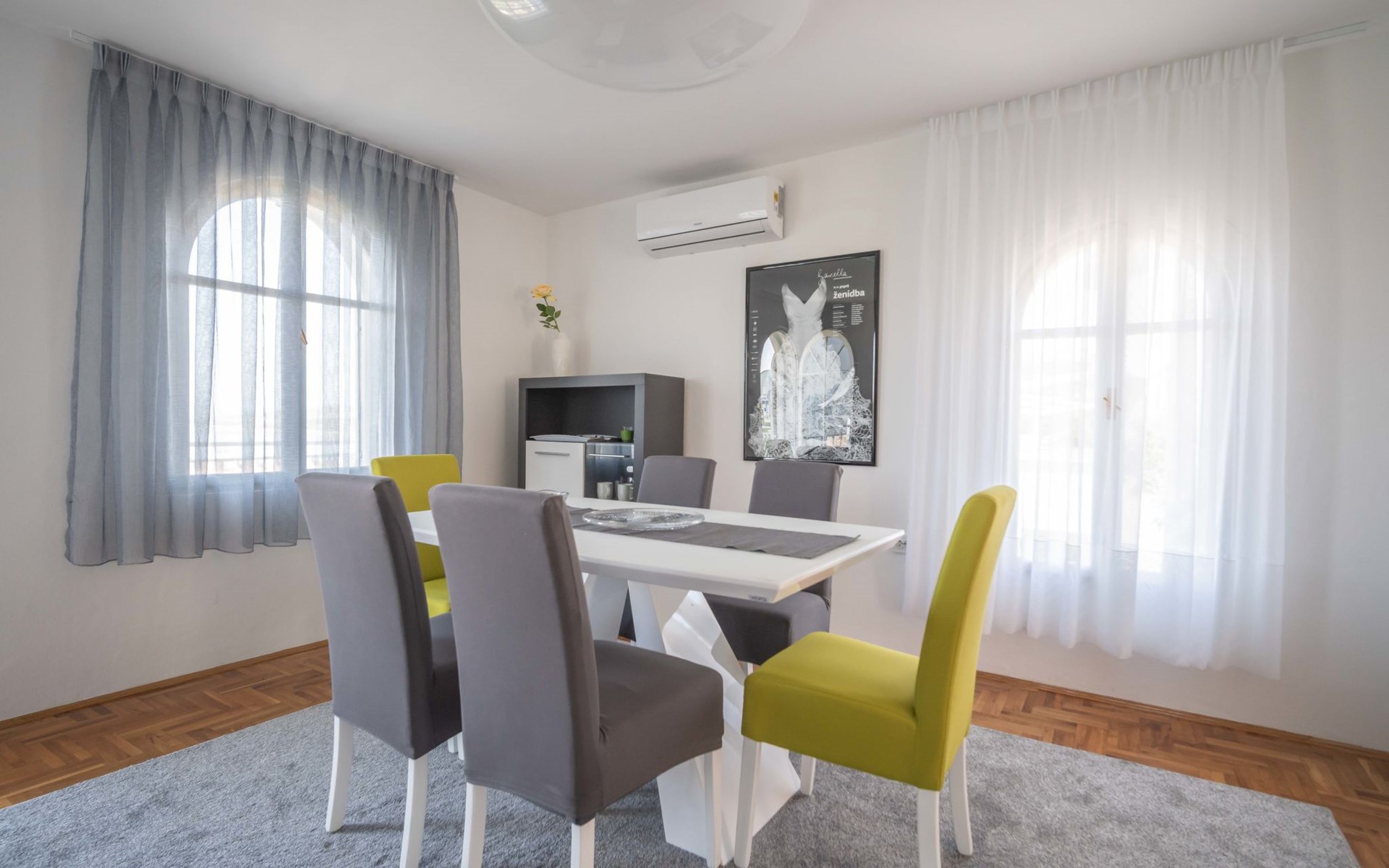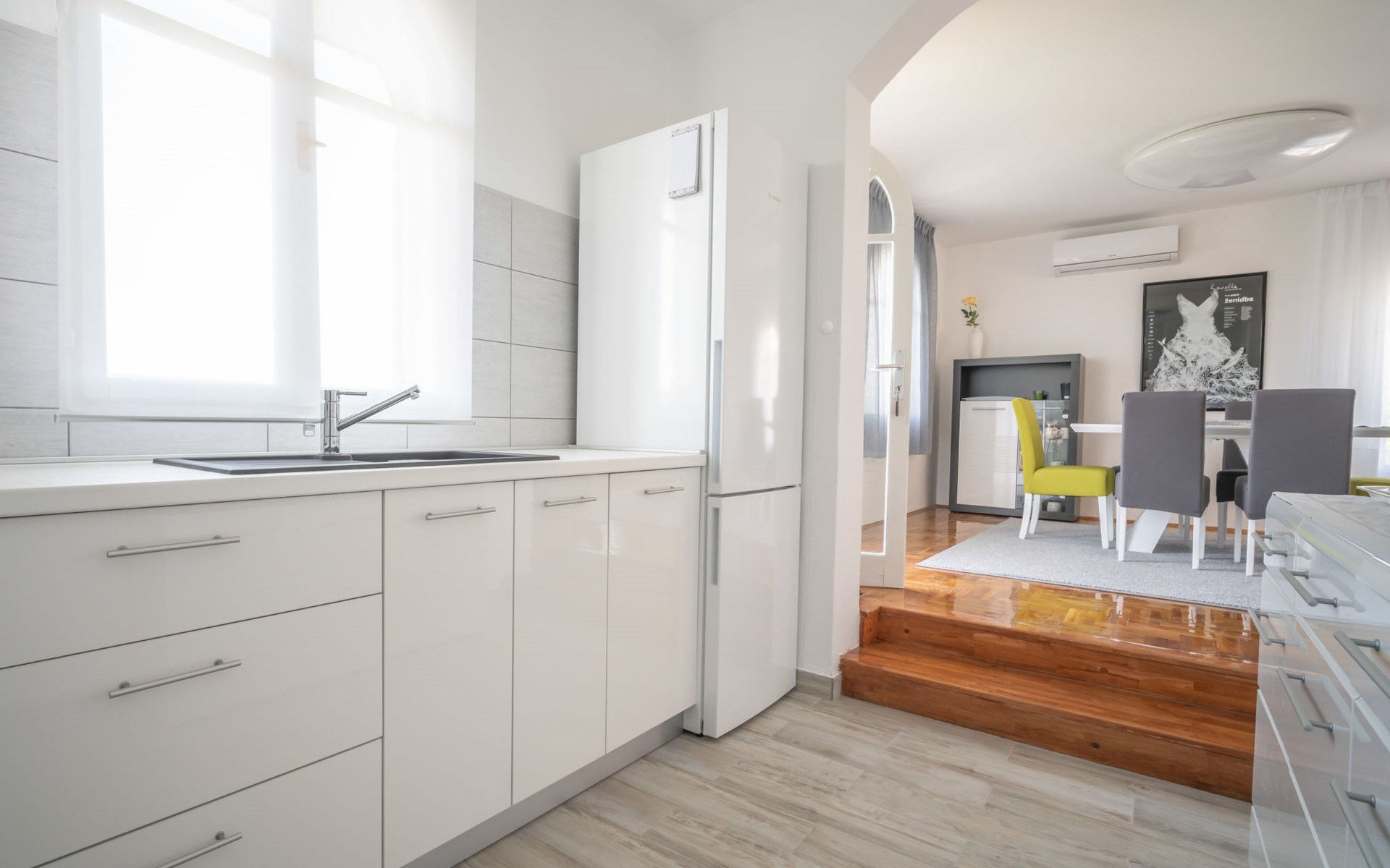 Klenovica 8 km from Novi Vinodolski: Single-family house "My Day House", 2 storeys. 600 m from the centre of Klenovica, in a quiet, sunny, elevated position, 350 m from the sea, 350 m from the beach, in a cul-de-sac. Private: property 1'000 m2 (fenced) with lawn 80 m2 wildlife garden, swimming pool angular (8 x 4 m, depth 150 cm, seasonal availability: 01.May. - 30.Sep.) with internal staircase. Outdoor shower, terrace (150 m2), garden furniture, barbecue. In the house: internet access, washing machine. Parking (for 6 cars) at the house on the premises. Shop, restaurant 600 m, bus stop 950 m, pebble beach 350 m. Groups of teenagers on request only. By groups of young people double deposit is requested on arrival. The house consists of 3 apartments rented as one unit.