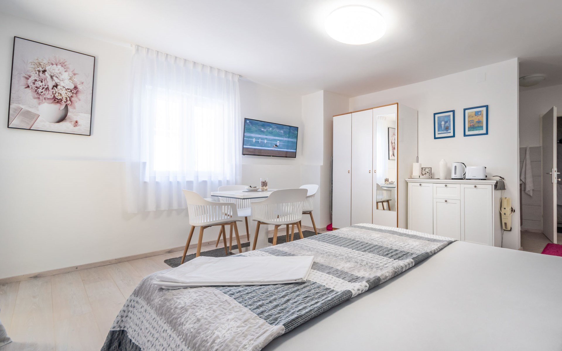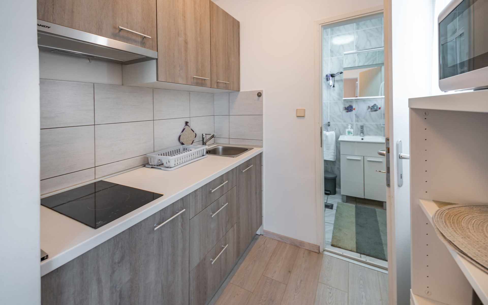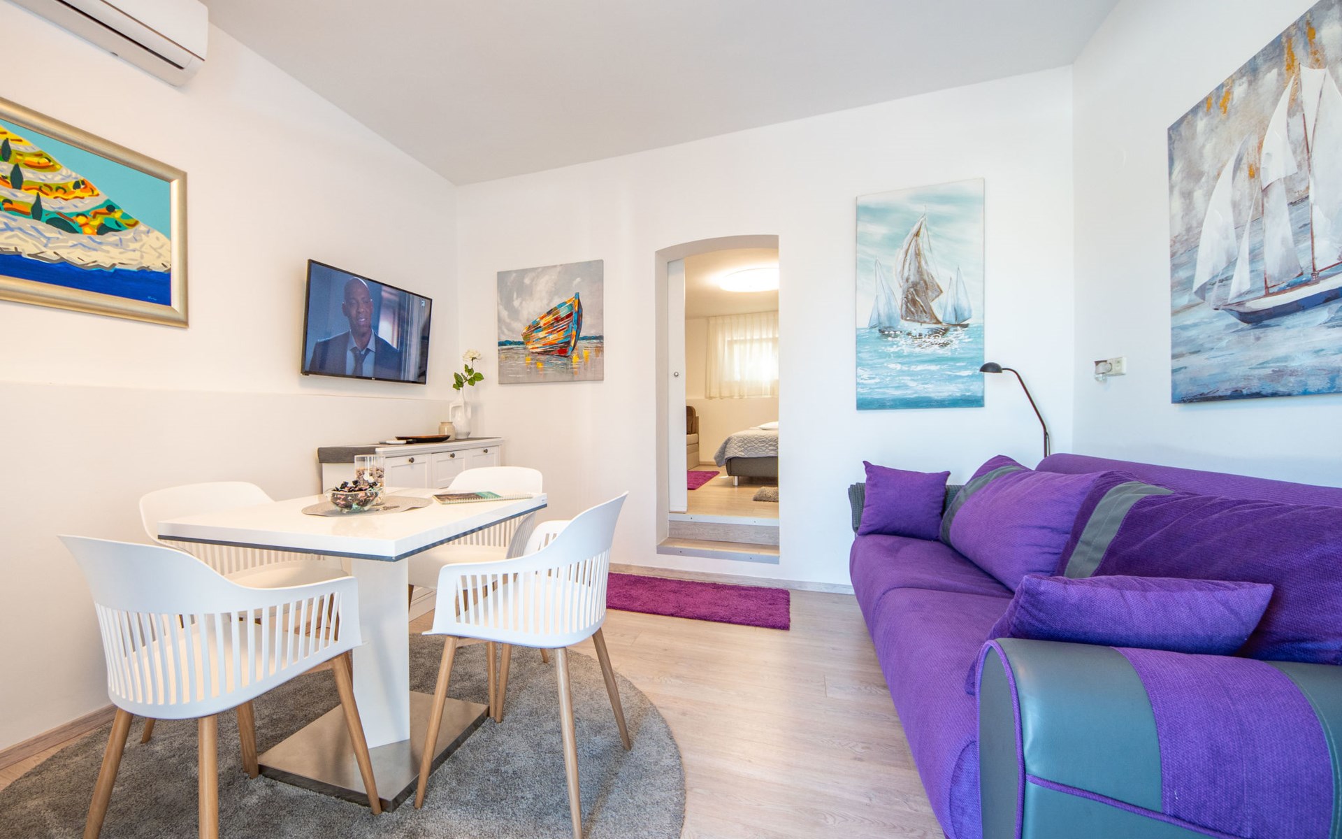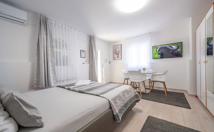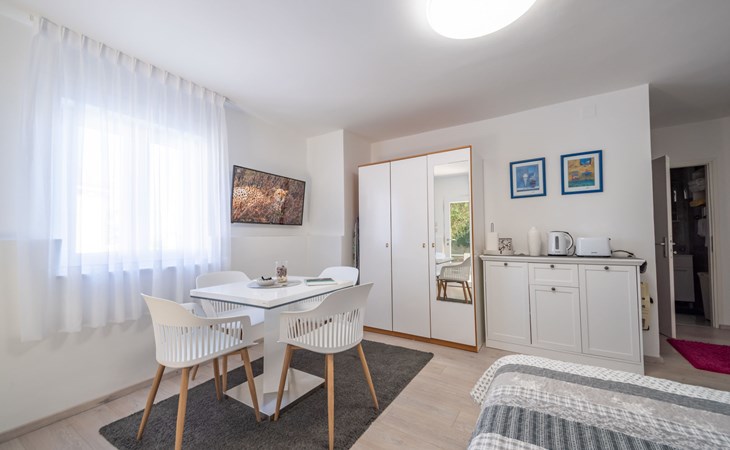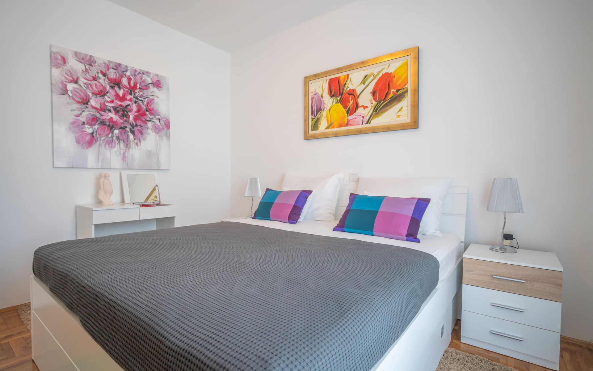 Klenovica 8 km from Novi Vinodolski: Single-family house "My Day House", 2 storeys. 600 m from the centre of Klenovica, in a quiet, sunny, elevated position, 350 m from the sea, 350 m from the beach, in a cul-de-sac. Private: property 1'000 m2 (fenced) with lawn 80 m2 wildlife garden, swimming pool angular (8 x 4 m, depth 150 cm, seasonal availability: 01.May. - 30.Sep.) with internal staircase. Outdoor shower, terrace (150 m2), garden furniture, barbecue. In the house: internet access, washing machine. Parking (for 6 cars) at the house on the premises. Shop, restaurant 600 m, bus stop 950 m, pebble beach 350 m. Groups of teenagers on request only. By groups of young people double deposit is requested on arrival. The house consists of 3 apartments rented as one unit.