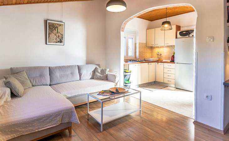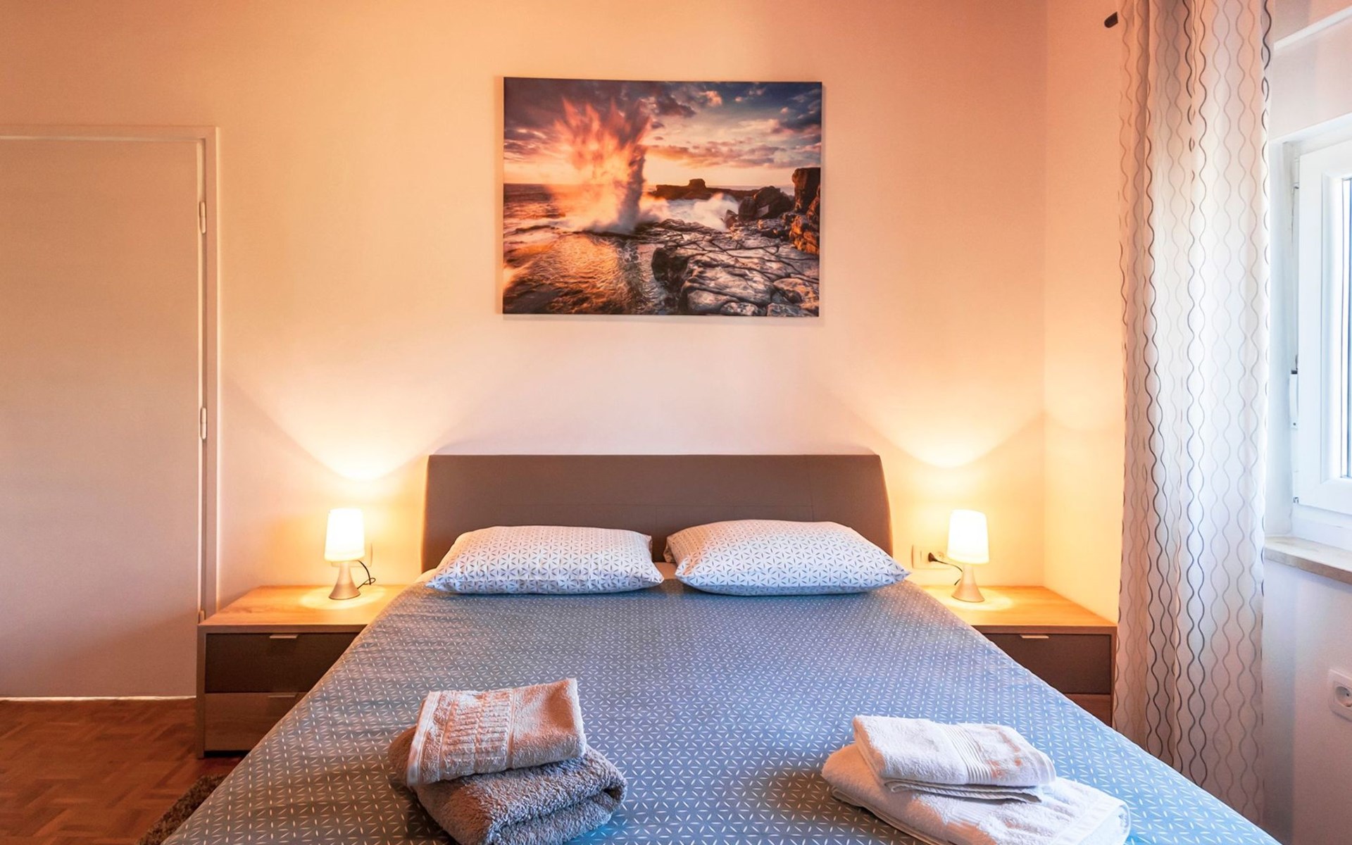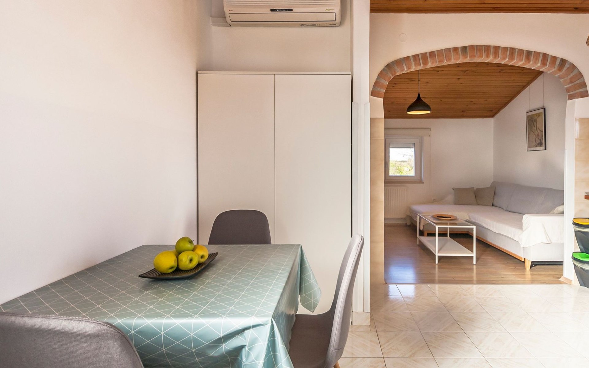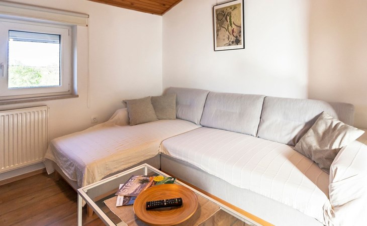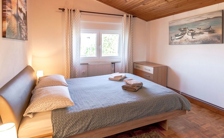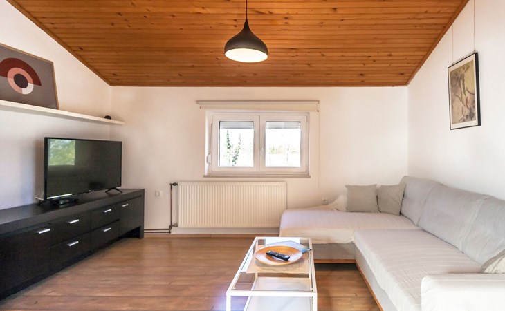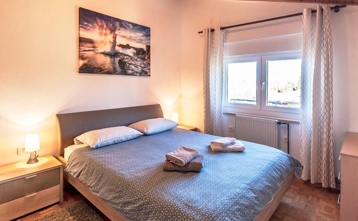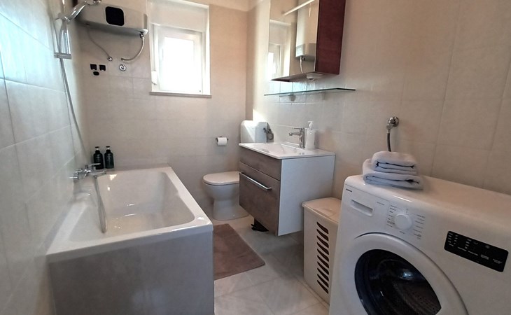 The apartment is part of a private house and has its own separate entrance on the first floor. It has a bedroom with a 160x200cm bed for 2 people, a living room with a couch where can sleep 1 person, an additional unfolding bed (on request), satellite SMART TV, and a fully-equipped kitchen with electric cooking stove (4 places), dishwasher, fridge with freezer, pots, pans, cutlery.... In the living room is a sofa when unfolded it is 115x180cm wide. The bathroom has a bath with a shower over the bathtub. WIFI, air-conditioning and a washing machine are provided free of charge. All windows have mosquito nets.