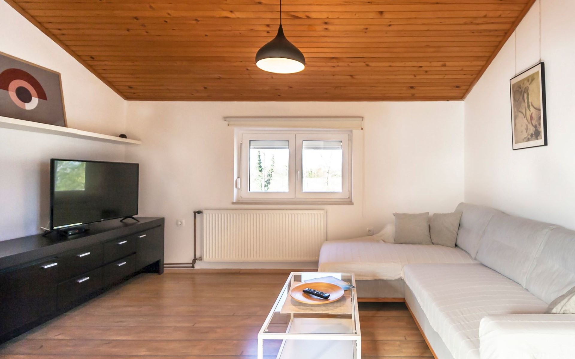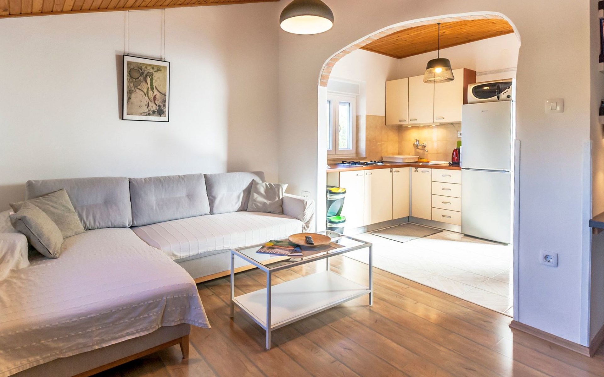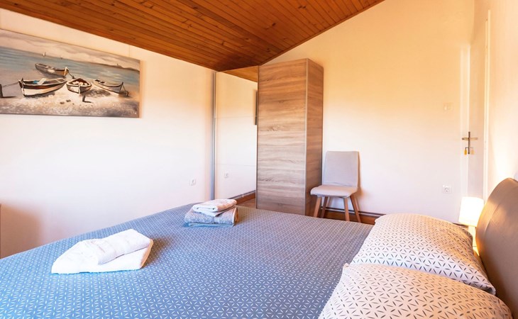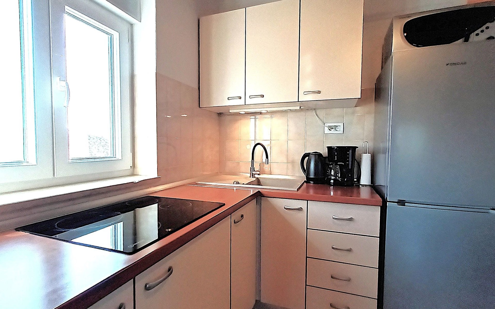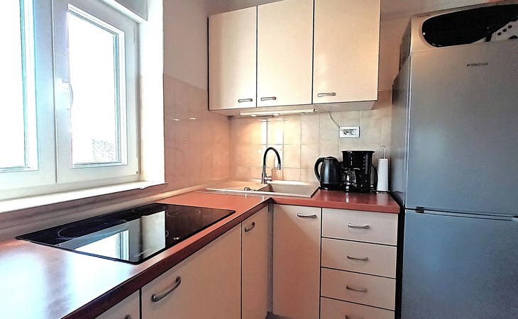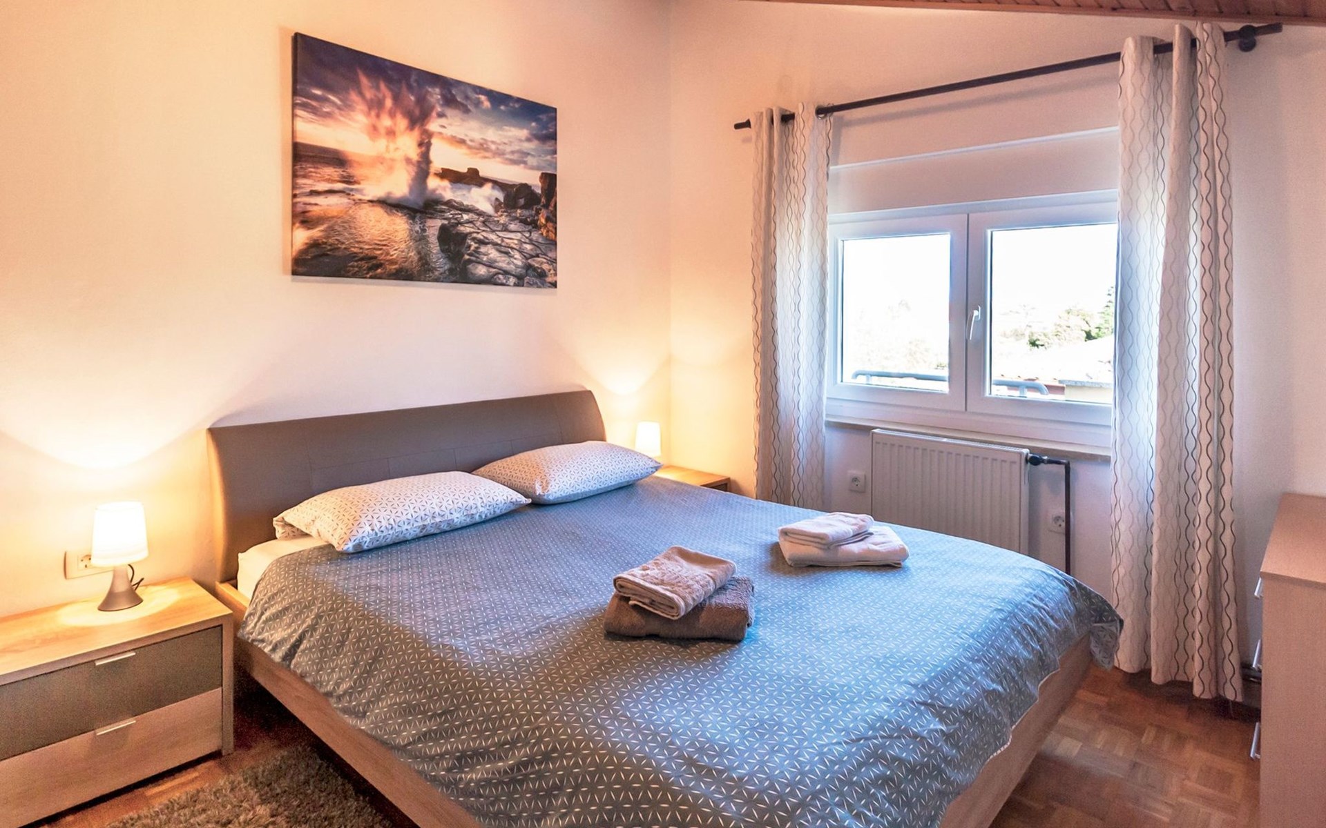 The apartment is part of a private house and has its own separate entrance on the first floor. It has a bedroom with a 160x200cm bed for 2 people, a living room with a couch where can sleep 1 person, an additional unfolding bed (on request), satellite SMART TV, and a fully-equipped kitchen with electric cooking stove (4 places), dishwasher, fridge with freezer, pots, pans, cutlery.... In the living room is a sofa when unfolded it is 115x180cm wide. The bathroom has a bath with a shower over the bathtub. WIFI, air-conditioning and a washing machine are provided free of charge. All windows have mosquito nets.
