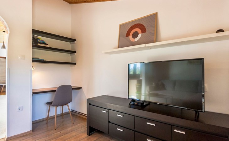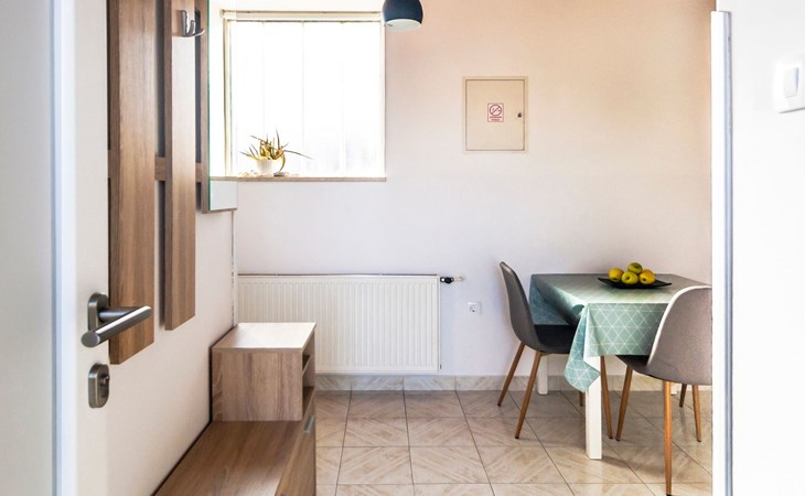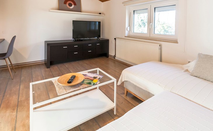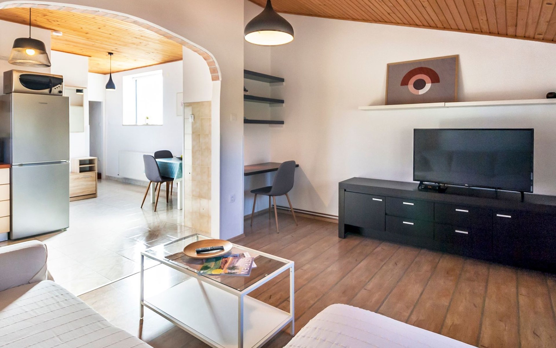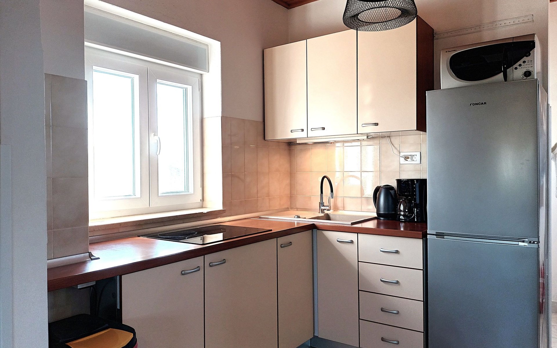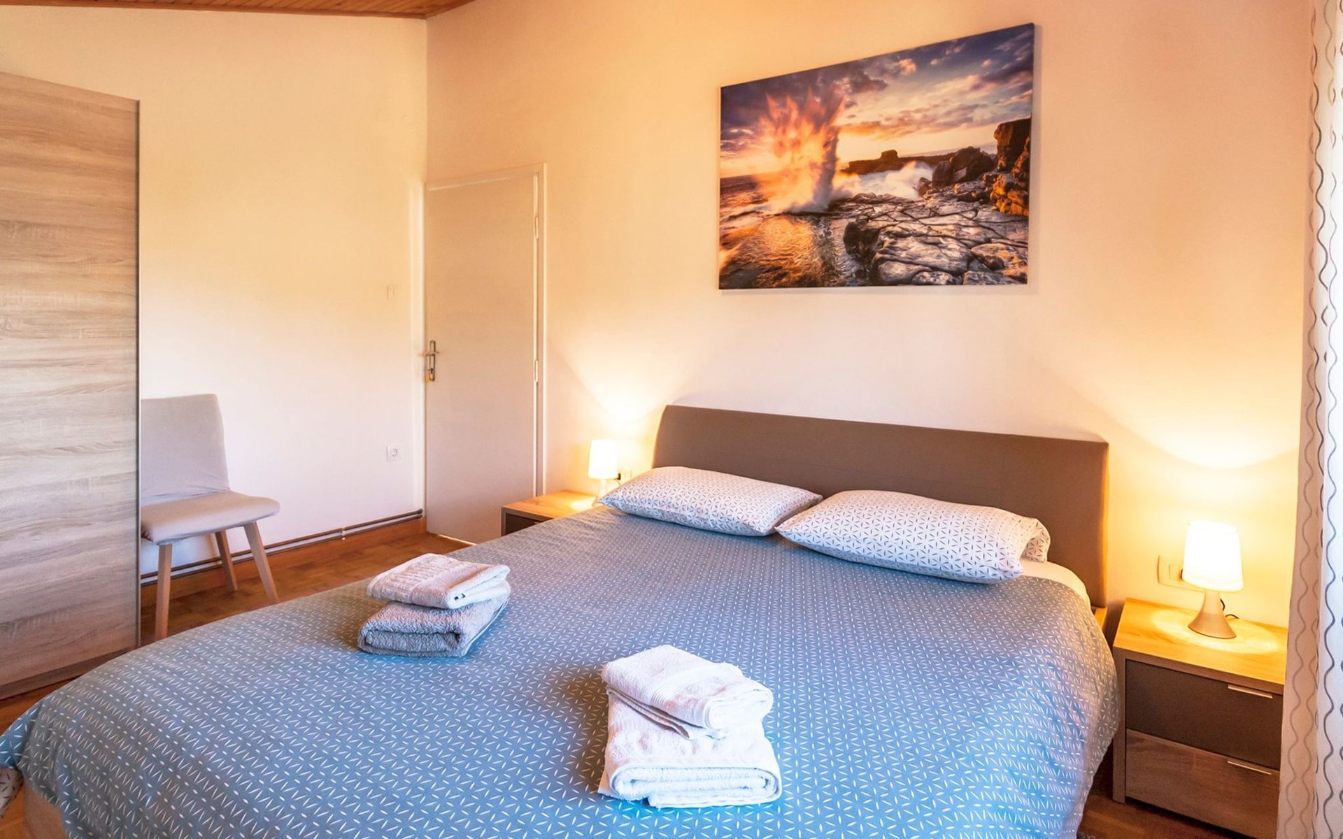 The apartment is part of a private house and has its own separate entrance on the first floor. It has a bedroom with a 160x200cm bed for 2 people, a living room with a couch where can sleep 1 person, an additional unfolding bed (on request), satellite SMART TV, and a fully-equipped kitchen with electric cooking stove (4 places), dishwasher, fridge with freezer, pots, pans, cutlery.... In the living room is a sofa when unfolded it is 115x180cm wide. The bathroom has a bath with a shower over the bathtub. WIFI, air-conditioning and a washing machine are provided free of charge. All windows have mosquito nets.