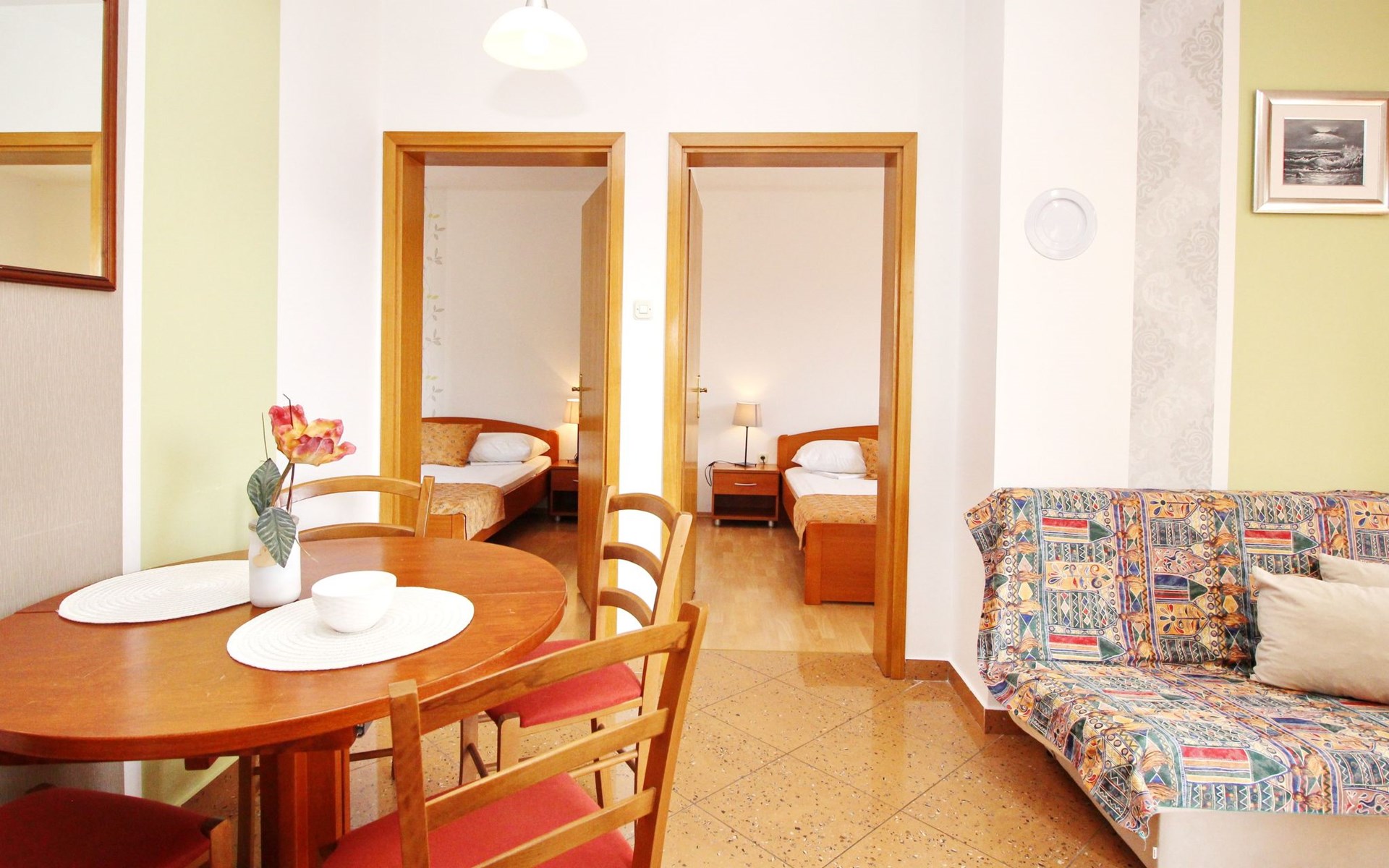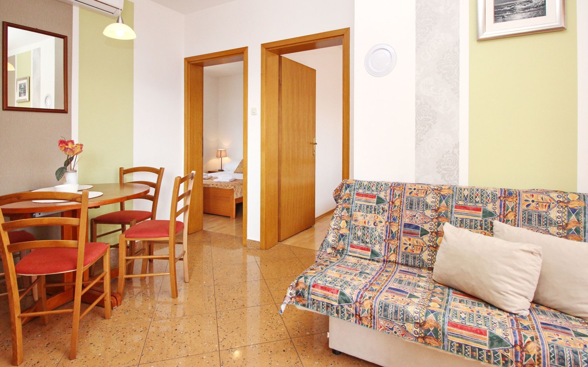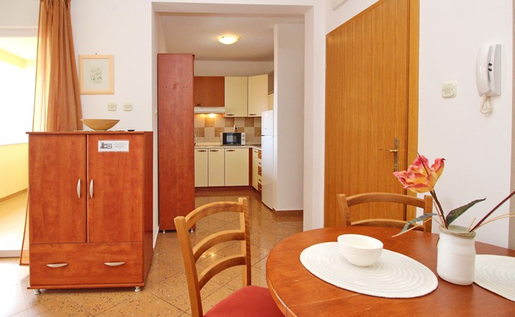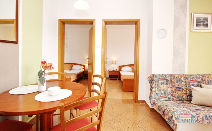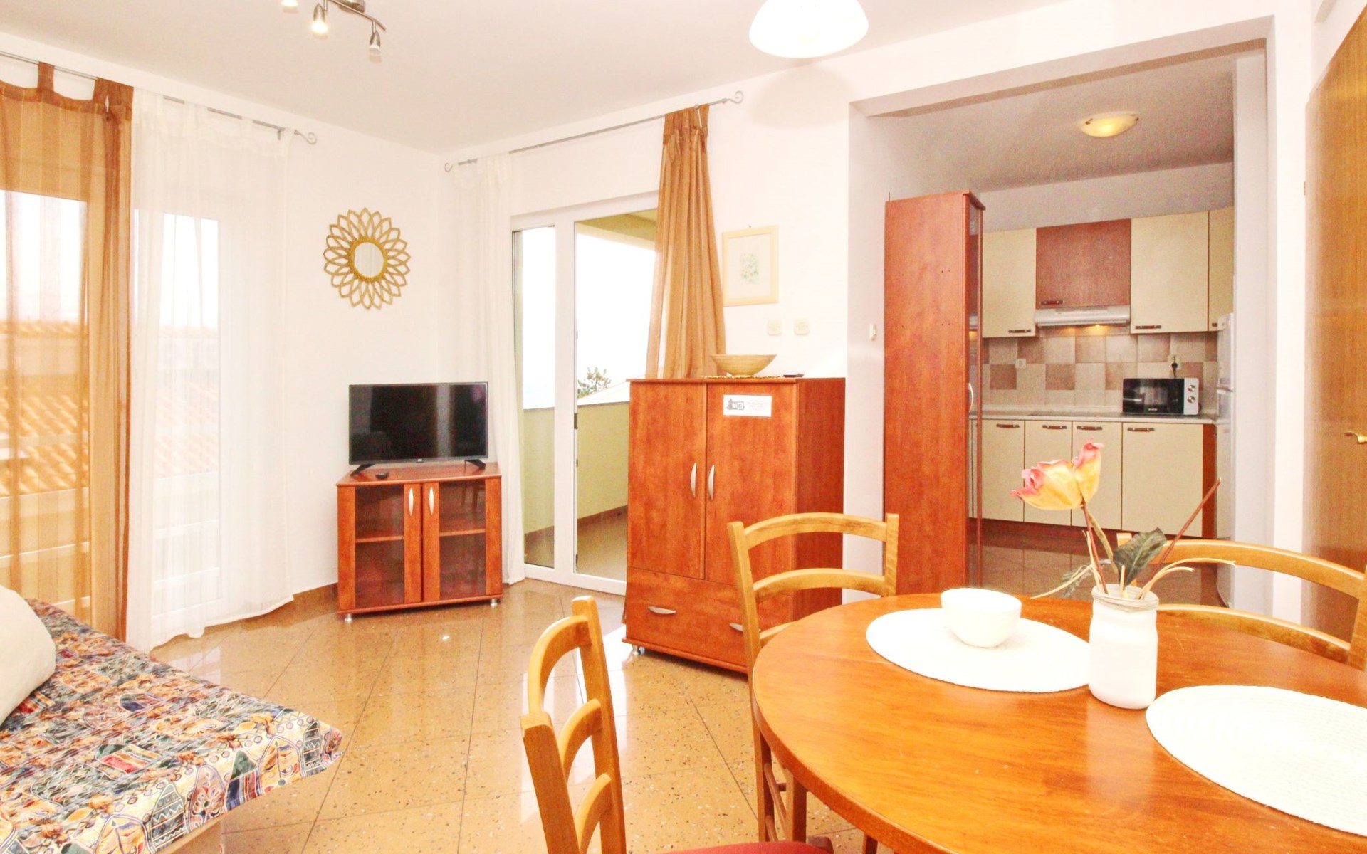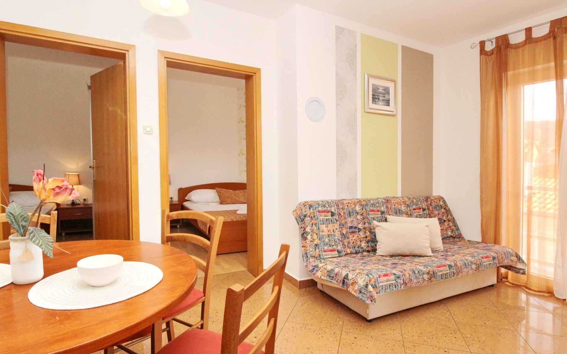 Living area : Living room, dining room and kitchen are one unit; dining table and seating for all persons; one additional sleeping possibility on a sofa bed; with balcony; tiled