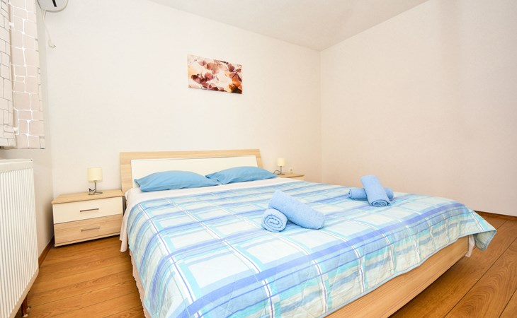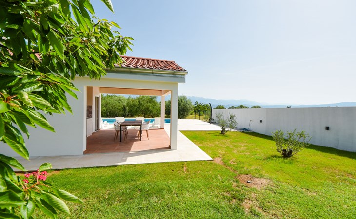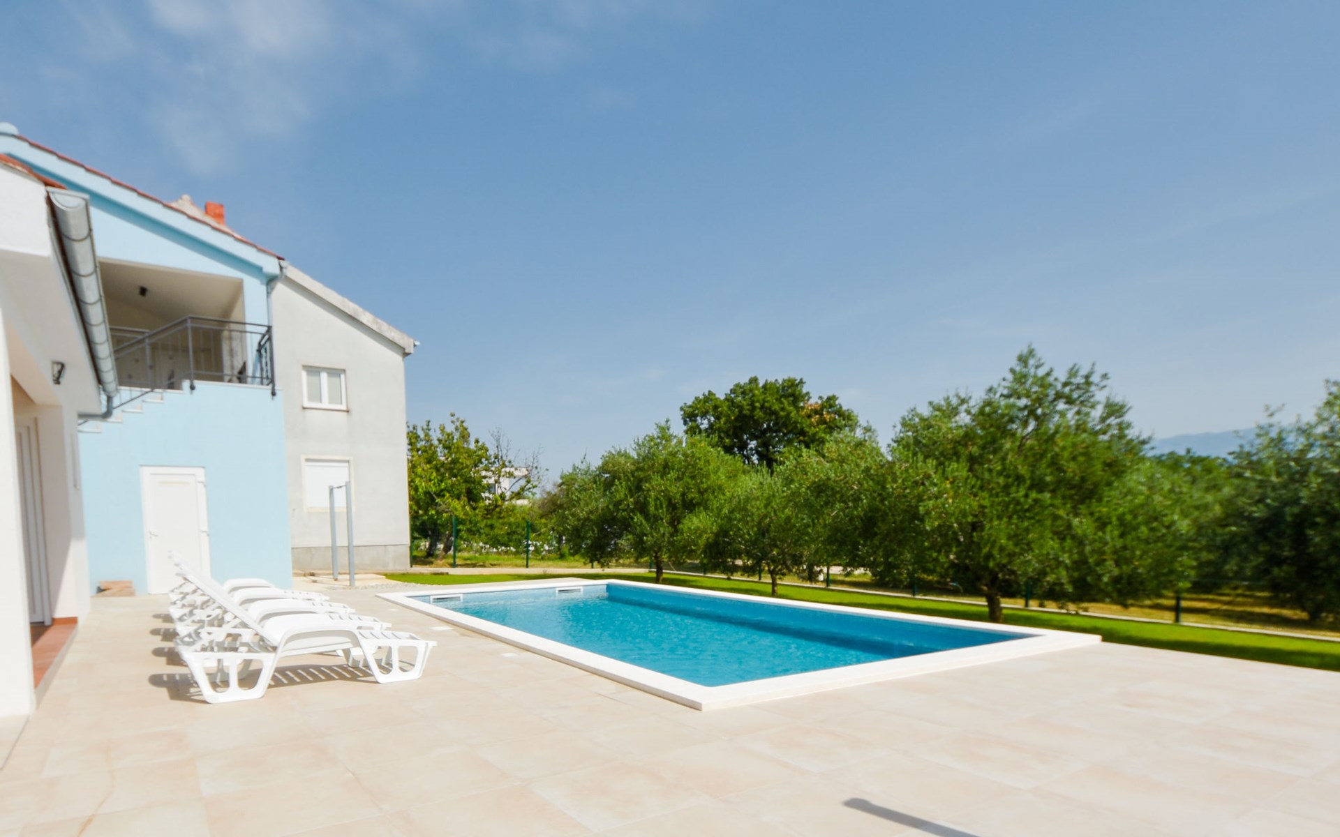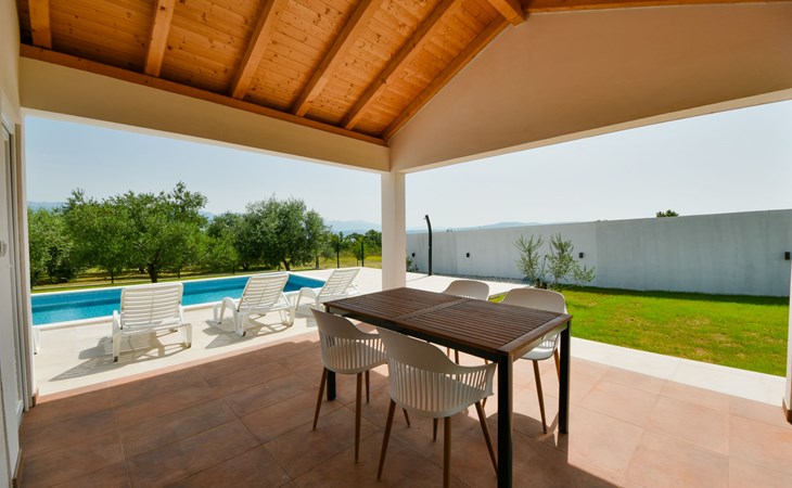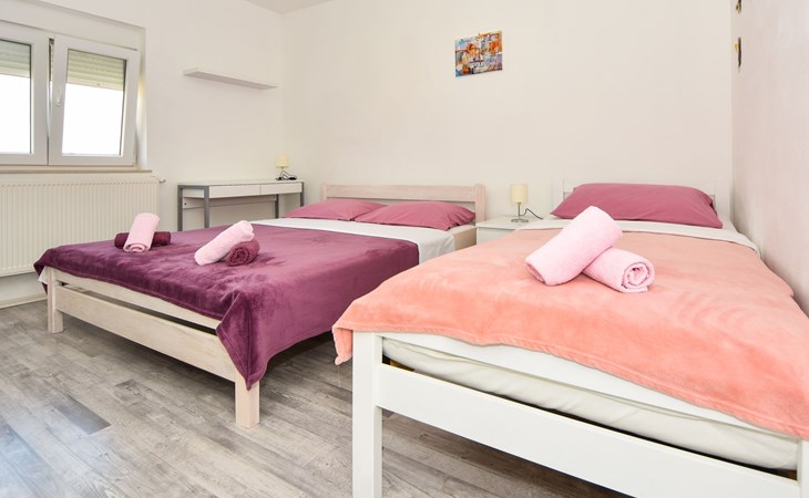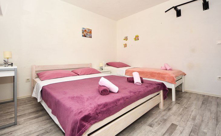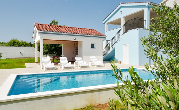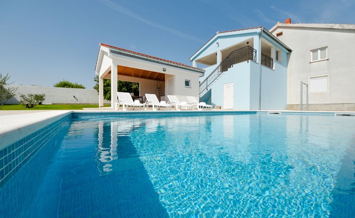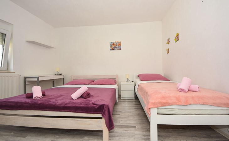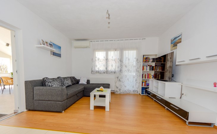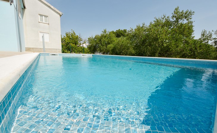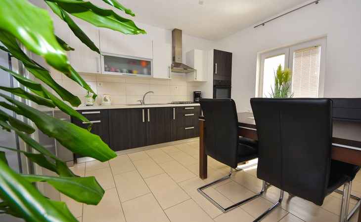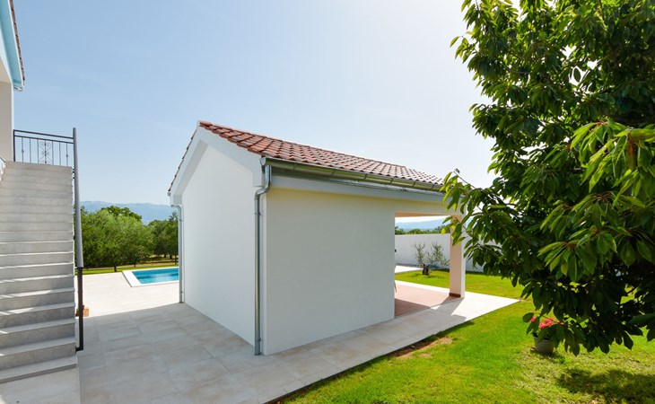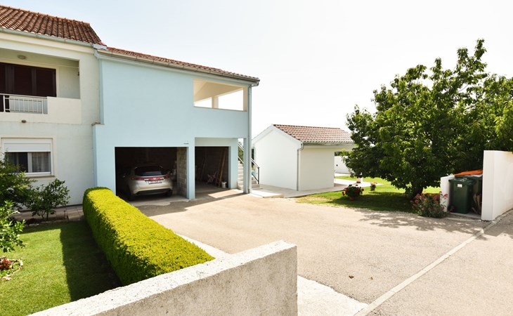 Podgradina 8 km from Novigrad: Terraced house "Elena". 7 km from the centre of Posedarije, in a sunny, elevated position, 2.2 km from the sea, 2.2 km from the beach. Private: property 450 m2 (fenced), swimming pool angular (8 x 4 m, depth 150 cm, seasonal availability: 04.May. - 05.Oct.). WC in the pool area, garden furniture, barbecue house, pool maintenance by the owner/gardener. In the house: internet access. Parking (for 2 cars) at the house on the premises. Shop 750 m, supermarket 6 km, restaurant 5 km, bus stop 500 m, sandy beach 4 km, shingle beach 2.2 km. Nearby attractions: NP Paklenica 30 km, NP Krka 80 km. Groups of teenagers on request only. Please note: the owner lives on the same property.