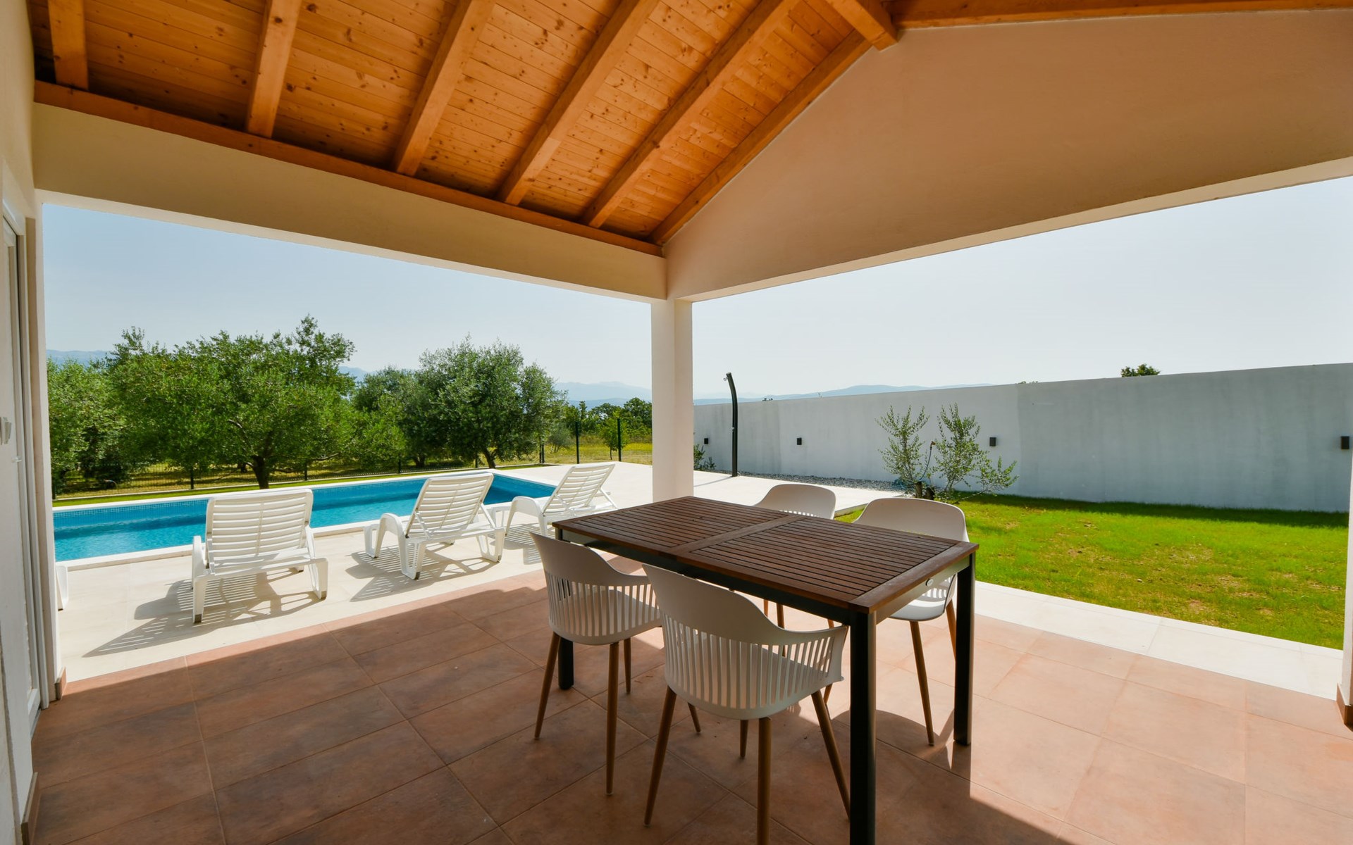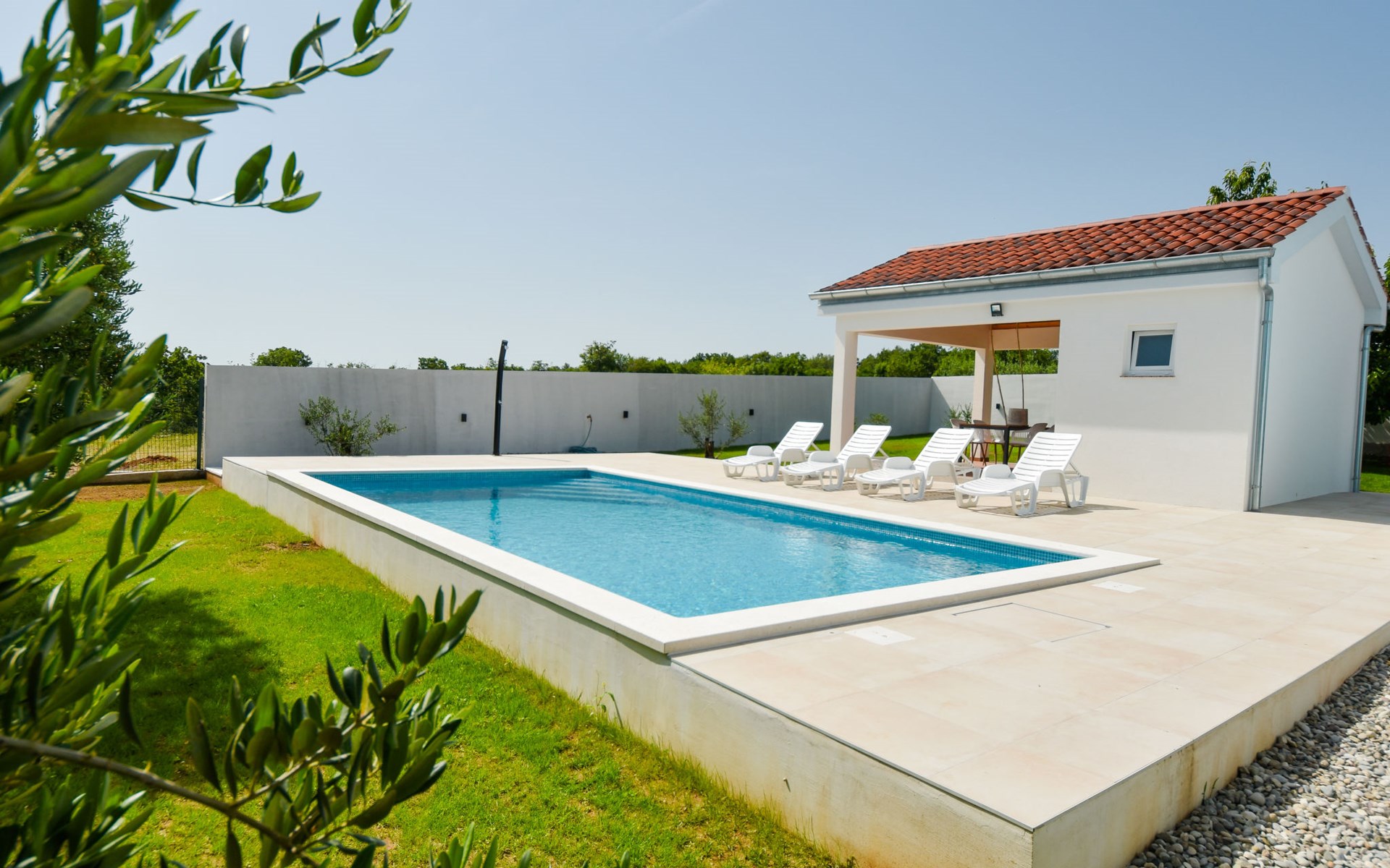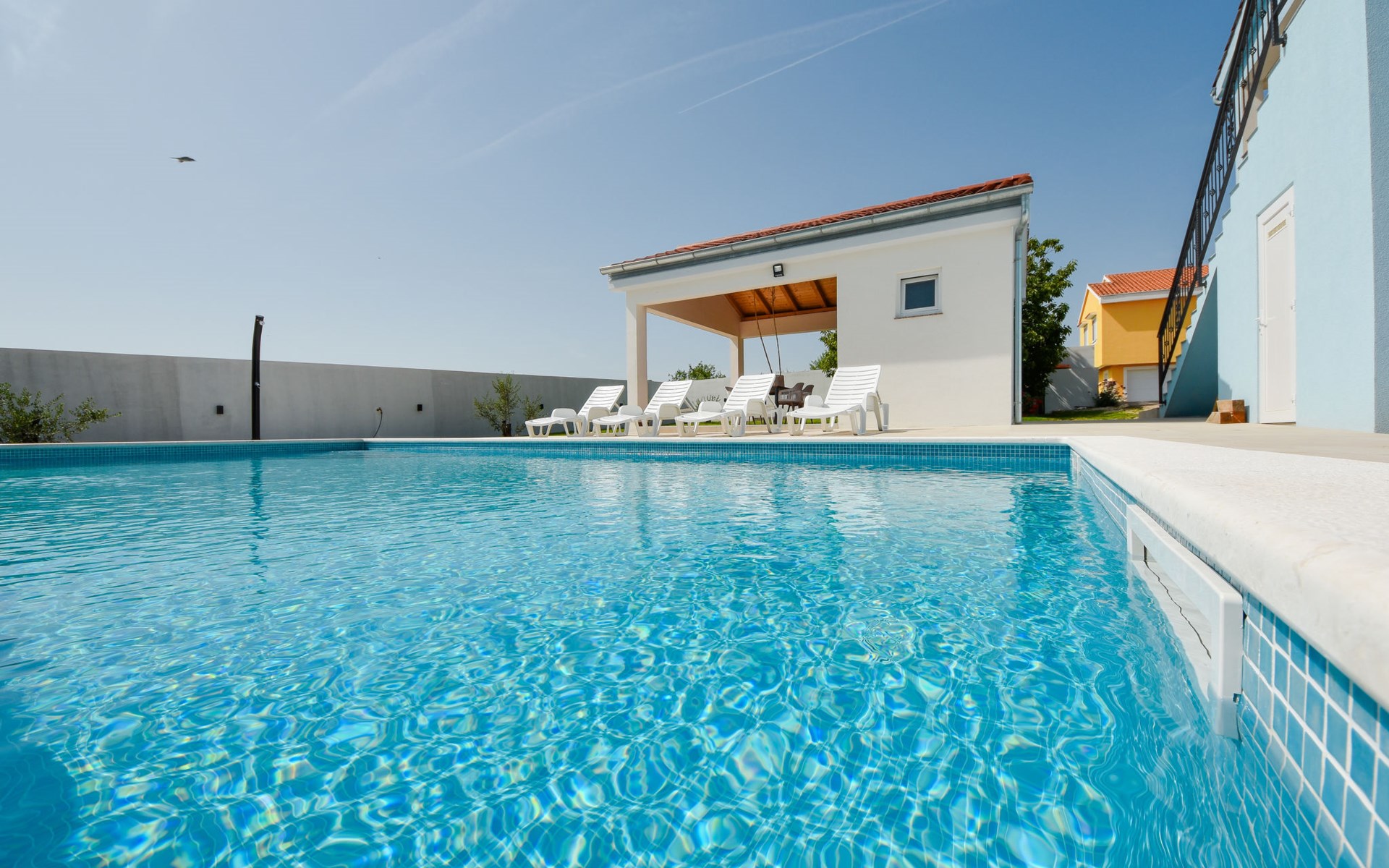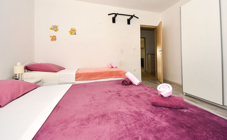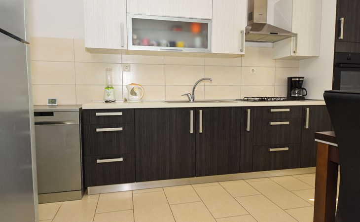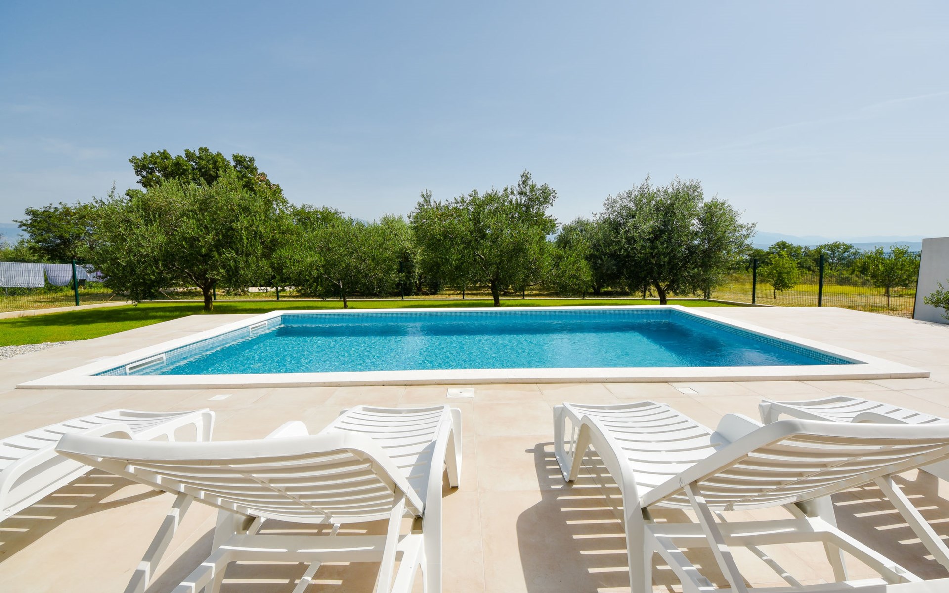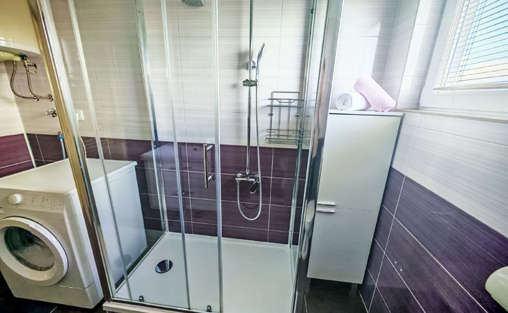 Podgradina 8 km from Novigrad: Terraced house "Elena". 7 km from the centre of Posedarije, in a sunny, elevated position, 2.2 km from the sea, 2.2 km from the beach. Private: property 450 m2 (fenced), swimming pool angular (8 x 4 m, depth 150 cm, seasonal availability: 04.May. - 05.Oct.). WC in the pool area, garden furniture, barbecue house, pool maintenance by the owner/gardener. In the house: internet access. Parking (for 2 cars) at the house on the premises. Shop 750 m, supermarket 6 km, restaurant 5 km, bus stop 500 m, sandy beach 4 km, shingle beach 2.2 km. Nearby attractions: NP Paklenica 30 km, NP Krka 80 km. Groups of teenagers on request only. Please note: the owner lives on the same property.