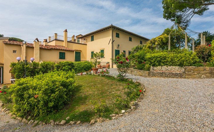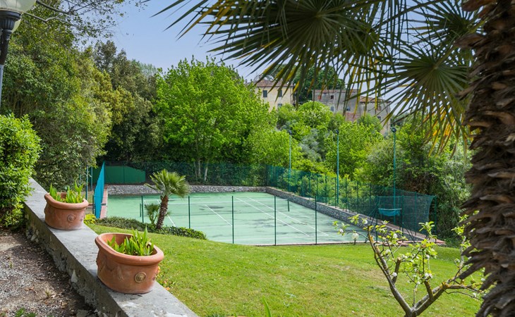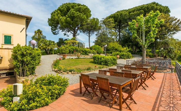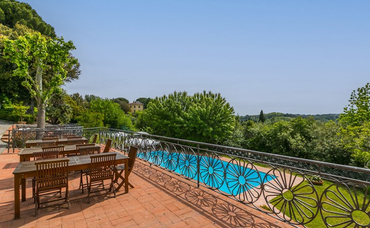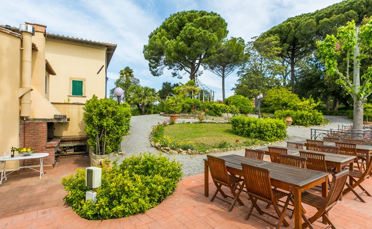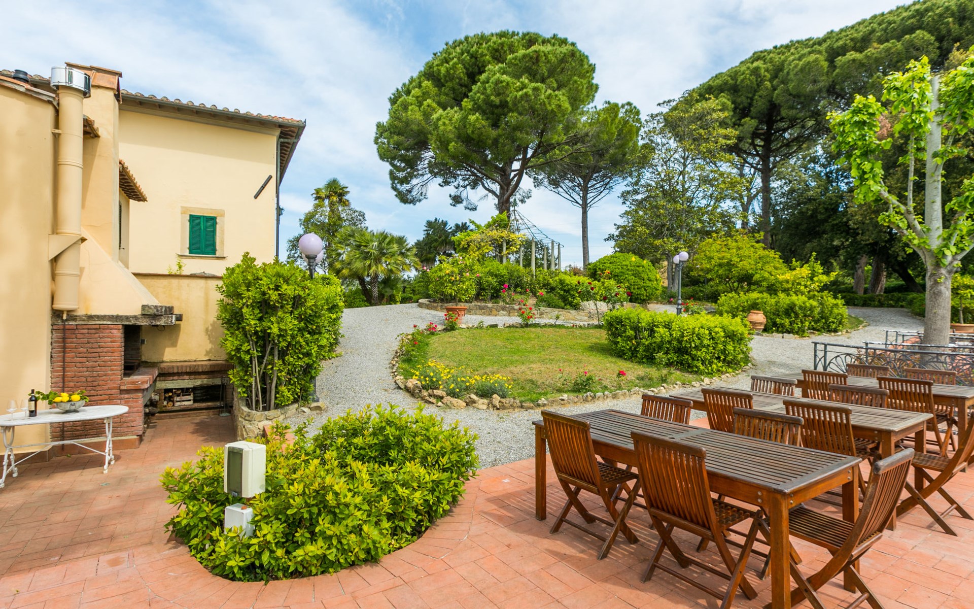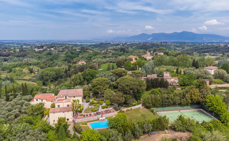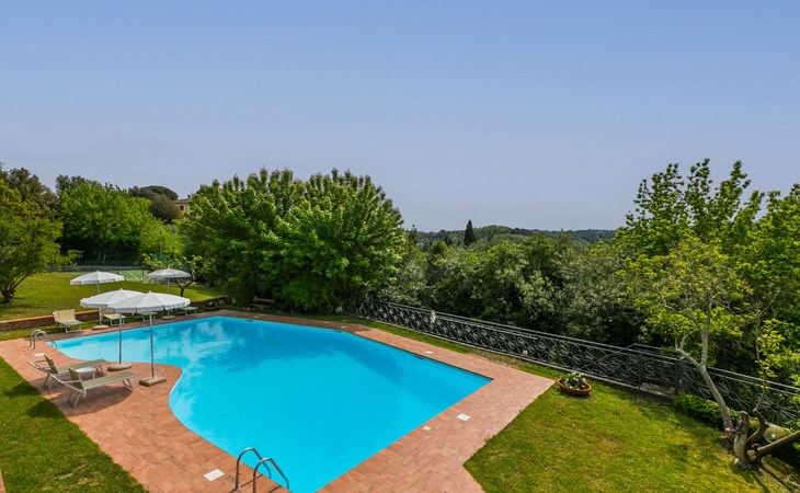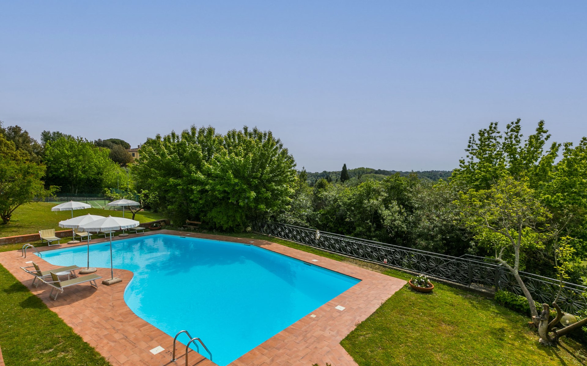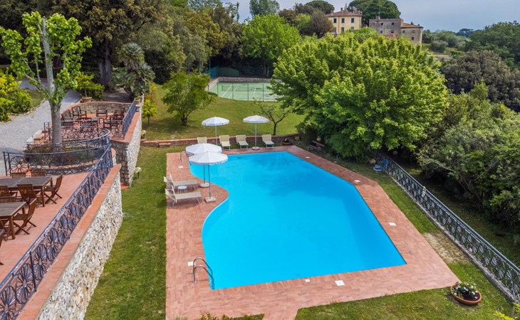 Exclusive and elegant 19th century property located in the heart of the Tuscan hills. Historical country house "Villa La Guardia Vecchia", detached, built in 1700, renovated, surrounded by meadows. 700 m from the centre of Crespina Lorenzana, 30 km from the centre of Pisa, 33 km from the centre of Livorno, in a secluded, quiet, sunny position on top of a hill, 30 km from the sea, in the countryside. Private: park (fenced), flowers and trees, beautiful garden to relax, swimming pool (15 x 7 m, depth 120 - 275 cm, seasonal availability: 01.May. - 01.Oct.). Shower/WC in the pool area, tennis (1 x hard court), table tennis, garden furniture, barbecue. In the house: billiard table, heating to be paid on the spot, heating available only from 01.Nov. - 15.Apr.. Parking on the premises. Restaurant 1 km, bus stop 500 m, sandy beach "Castiglioncello" 35 km, rocky beach "Calafuria" 38 km, thermal baths "Cascina Terme" 10 km. Golf course (9 hole) 30 km, riding stable 500 m. Nearby attractions: Villa Belvedere 500 m, Certosa di Calci 23 km, Lajatico 29 km, Volterra 46 km, San Gimignano 55 km, Lucca 63 km. Please note: car recommended. Suitable for families. Groups of teenagers on request only. Suitable for events. The villa is surrounded by a splendid park with an Italian garden, inside which there are benches, gazebos, fruit trees, a splendid swimming pool and a tennis court. This Villa, an ideal place to spend exclusive relaxing holidays, also offers the possibility of hosting events, weddings and meetings. Adjacent to the villa, with an independent entrance, is the caretaker's house.