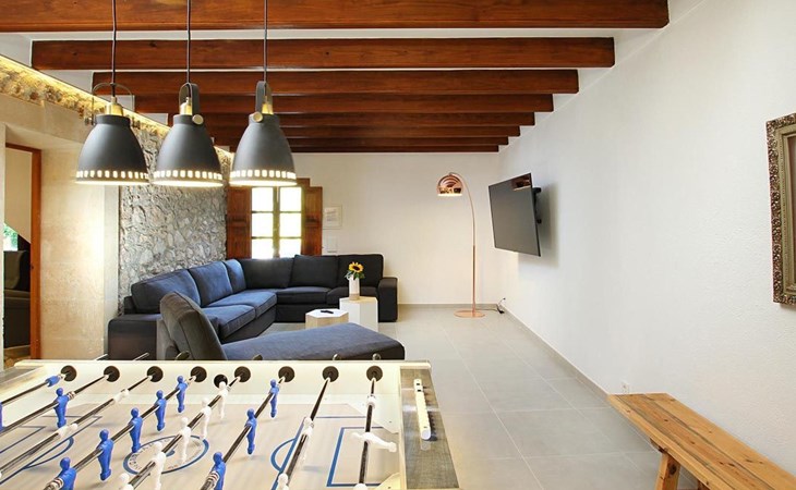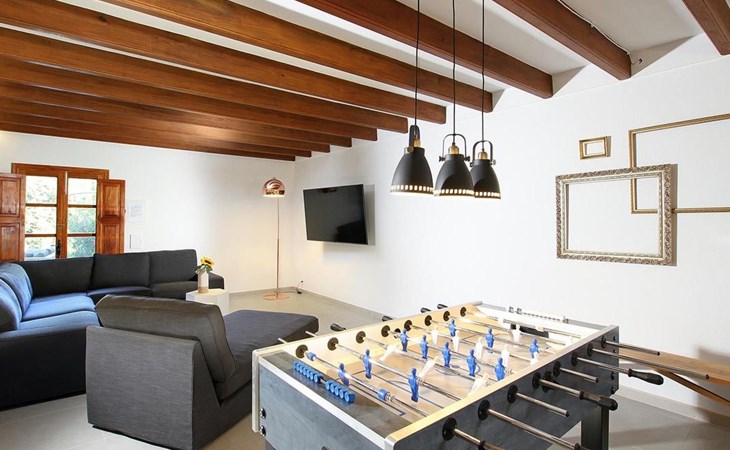 On the ground floor there is also a large leisure room where you can play a game of table football, or sit on the comfortable sofas and enjoy films on the impressive 65-inch screen. The smart TV is equipped with wireless internet connection so guests can enjoy their Amazon, Netflix and other platforms.
