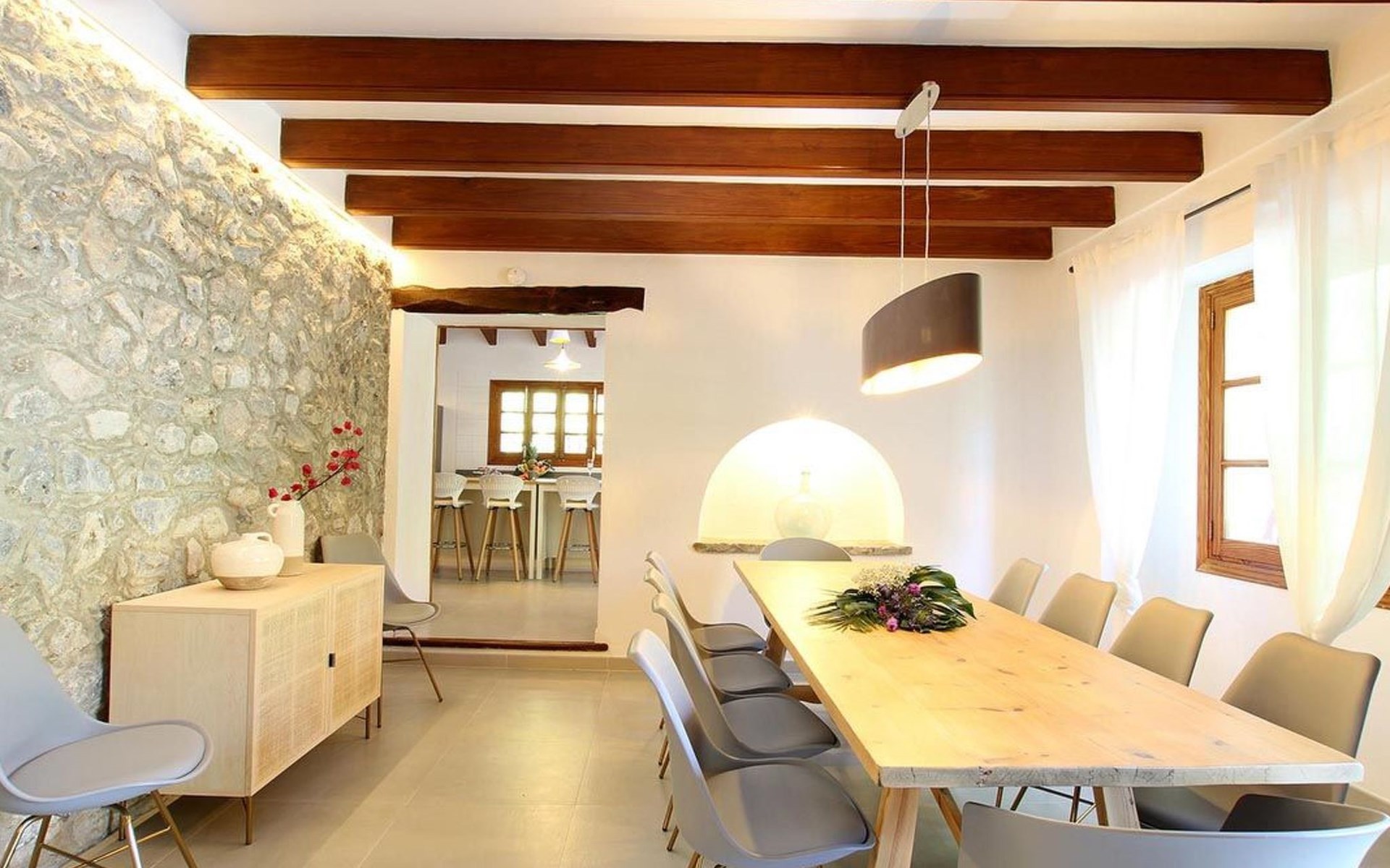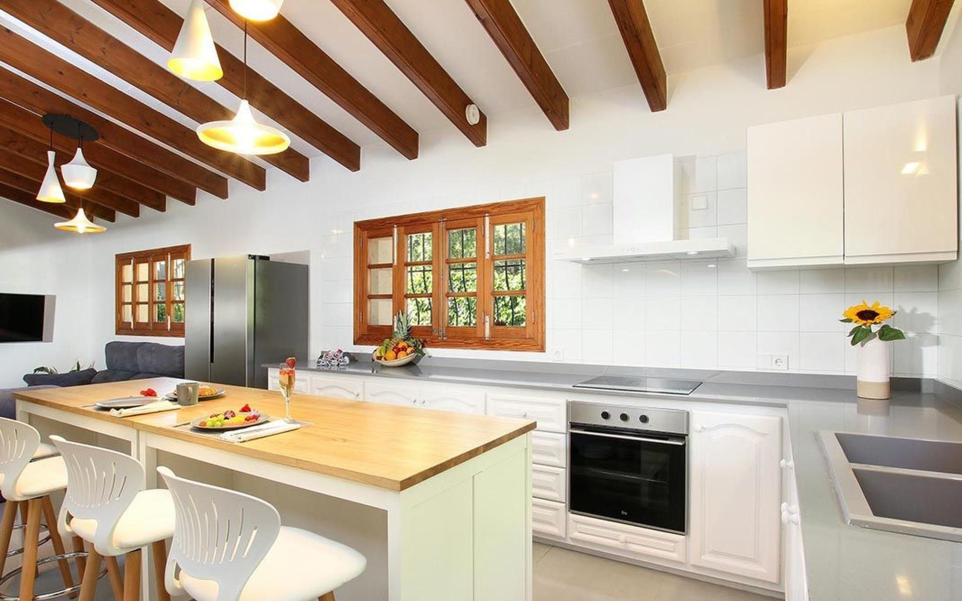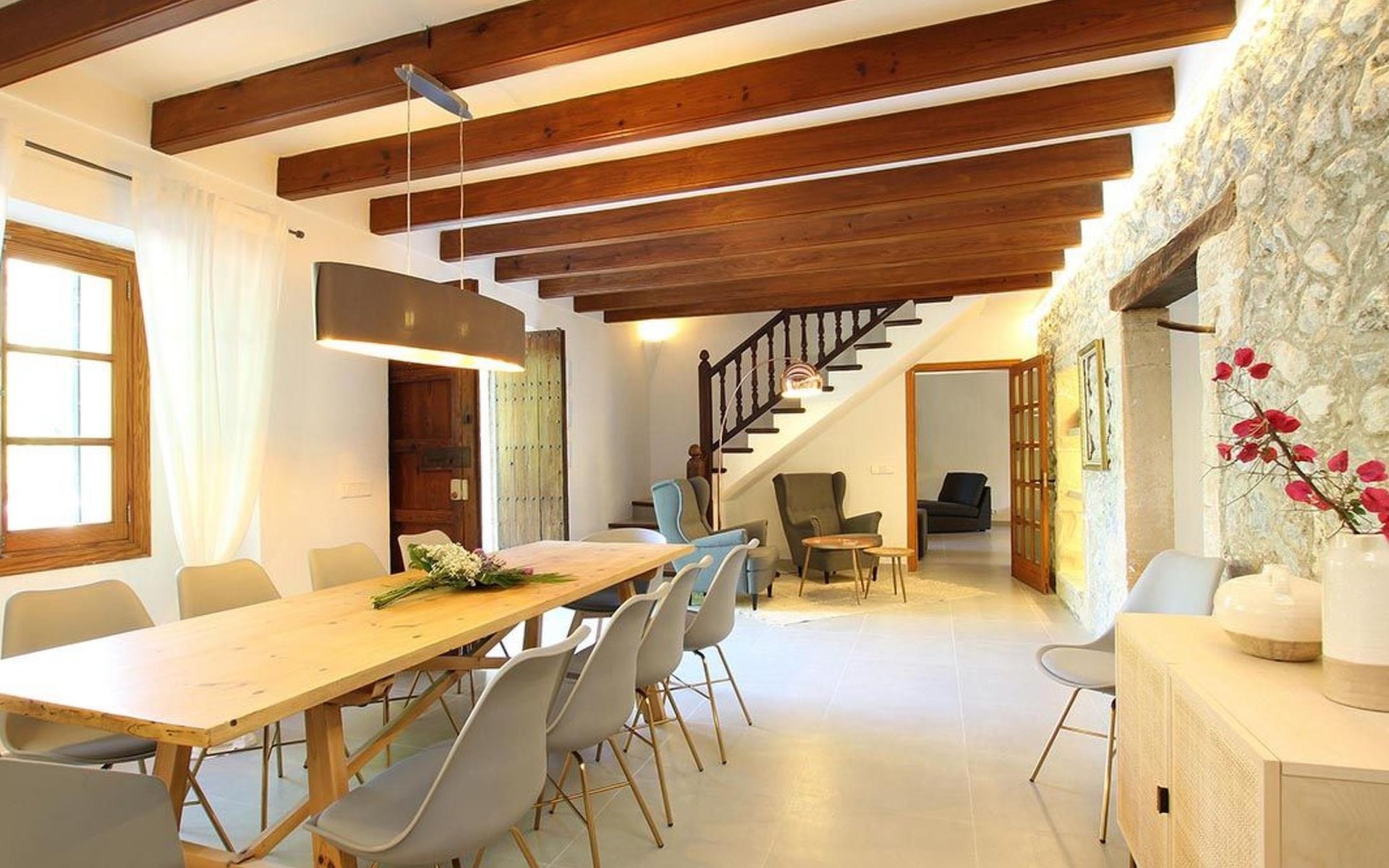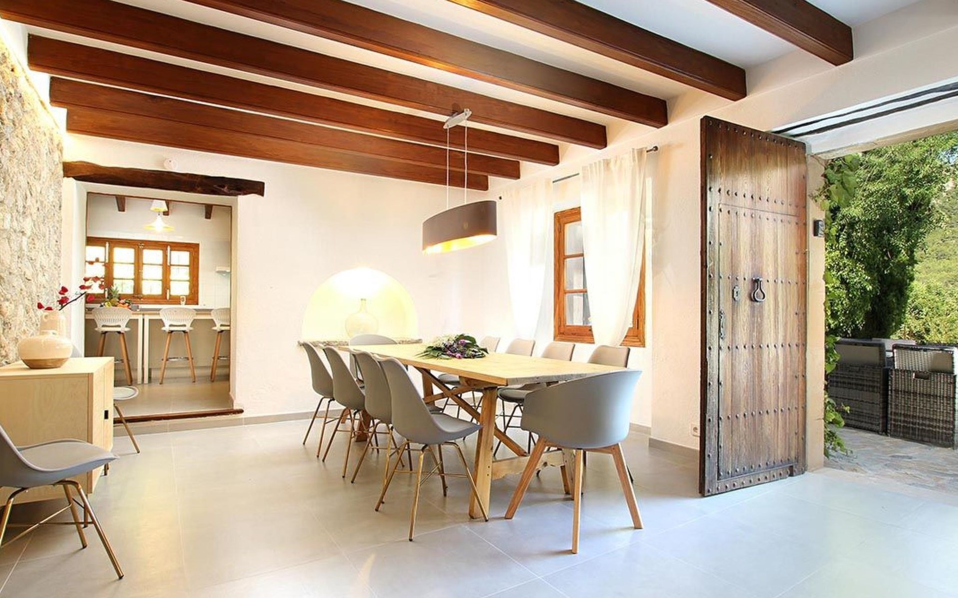 The main entrance of the house gives access to a spacious hallway, equipped with a table and chairs for its function as an indoor dining room. This leads to a large fully equipped kitchen, which still conserves the old fireplace (currently disabled) typical of the old Mallorcan houses.