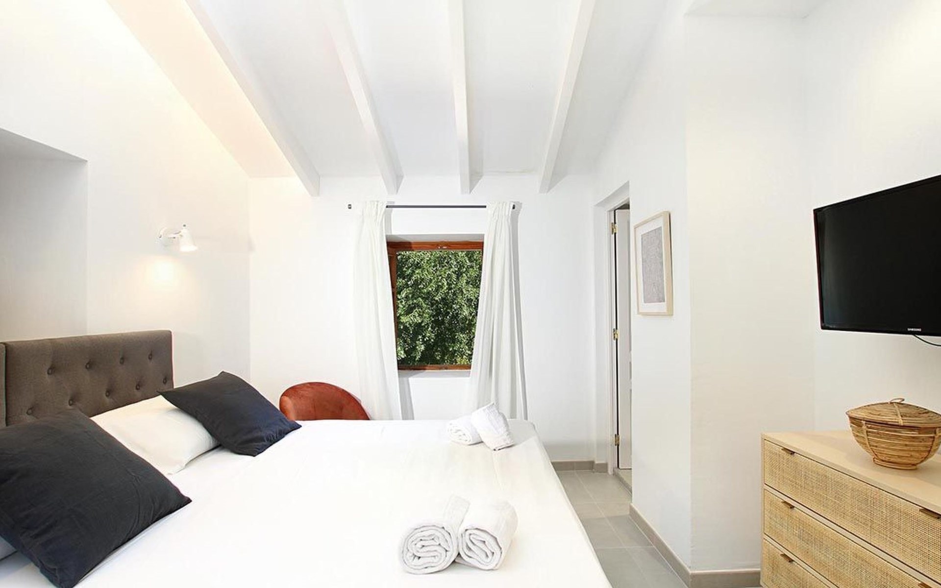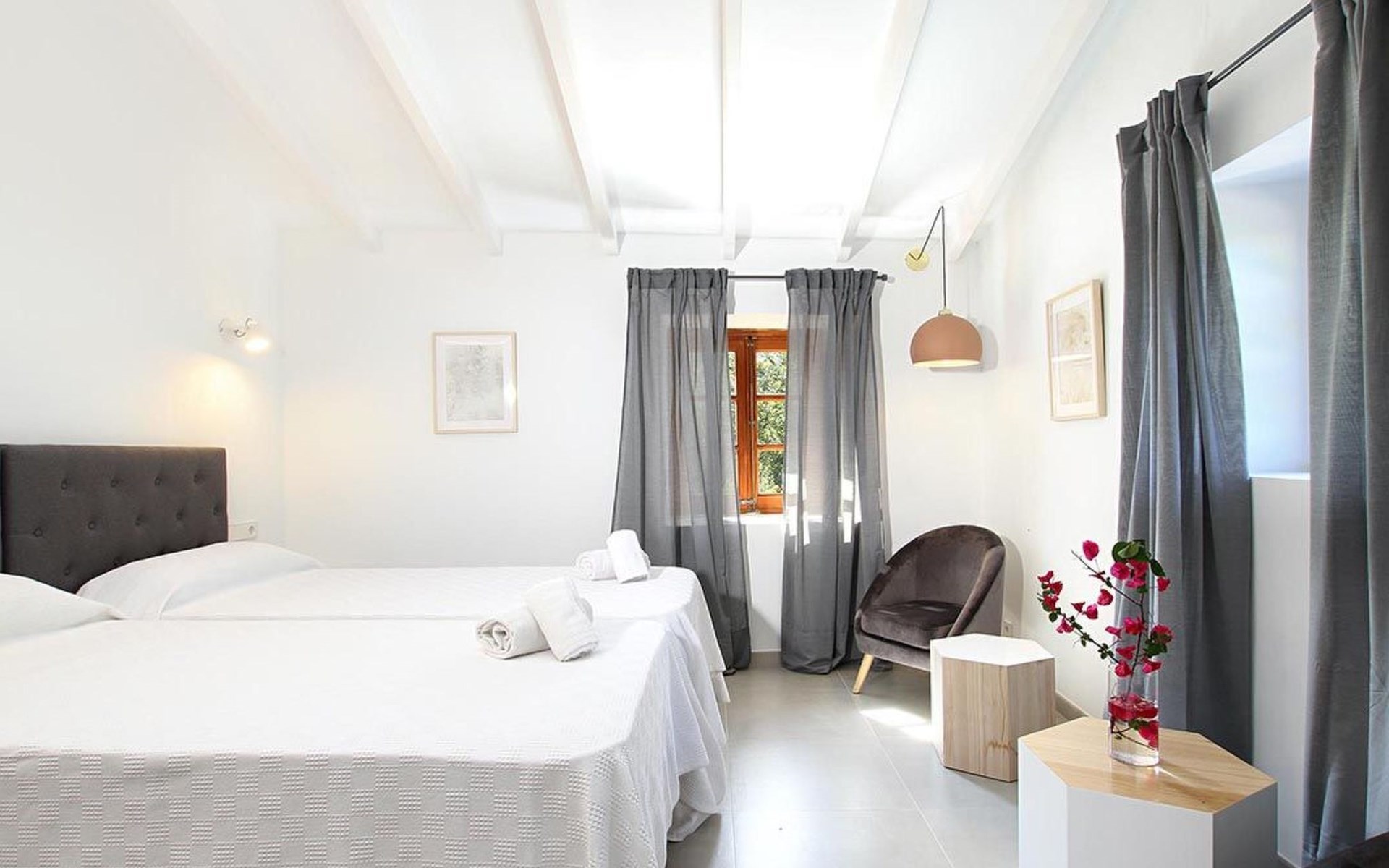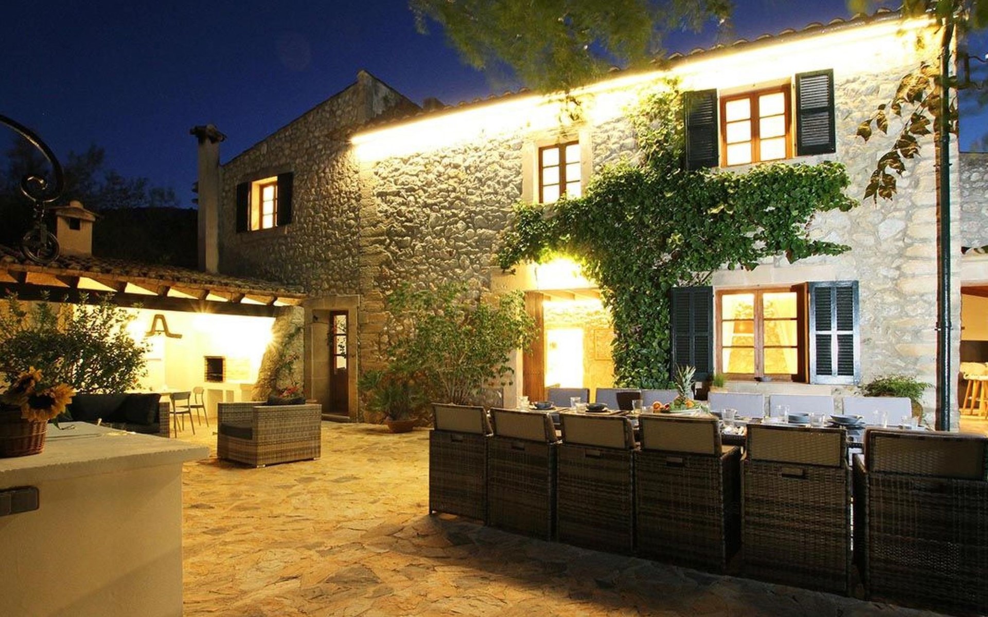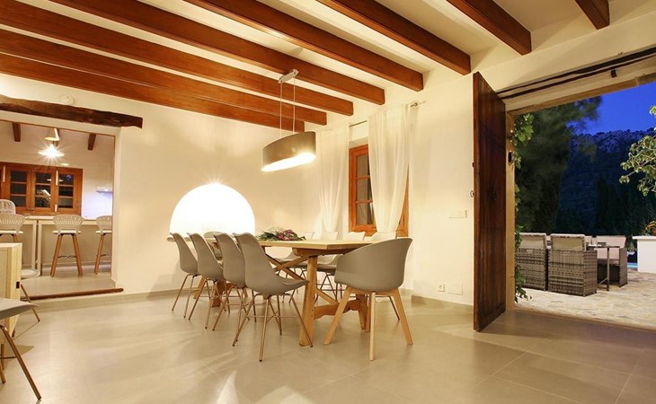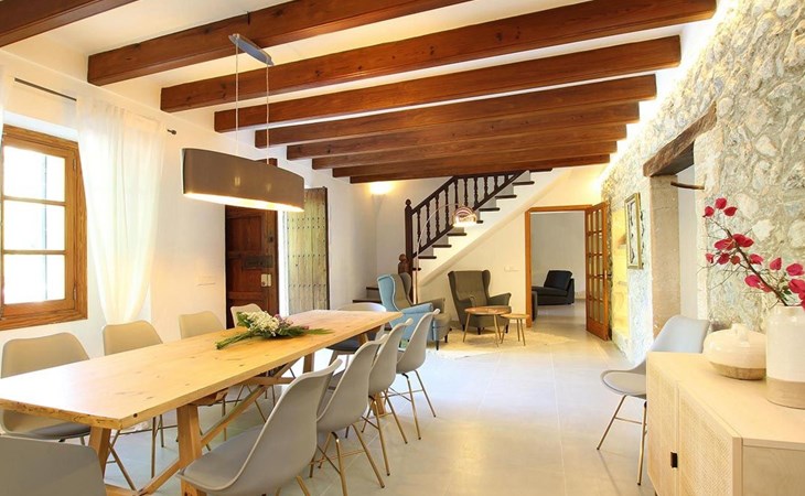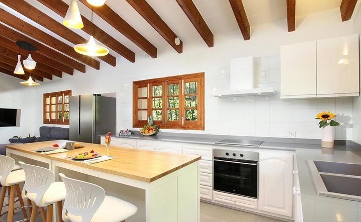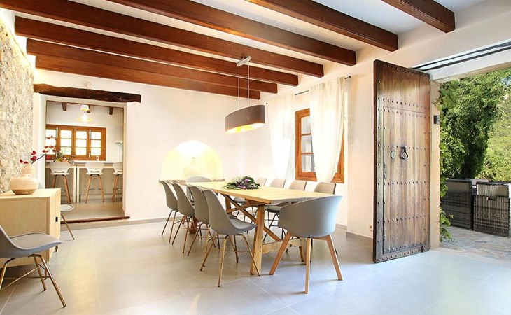 The main entrance of the house gives access to a spacious hallway, equipped with a table and chairs for its function as an indoor dining room. This leads to a large fully equipped kitchen, which still conserves the old fireplace (currently disabled) typical of the old Mallorcan houses.