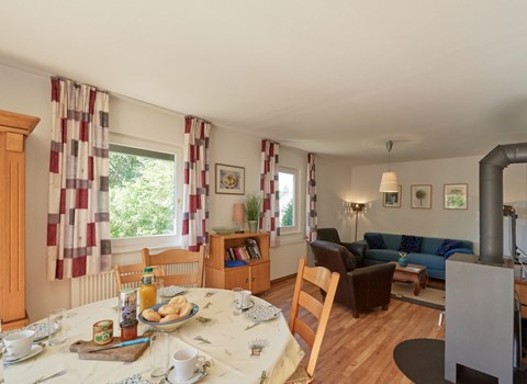 on the upper floor, modern furnished living room with spacious dining area, satellite TV, flat screen, CD radio. 3 bedrooms (6 beds). Fully equipped kitchen (electric cooker with oven, fridge with freezer compartment, coffee machine, toaster, etc.). 2 shower rooms-WC. Heating. Balcony, barbecue area. Garden furniture. Car parking space, lockable ski/bike room, living area approx. 56 sqm.