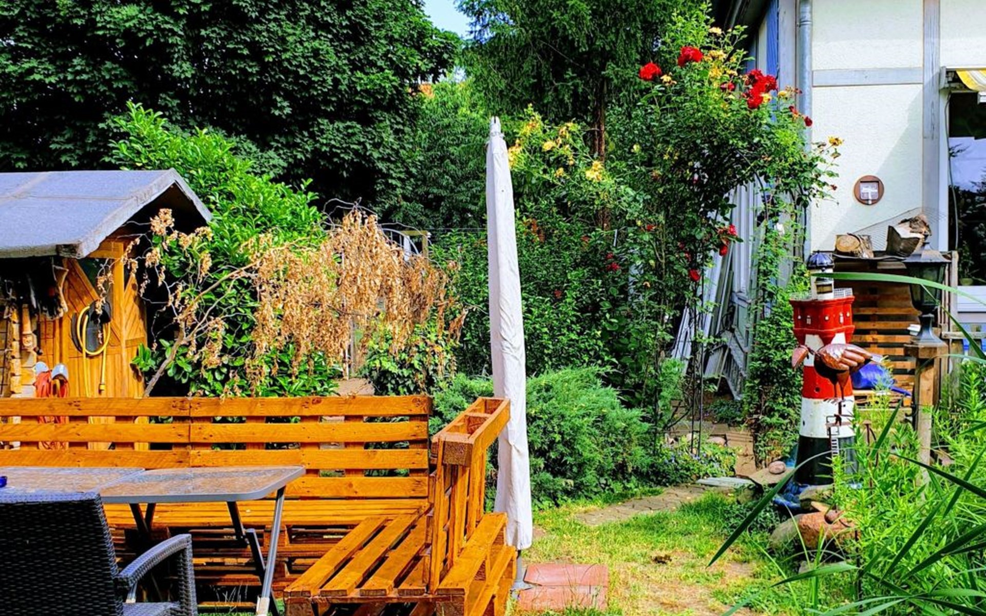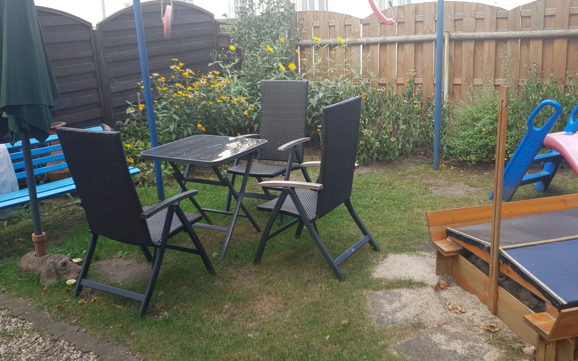 Outside, you will find a natural garden on a secluded plot that invites you to linger. The garden also has a sandpit, swing and slide for our younger guests, who can play safely here. A car parking space on the property provides convenience for your arrival.