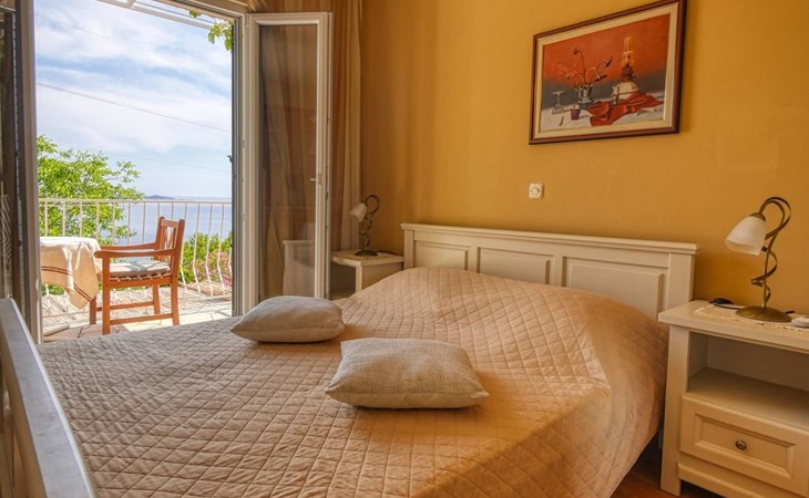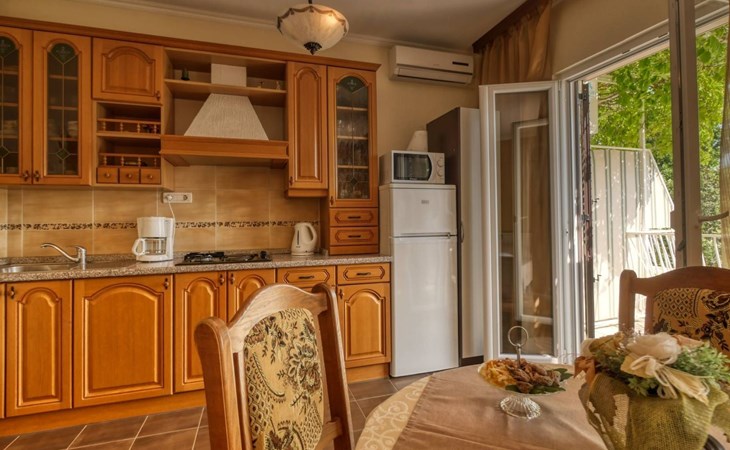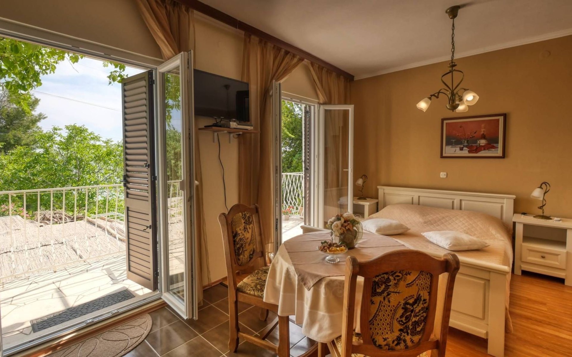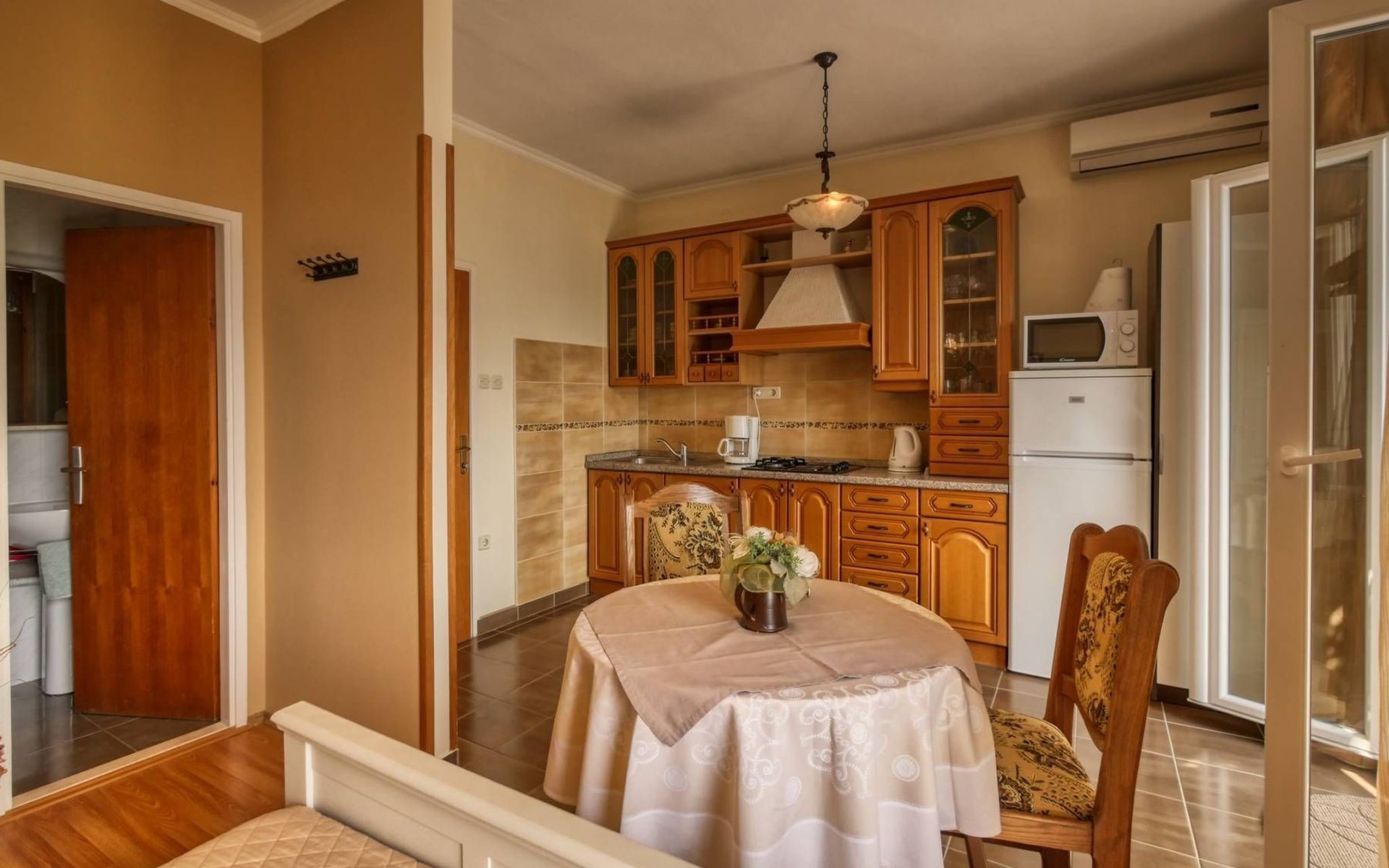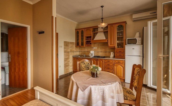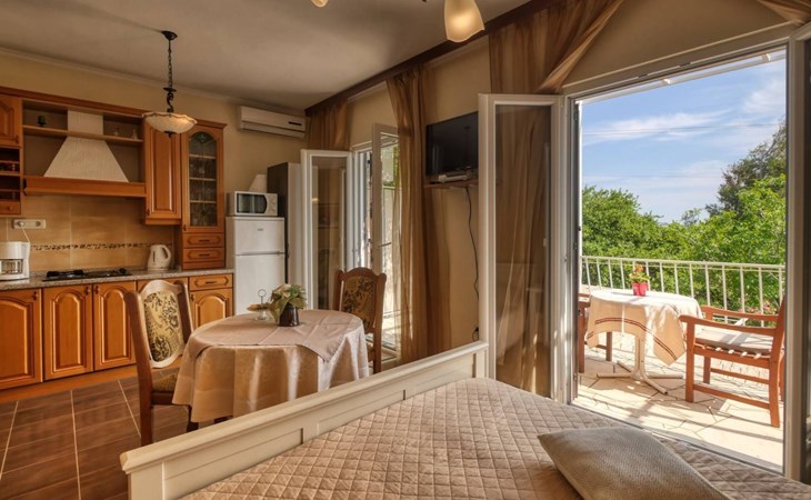 The interior of our studio apartment caters to every comfort of home, blending functionality with cosy elegance. It is fully furnished to accommodate 2 guests, featuring a large, combined bedroom and dining room adorned with a kitchen. For your convenience, the apartment includes a modern bathroom, ensuring your stay is as comfortable and relaxing as possible. Equipped with air conditioning, satellite TV, and Wi-Fi, our studio promises a serene and connected stay, complemented by a private balcony that offers breathtaking sea views.