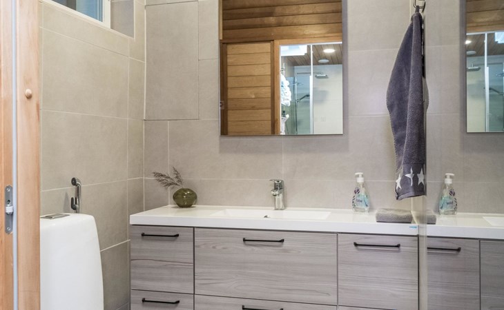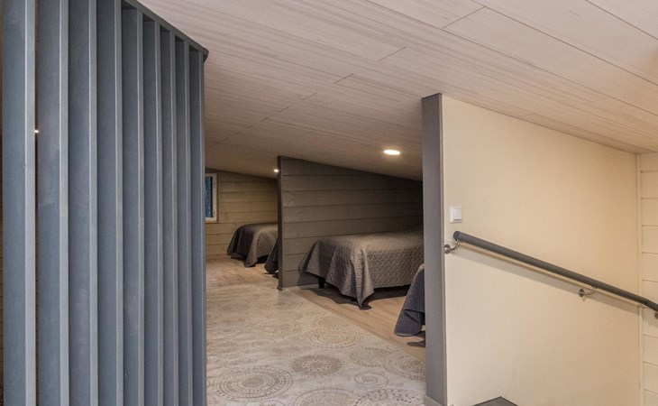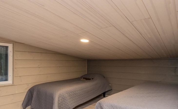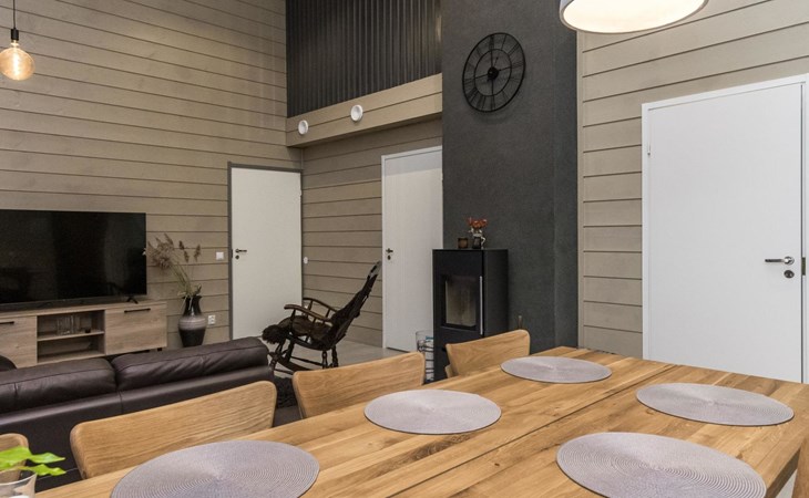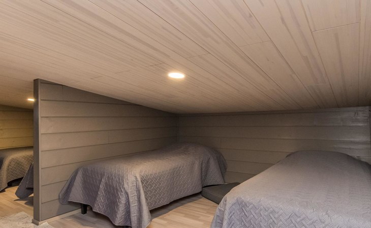Wooden villa 2023, 160 m² spacious living room, kitchen, two bedrooms, both with double beds. Upstairs bedroom with double bed, loft with two sleeping alcoves (no curtains) with two beds each and a toilet.