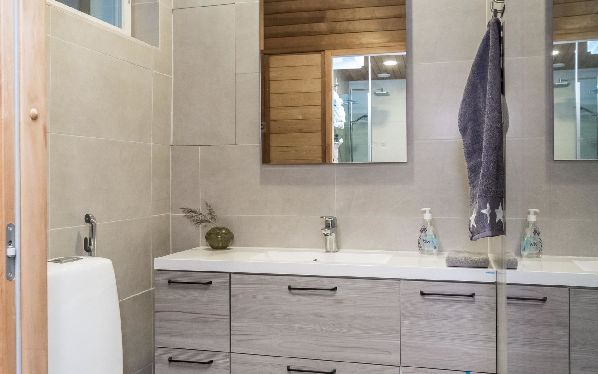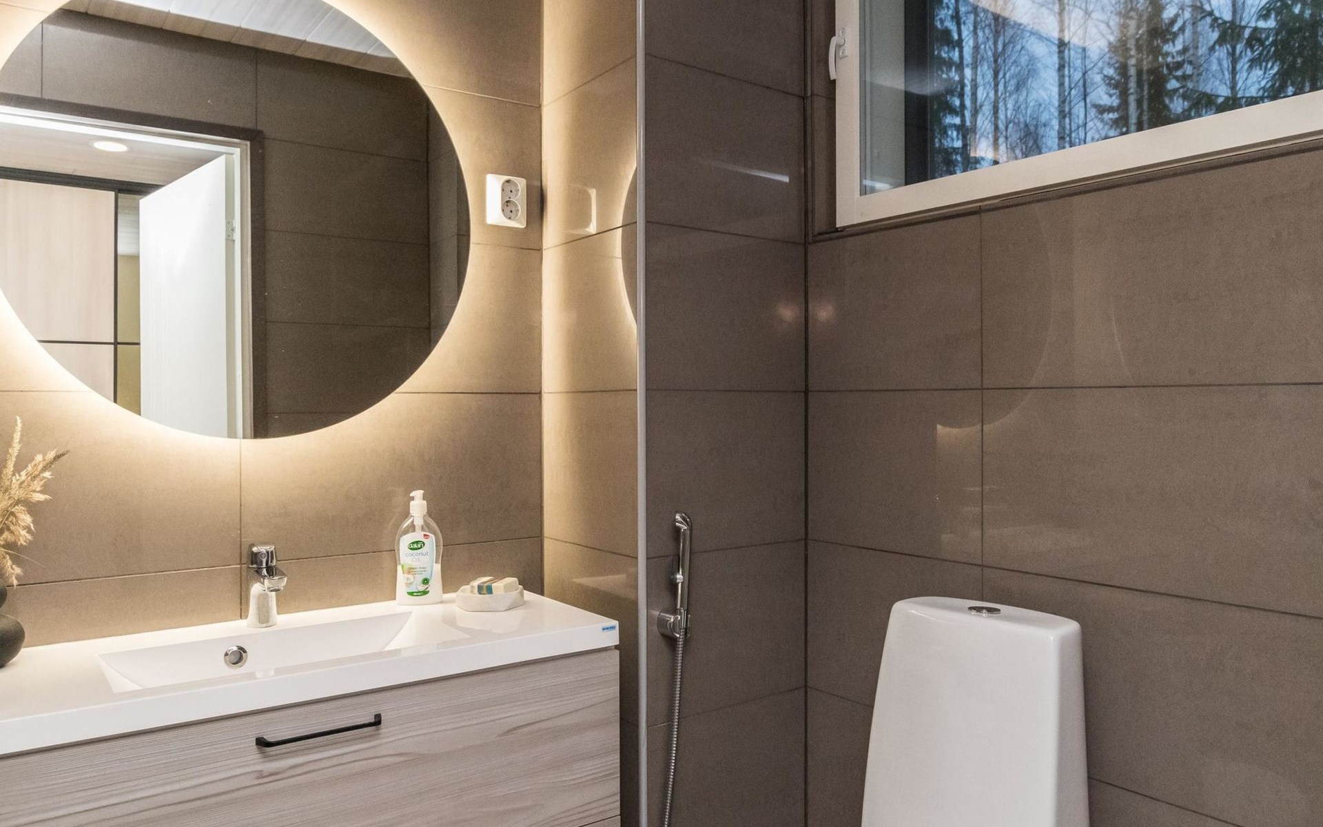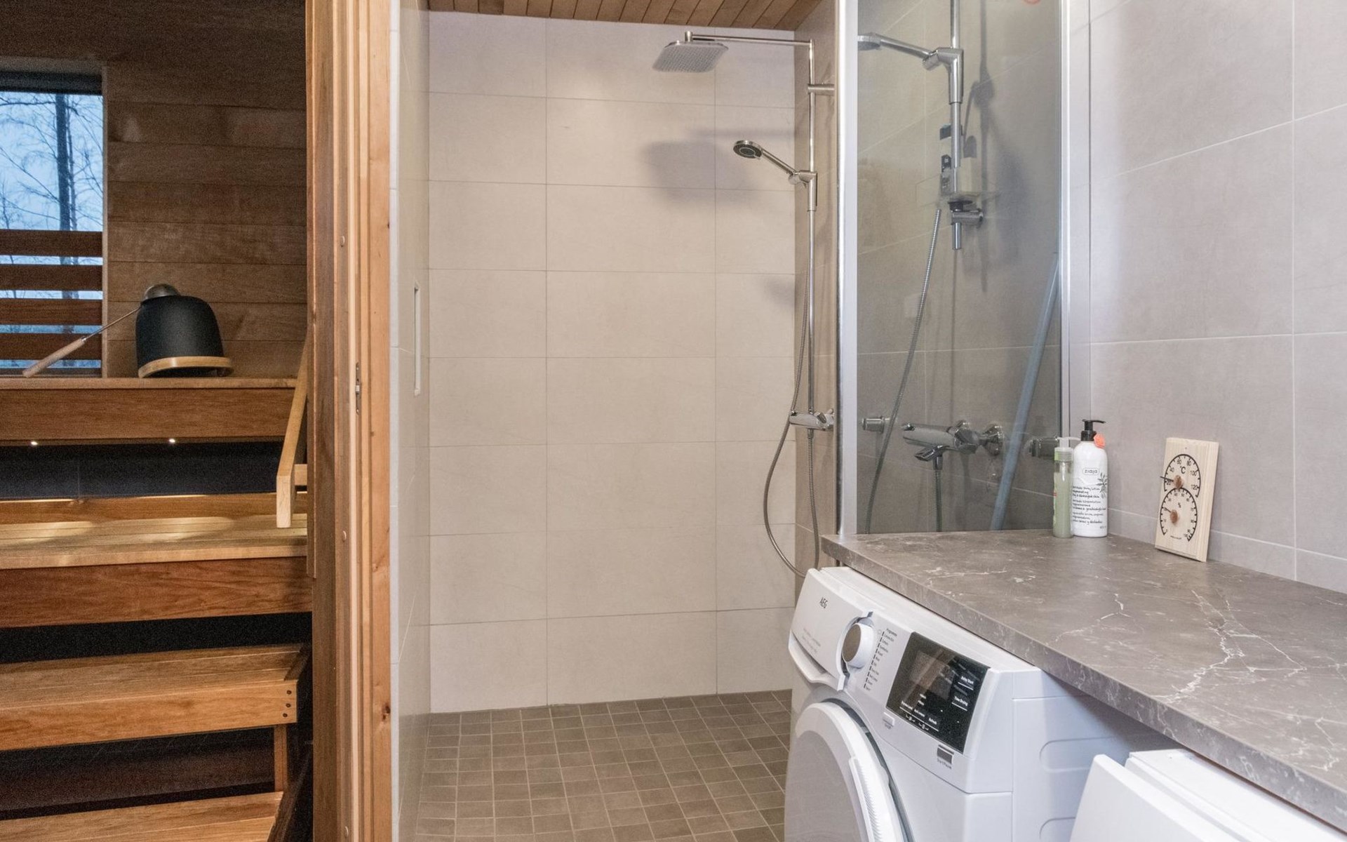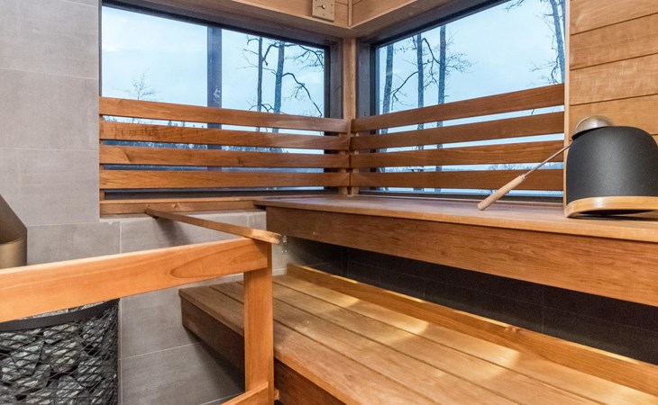 Sauna area with dressing room/sauna room, toilet, bathroom, wood stove in the sauna, hot tub on the terrace.