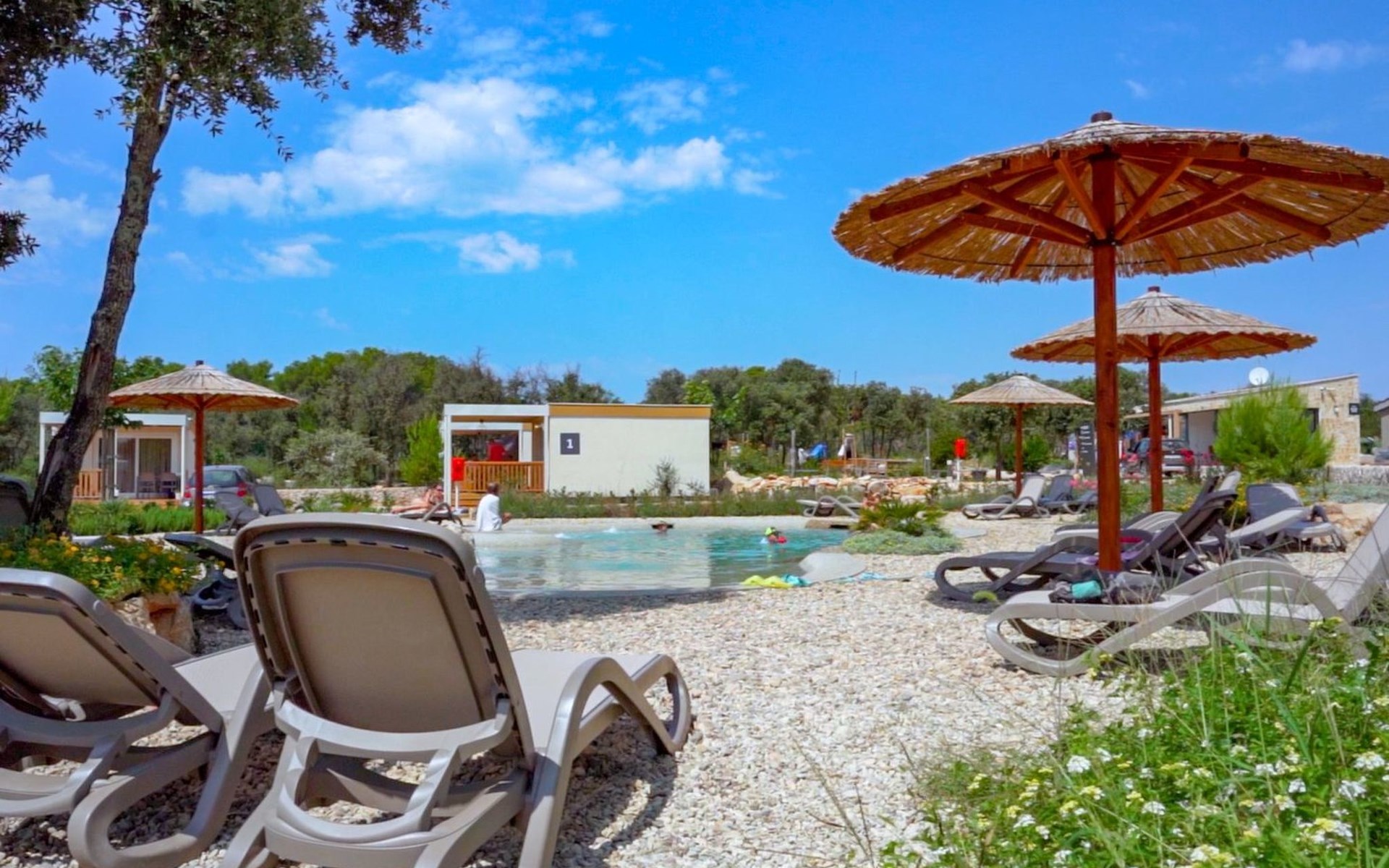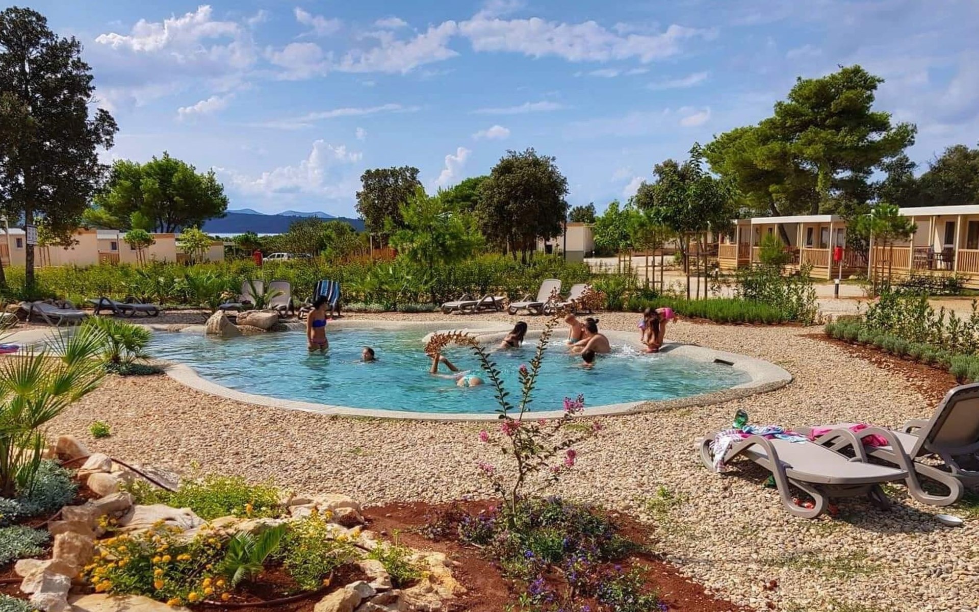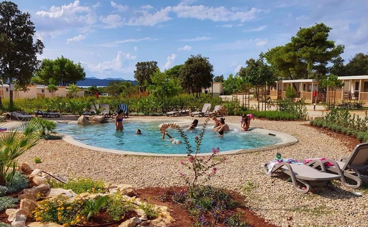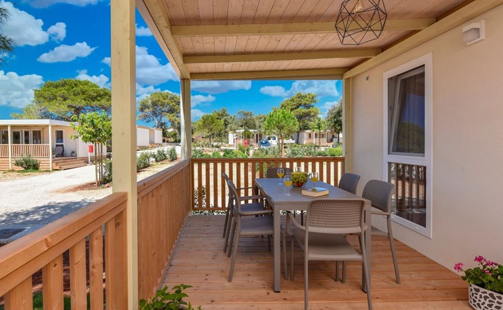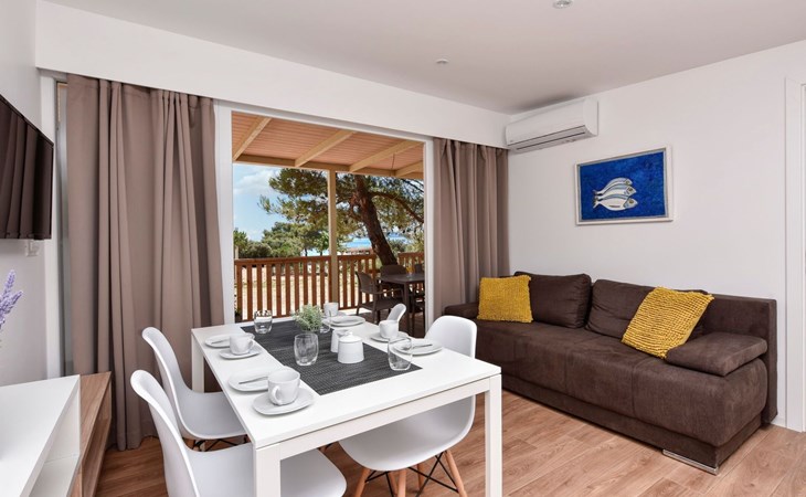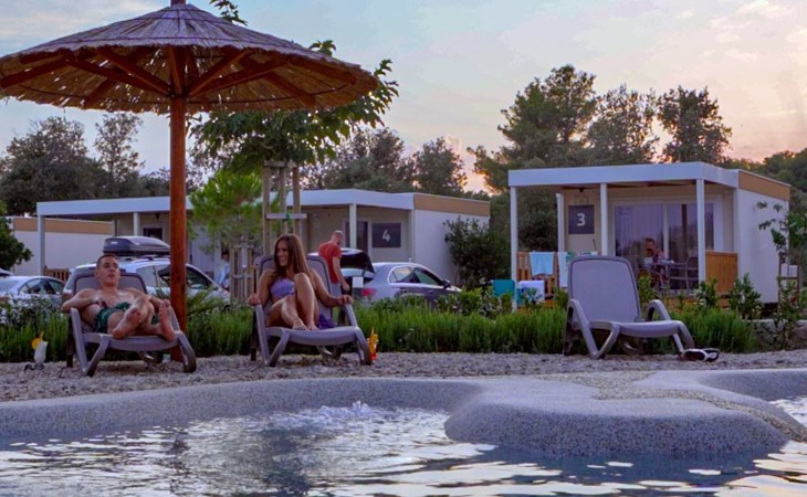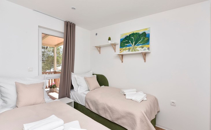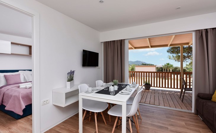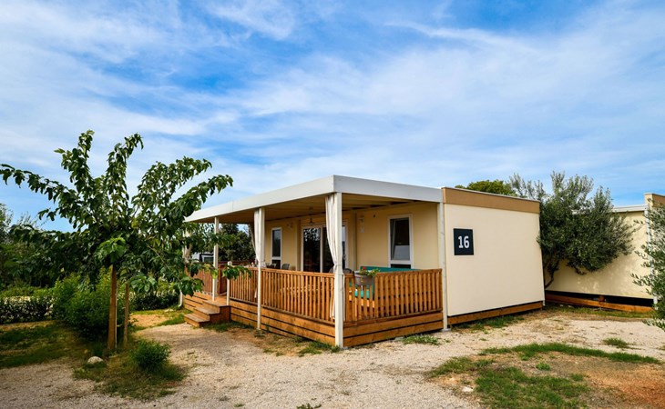 Mobile homes are situated in 4* Camping Ugljan Resort in quite area on sooth west part of Island Ugljan. Mobile homes are situated 10-80 m from the heated outdoor pool and 10-110 m from the beach. Each mobile home has 40 m2 with additional 30 m2 covered terrace and they have 3 bedrooms (one with queen bed and two with 2 single beds) and 2 bathrooms plus sofa in the leaving room- total 6 + 2 beds.