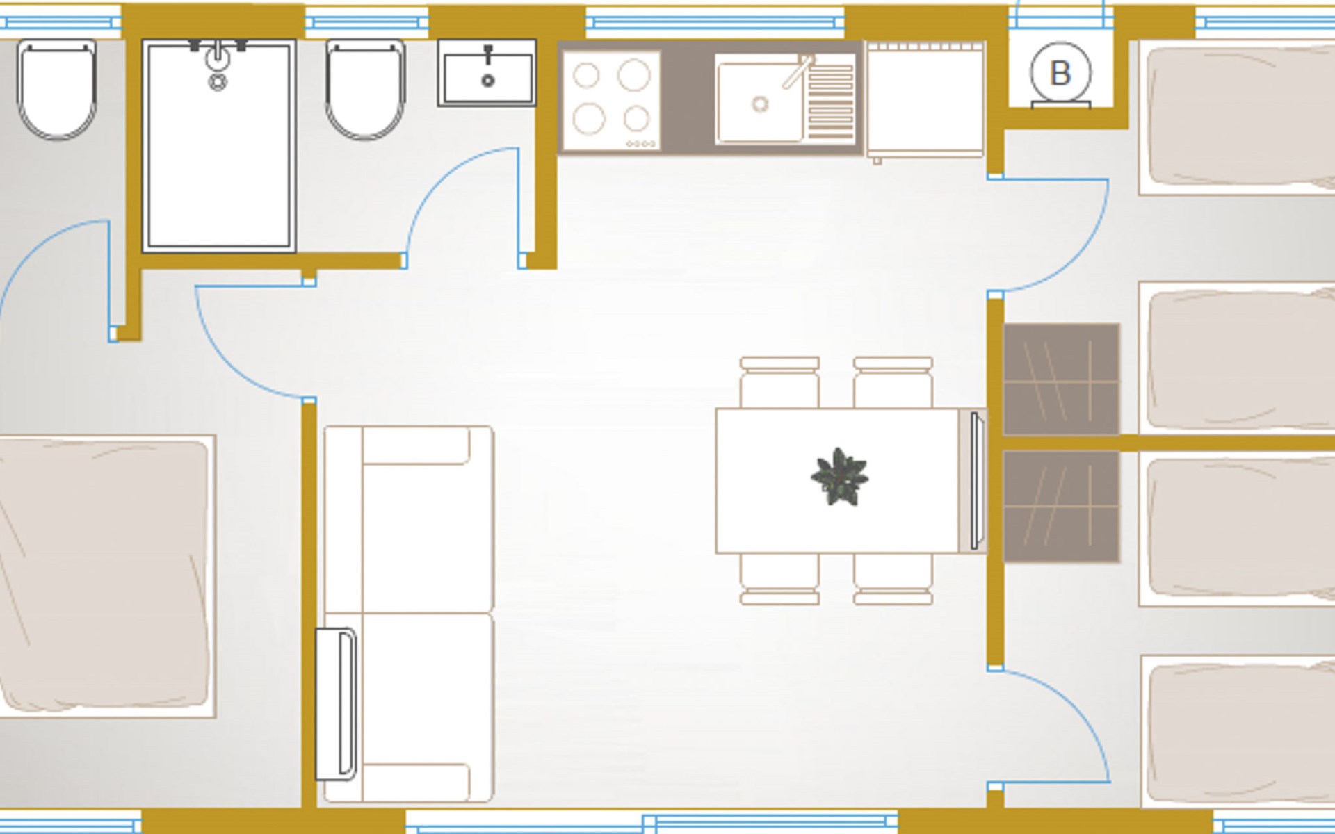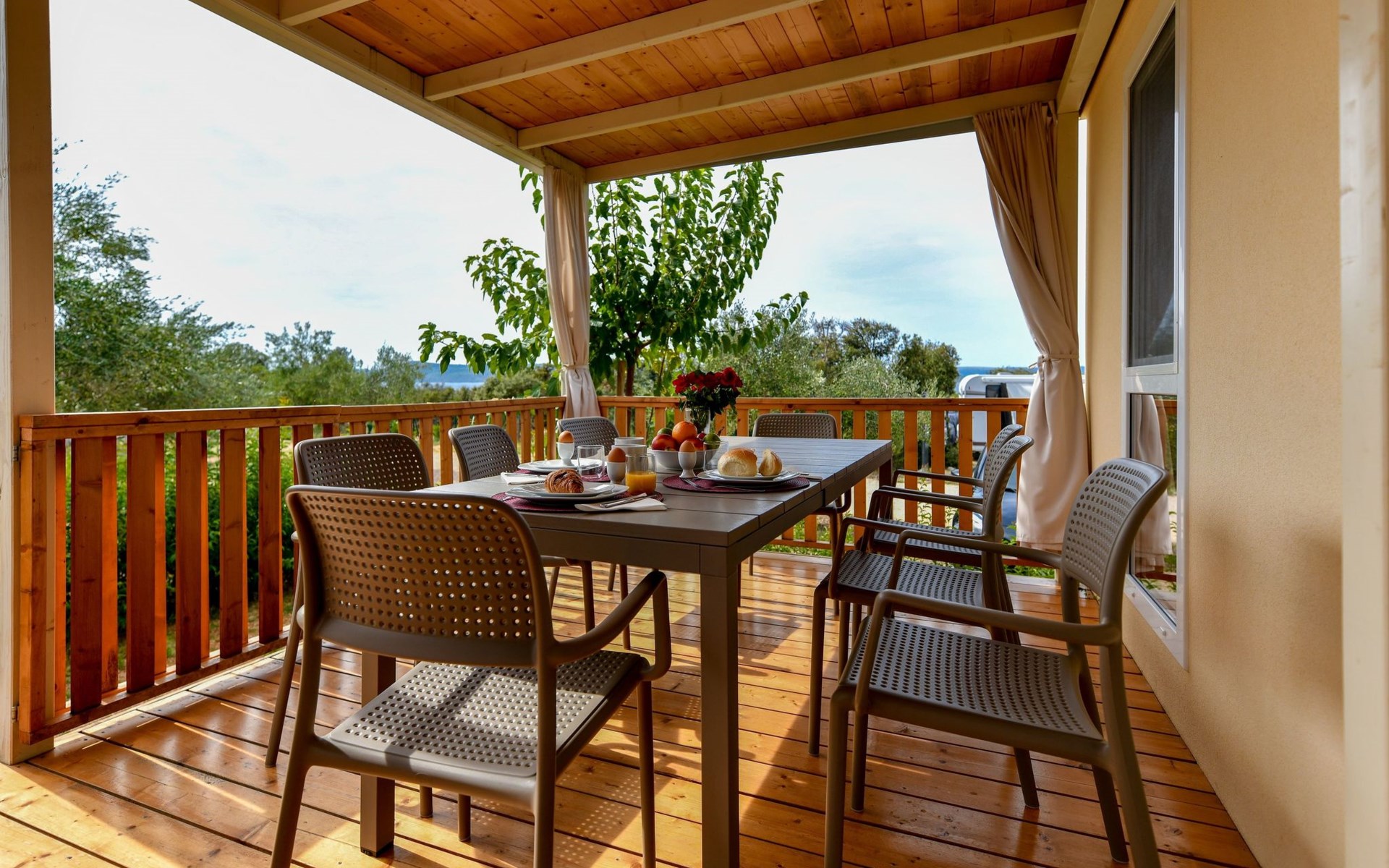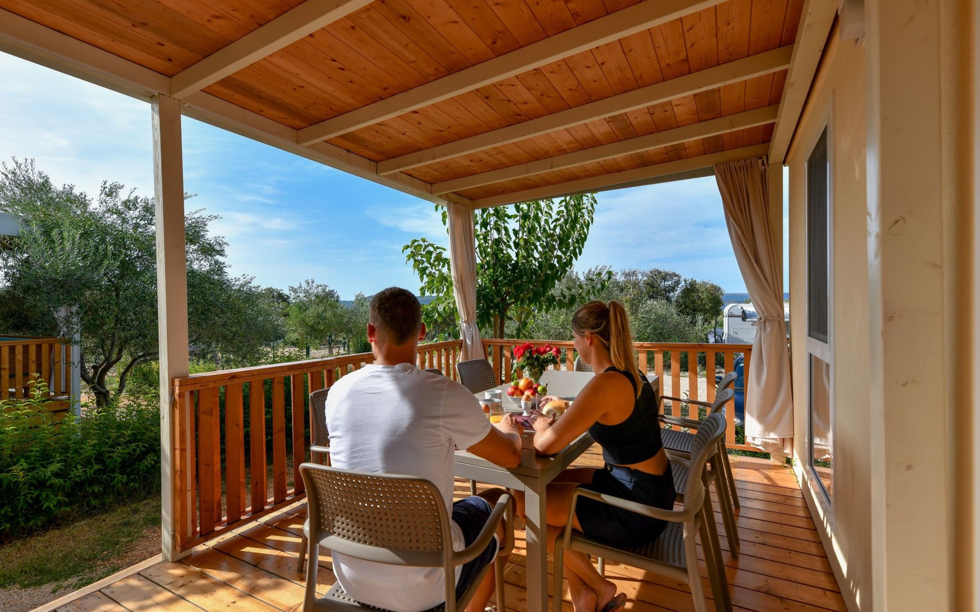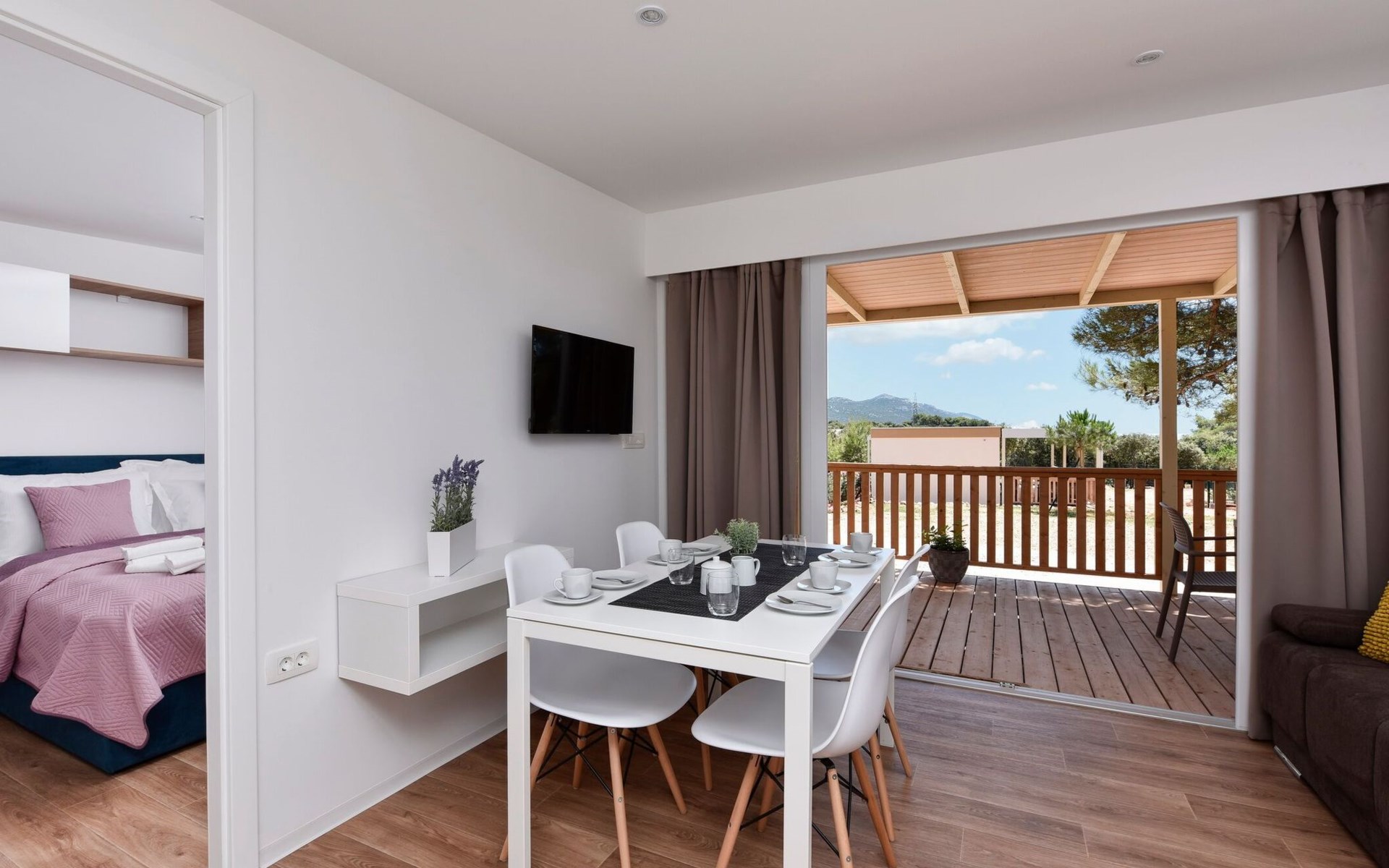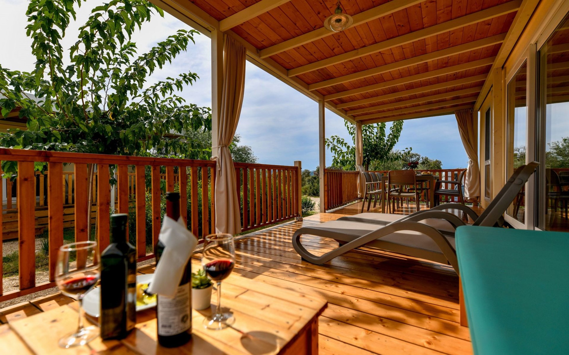 Mobile homes are situated in 4* Camping Ugljan Resort in quite area on sooth west part of Island Ugljan. Mobile homes are situated 10-80 m from the heated outdoor pool and 10-110 m from the beach. Each mobile home has 40 m2 with additional 30 m2 covered terrace and they have 3 bedrooms (one with queen bed and two with 2 single beds) and 2 bathrooms plus sofa in the leaving room- total 6 + 2 beds.