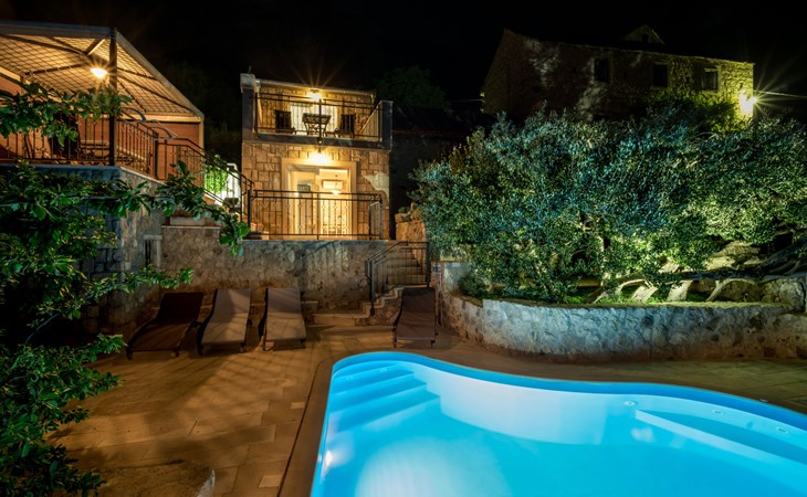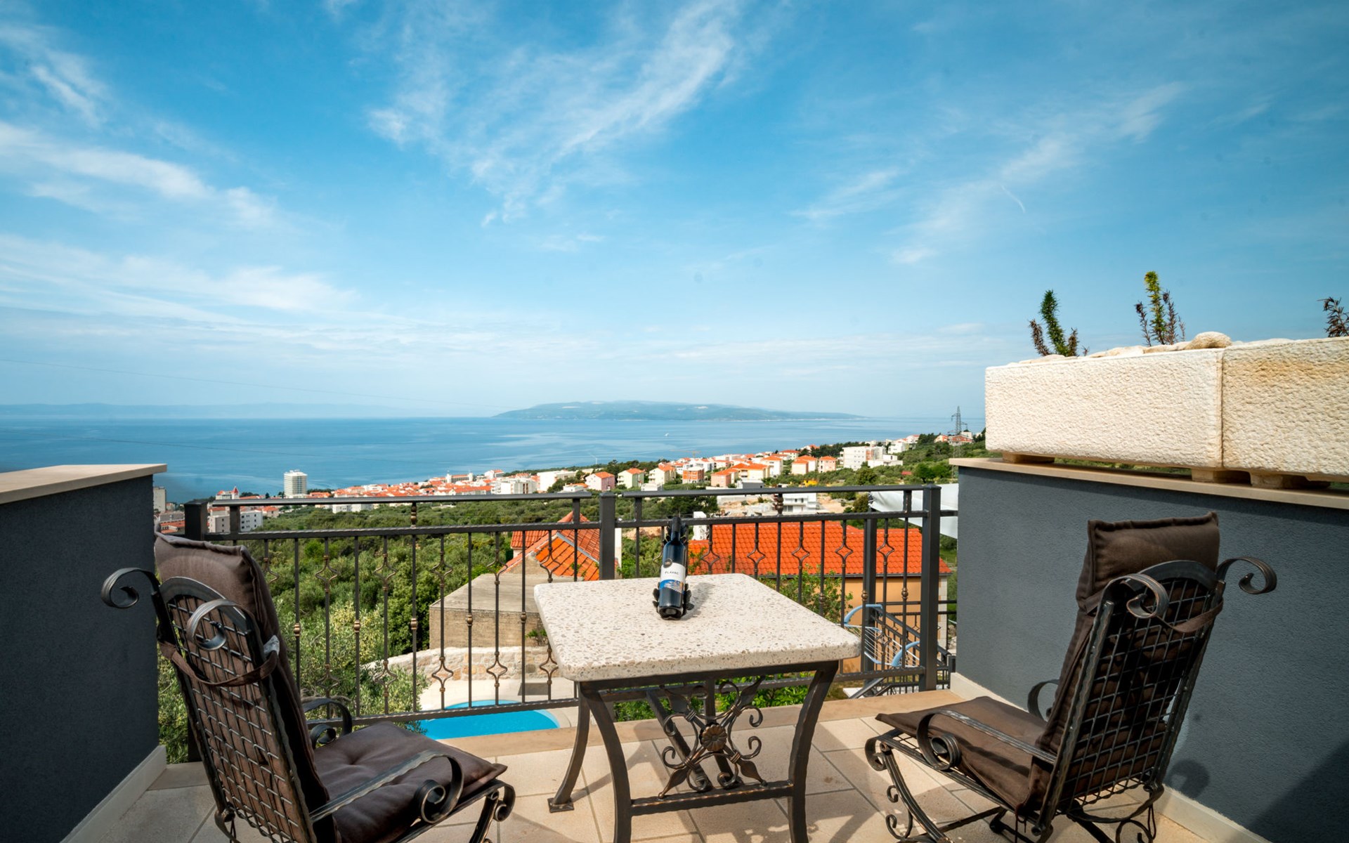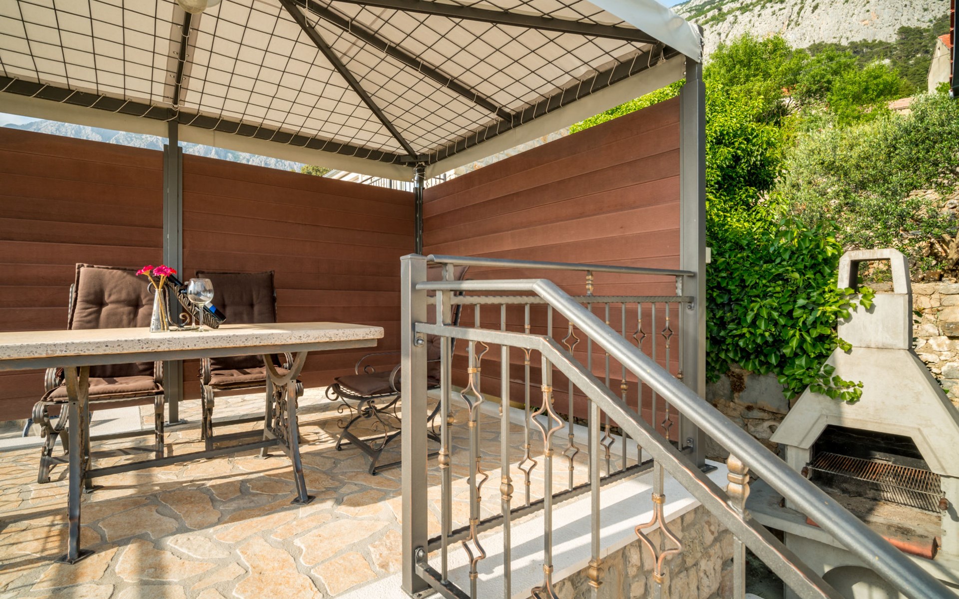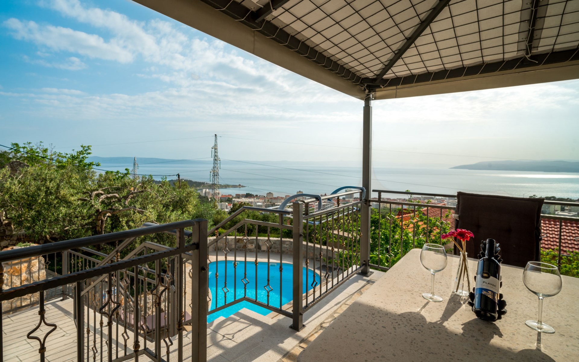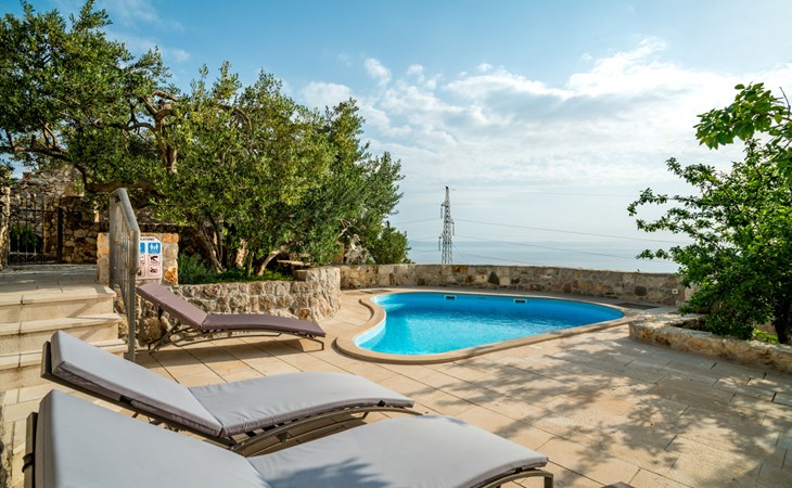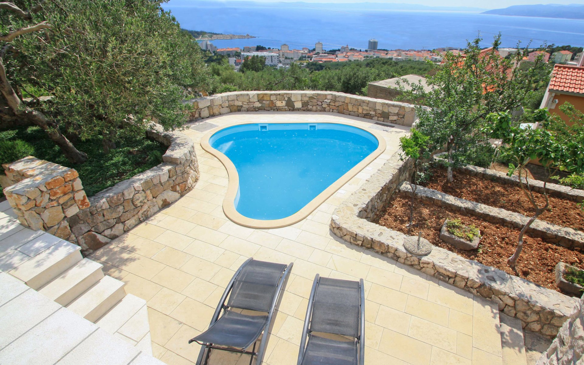 Single-family house "Belvedere", 2 storeys. Above Makarska, in the hamlet Puharići 1.5 km from the centre of Makarska, in a quiet, sunny position on a slope, 1.5 km from the sea, 1.5 km from the beach. Private: property 400 m2 (fenced), swimming pool kidney shaped, heated (6 x 5 m, depth 150 cm, seasonal availability: 01.Apr. - 31.Oct.) with internal staircase. Outdoor shower, terrace (10 m2), garden furniture, barbecue, pool maintenance by the owner/gardener. In the house: internet access, washing machine. Parking (for 2 cars) on the premises. Shop, restaurant 800 m, bus stop 3.6 km, pebble beach 1.5 km. Outdoor pool with hydromassage. Heating of the water in the swimming pool (extra). It is necessary to announce 7 days in advance if the pool heating is required.