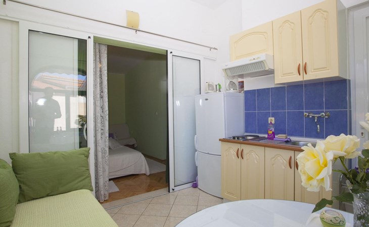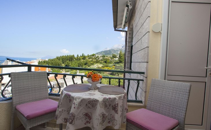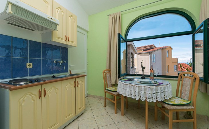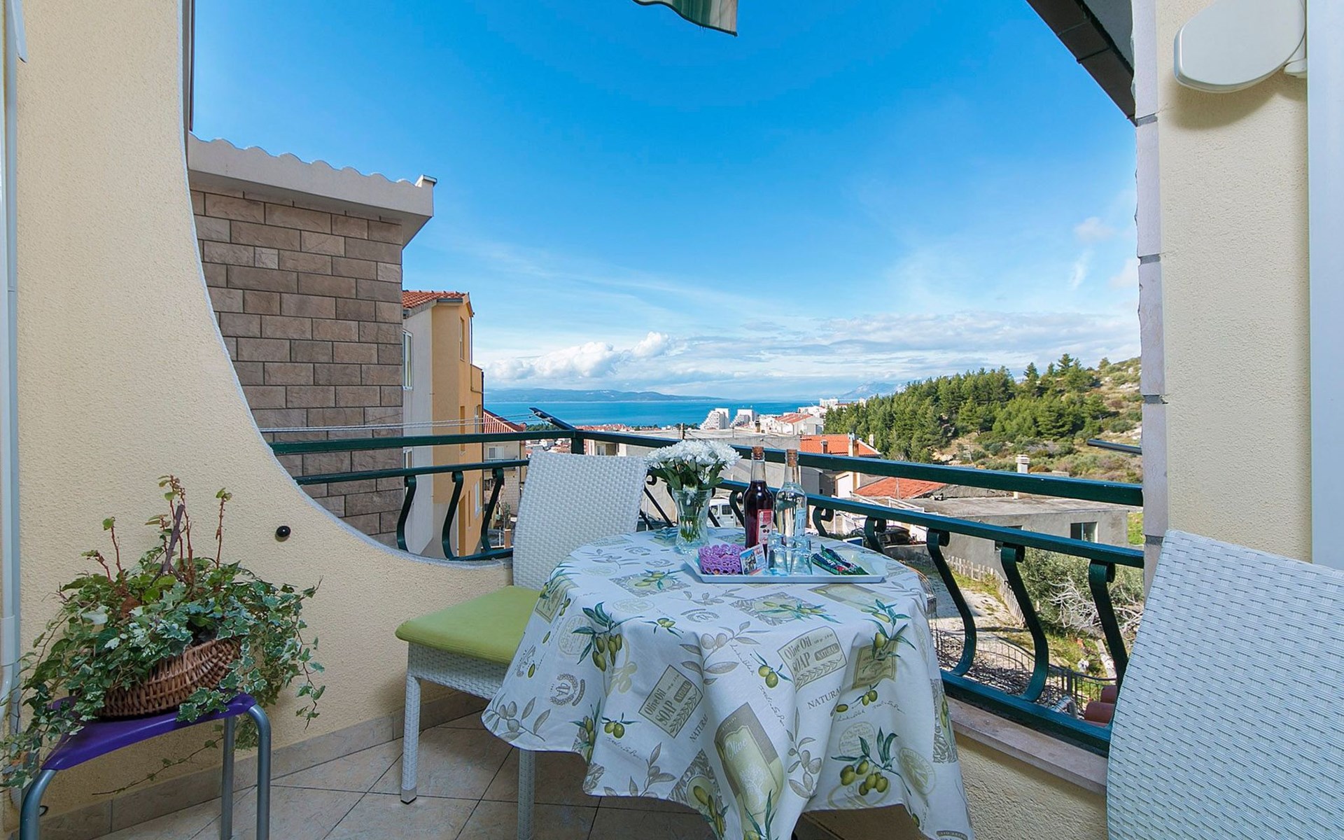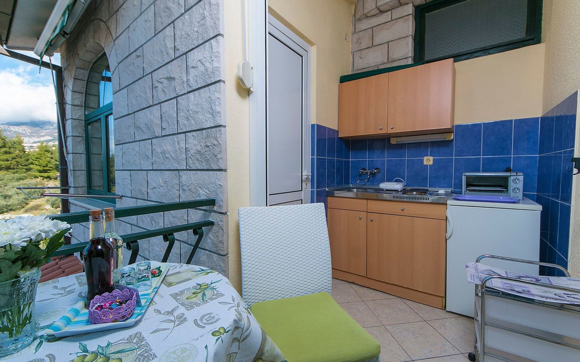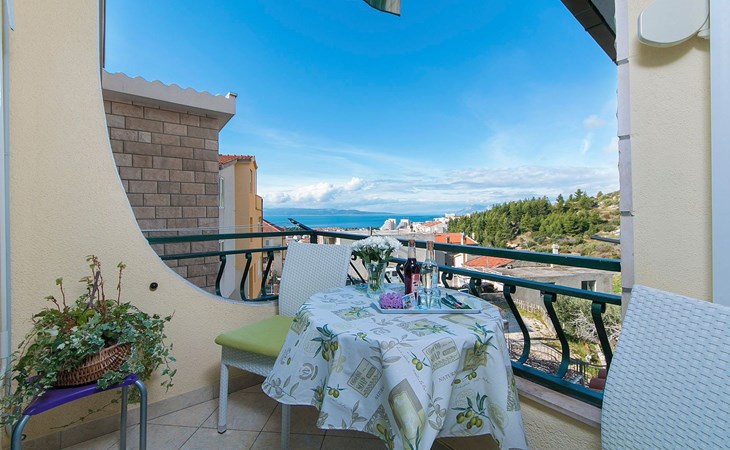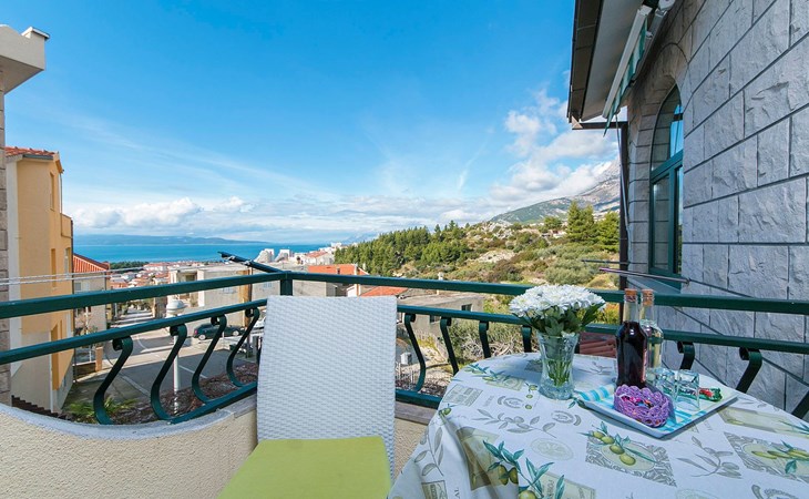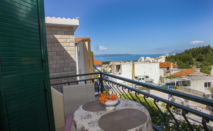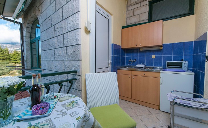 The apartment has a private little balcony with a sea view, furnished with a table and chairs. There is also a little outdoor kitchen with cooking rings, a fridge, sink, coffee machine and kettle. A grill is available for use. There are three parking spaces right by the house and there are also two garage parking spaces in the house.