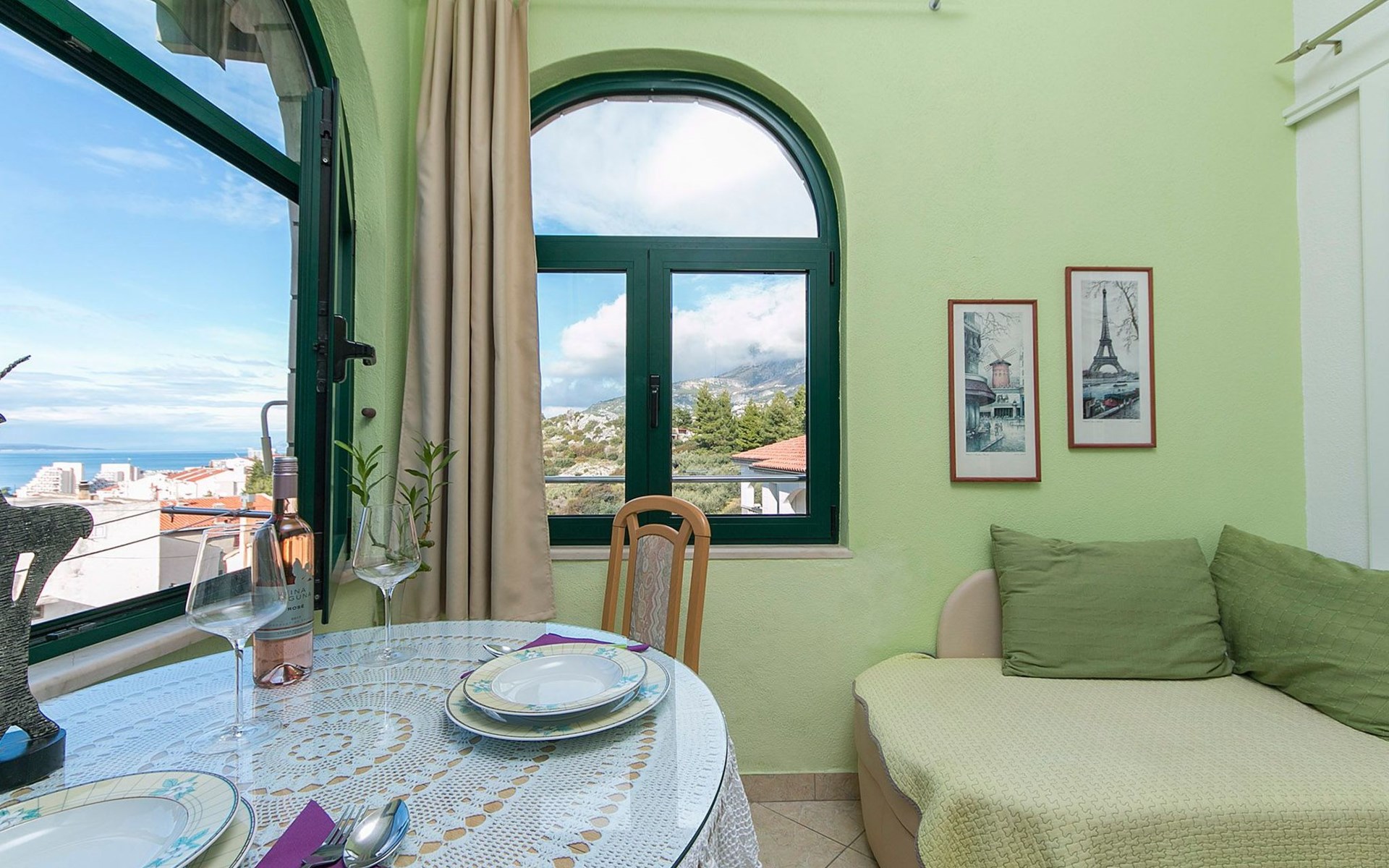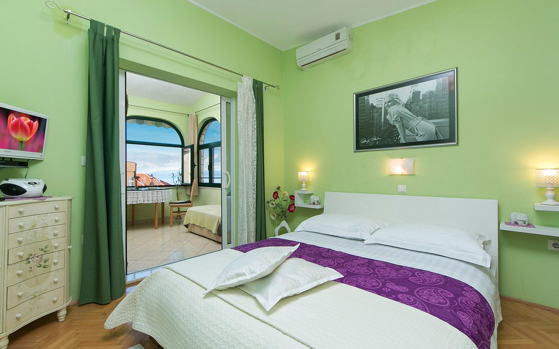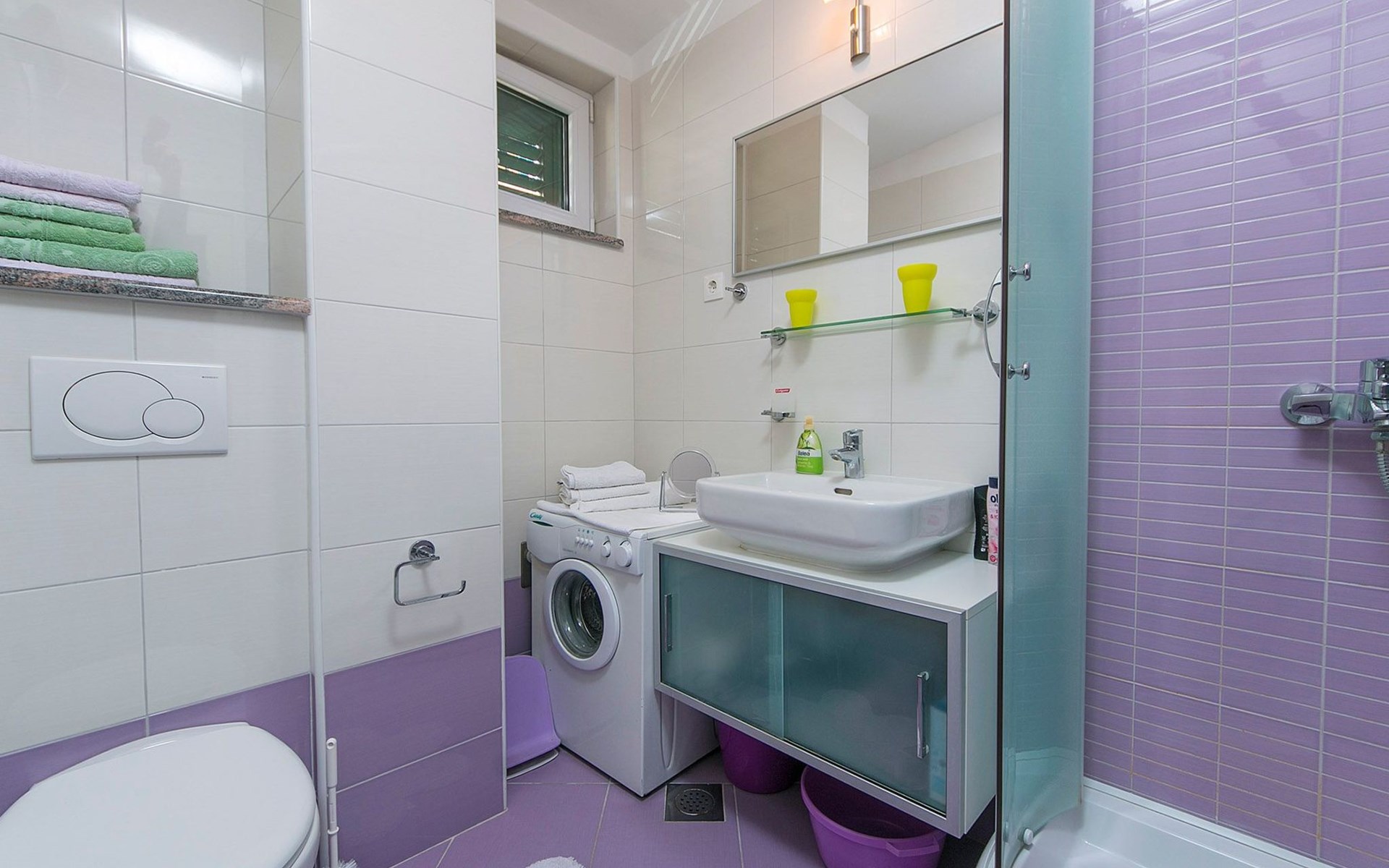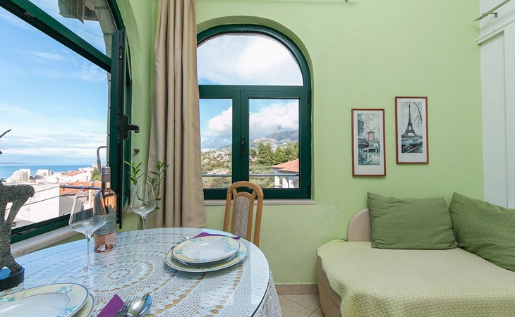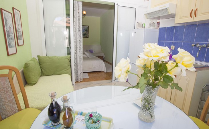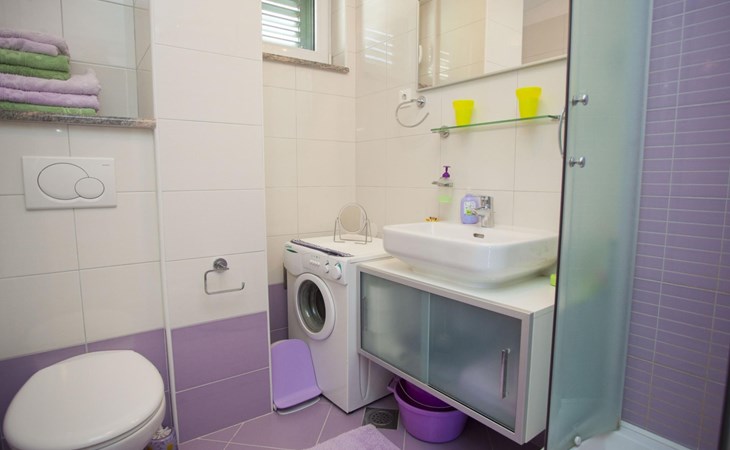 The apartment has a private little balcony with a sea view, furnished with a table and chairs. There is also a little outdoor kitchen with cooking rings, a fridge, sink, coffee machine and kettle. A grill is available for use. There are three parking spaces right by the house and there are also two garage parking spaces in the house.